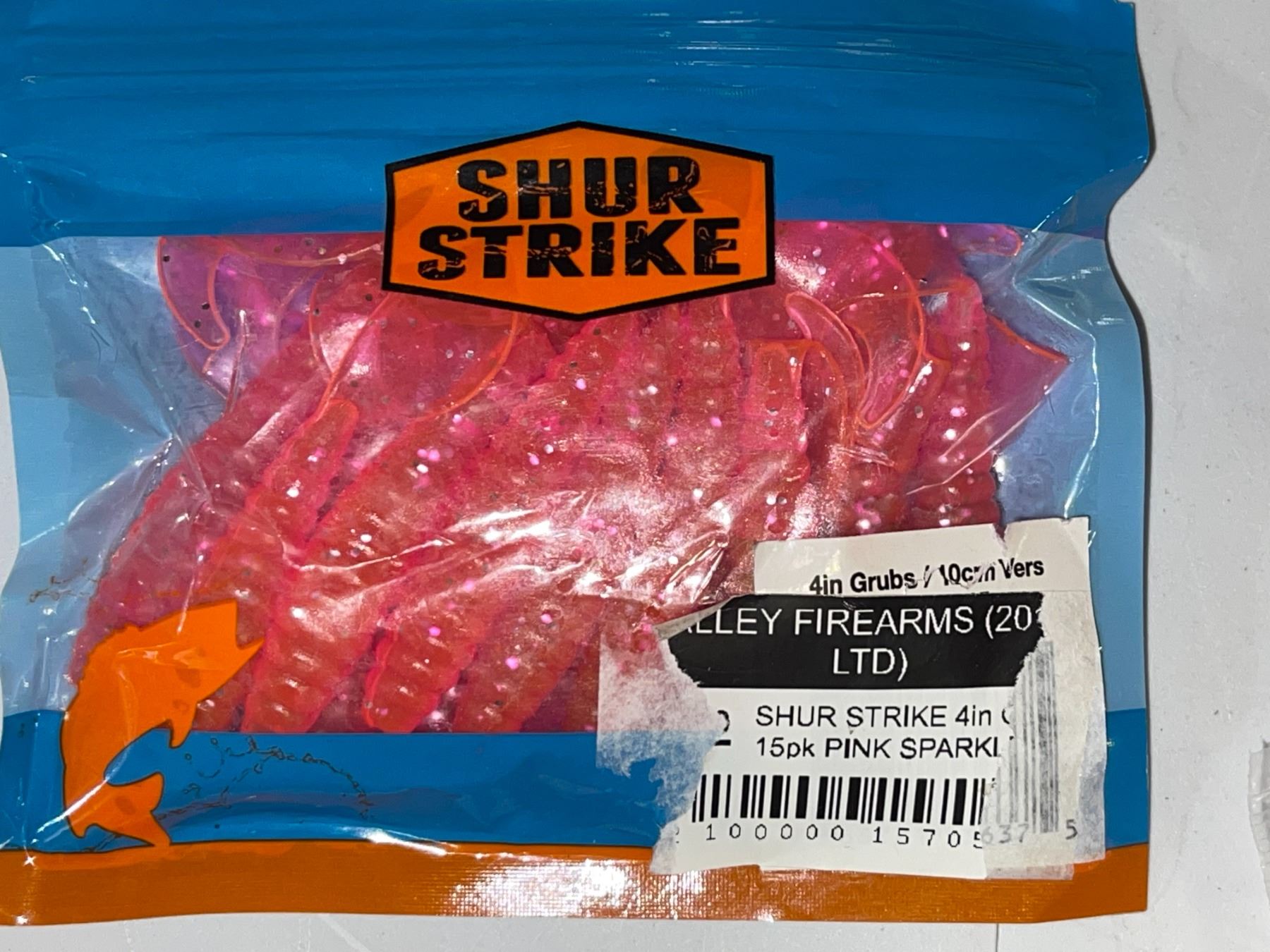 - 1 pk SHUR STRIKE 4in Pink Sparkle grubs 15pk