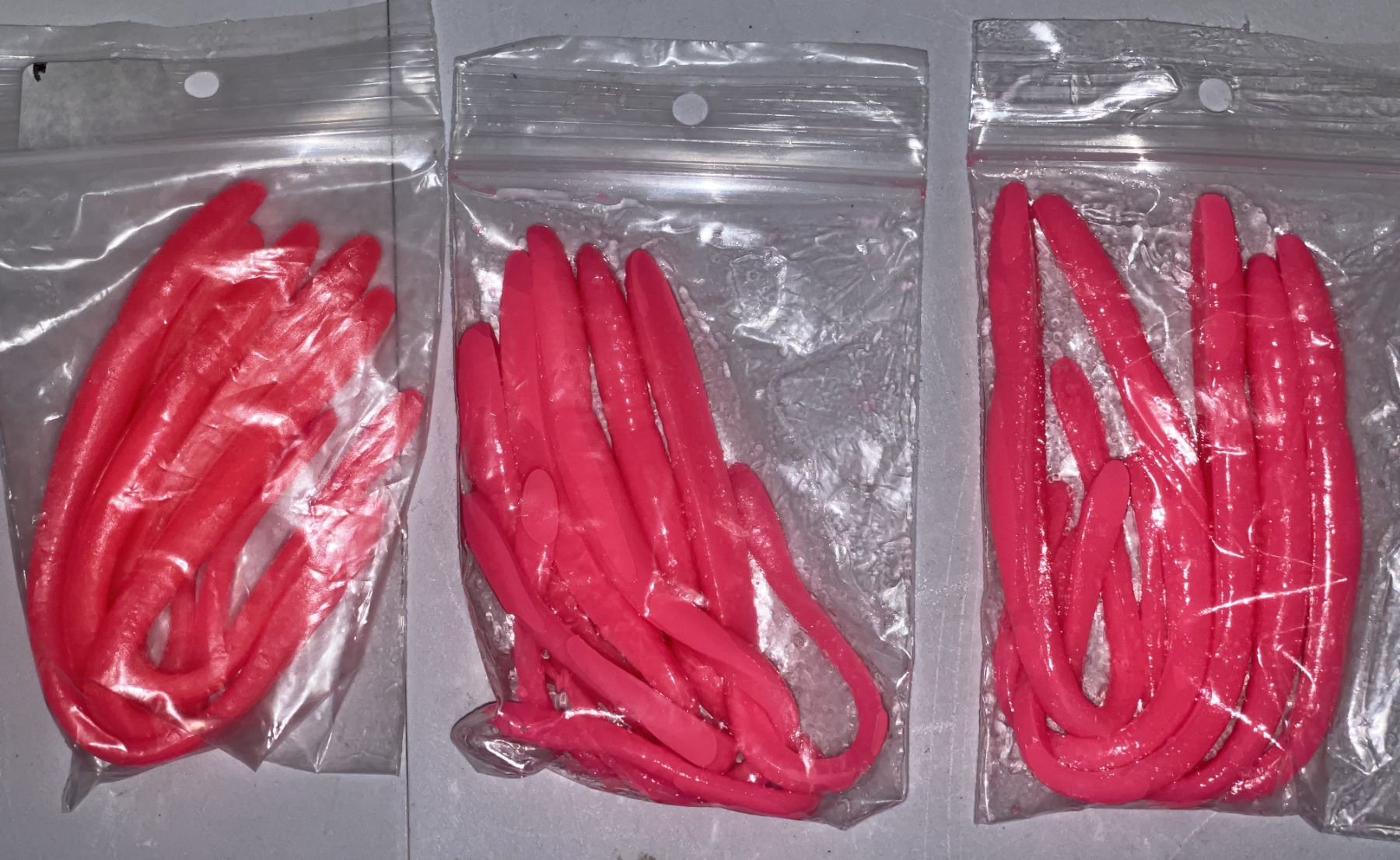 - 3 pks HAWKEYE Pink rubber worms 5pk (1pk Hot Gum, 2pks Bubblegum)