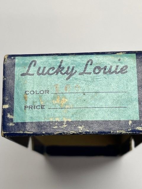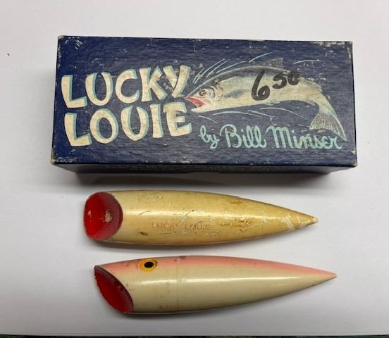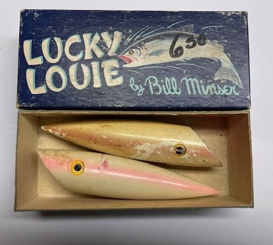 Lot 377 VINTAGE LUCKY LOUIE Wooden fishing plugs in vintage packaging