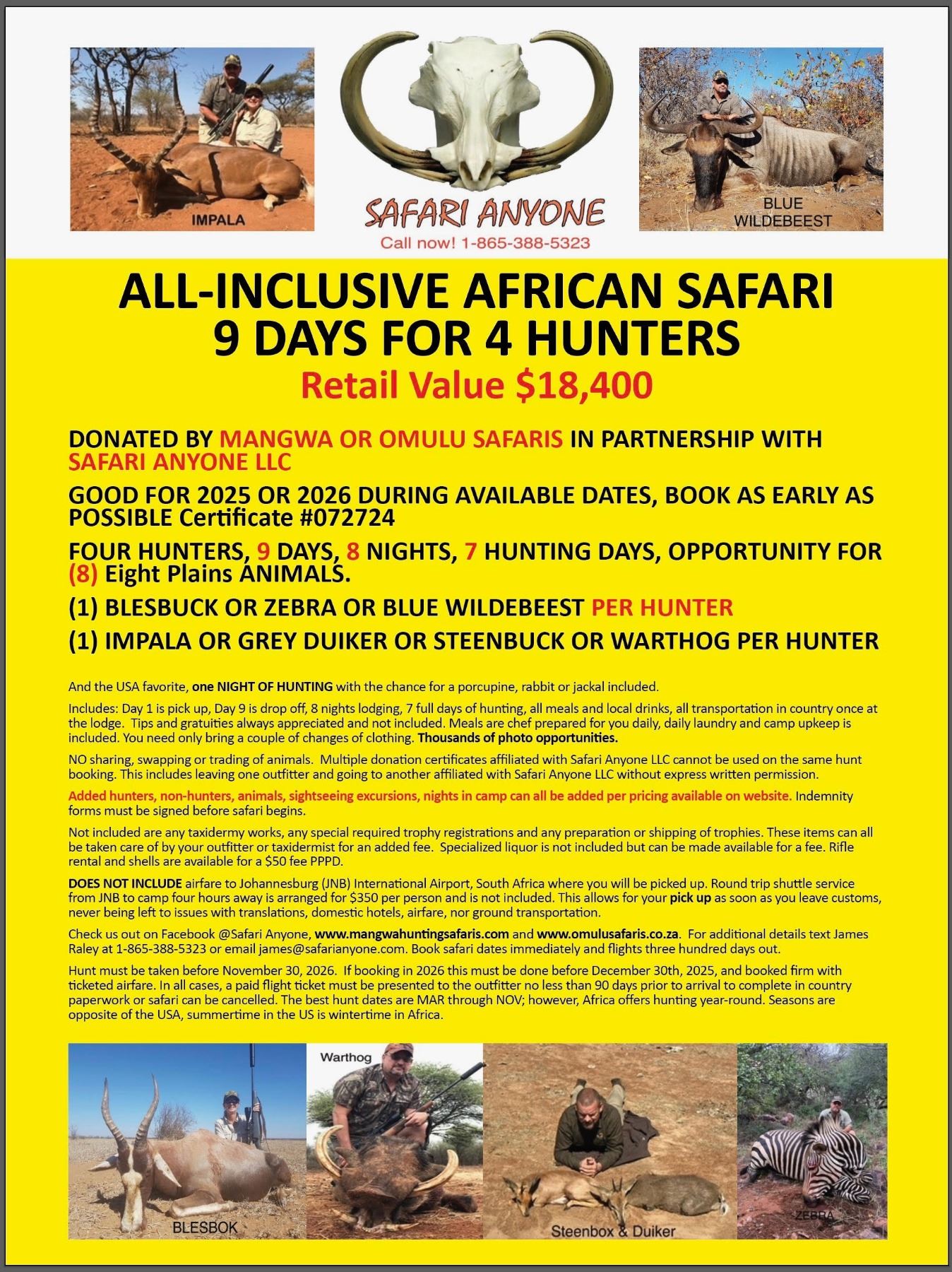 Mangwa Hunting Safaris or Omulu Safaris in partnership with Safari Anyone LLC have donated an amazing 9 Day All Inclusive African Safari for 4 Hunters and includes 8 plains game animals. The hunt is good for 2025 or 2026 during any available hunting dates and must be scheduled as soon as possible. The hunt is for 9 Days & 8 Nights of lodging which includes 7 hunting days.