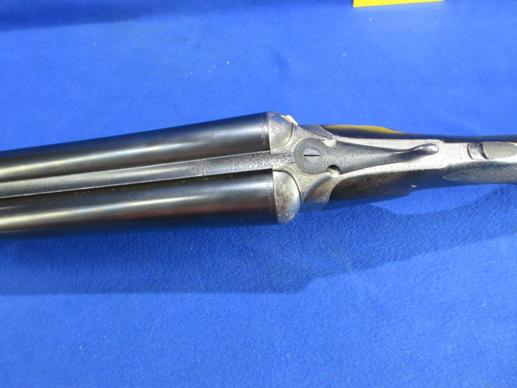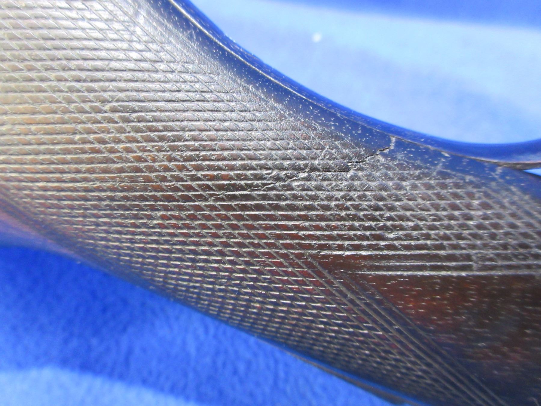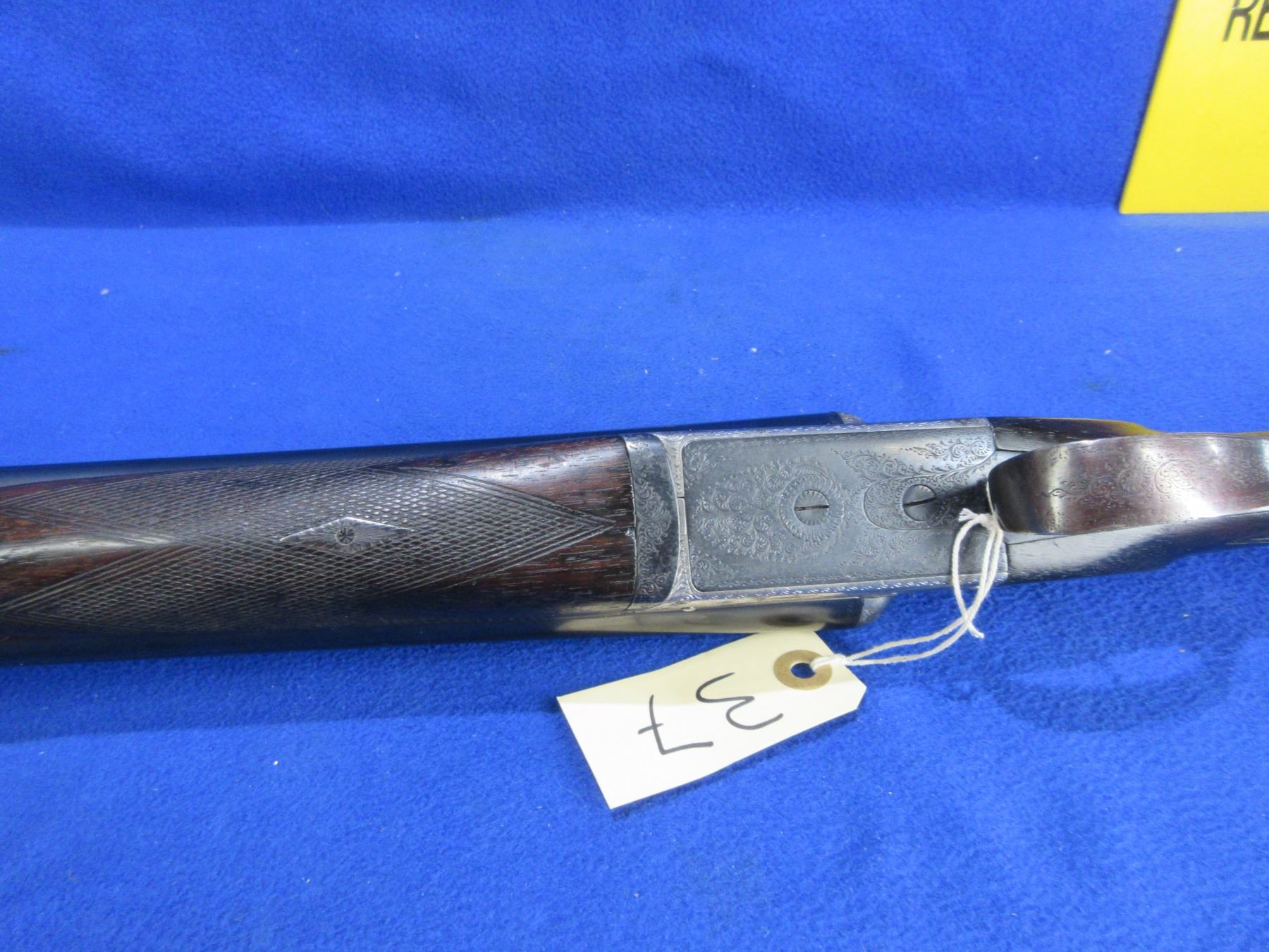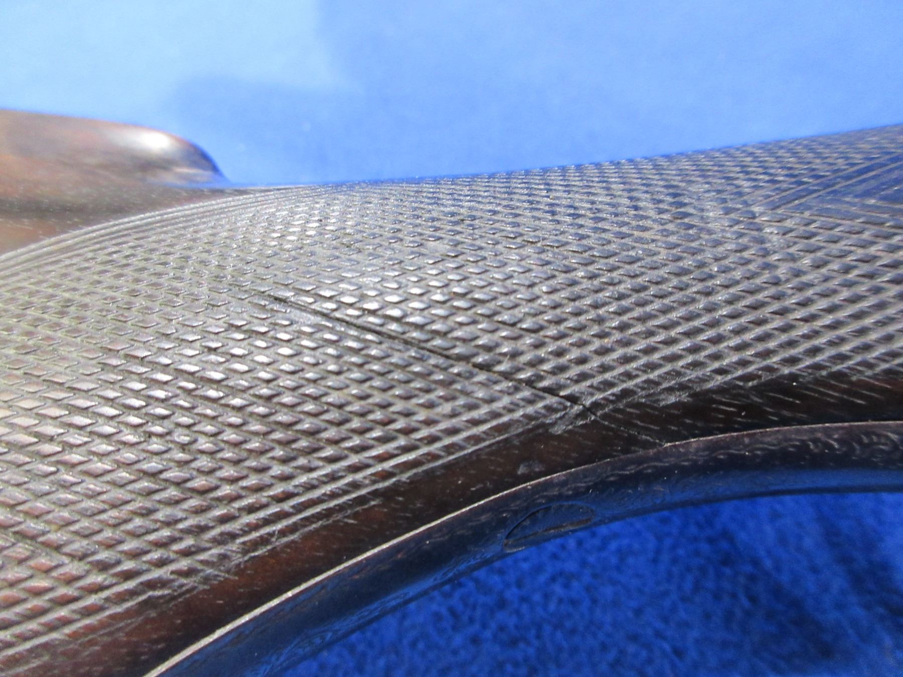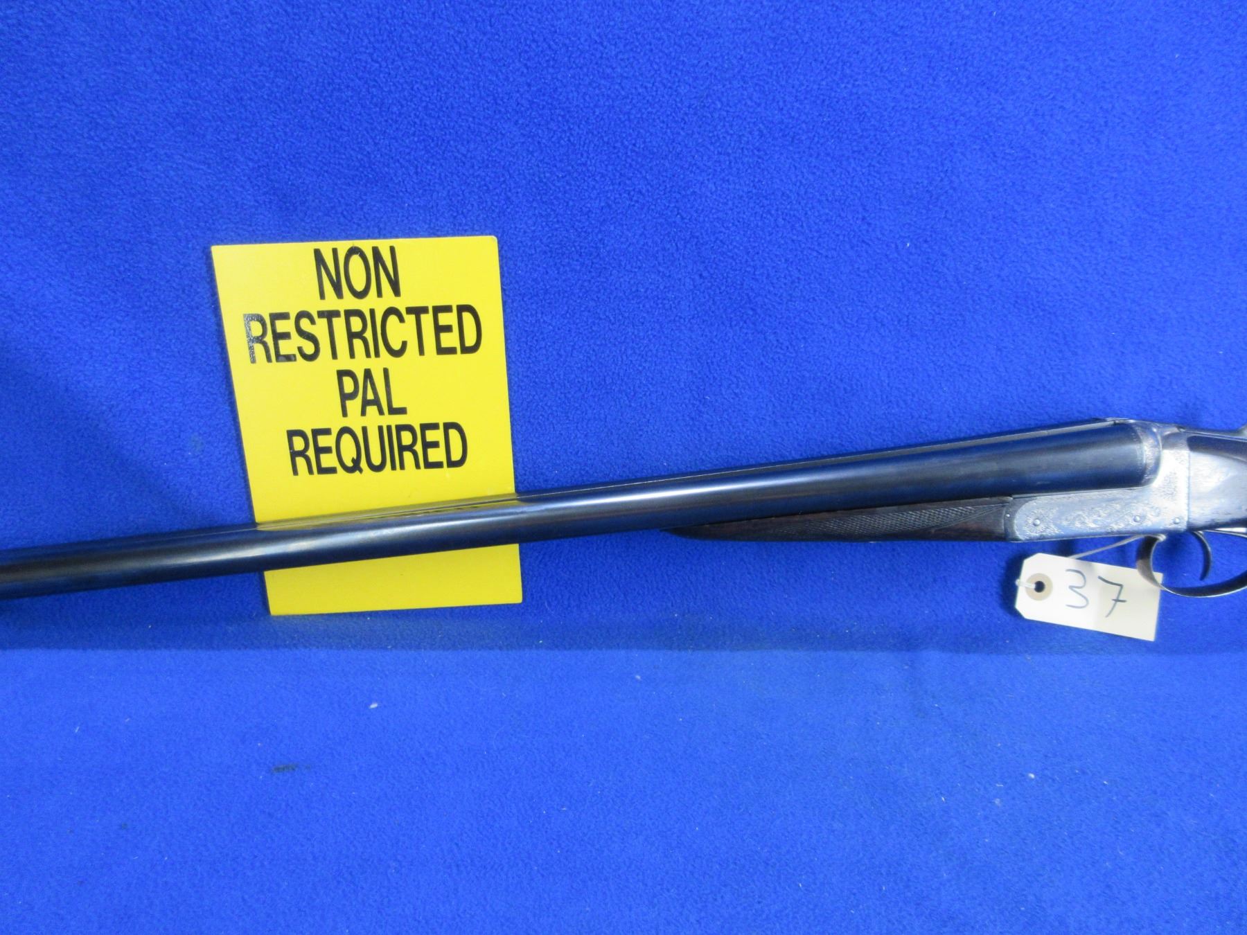 Non-Restricted - Walker SXS in 12 Ga. 2 1/2" - This is a tip up SXS shotgun, nicely engraved action is tight and appears to be in good working order but should not be fired as stock is cracked. Barrels are 28", bores are good to very good, bluing is good, has bead front sight, stock has a crack on both sides in the wrist area, forearm is good with many usage marks, rubber recoil pad good. Ser # None