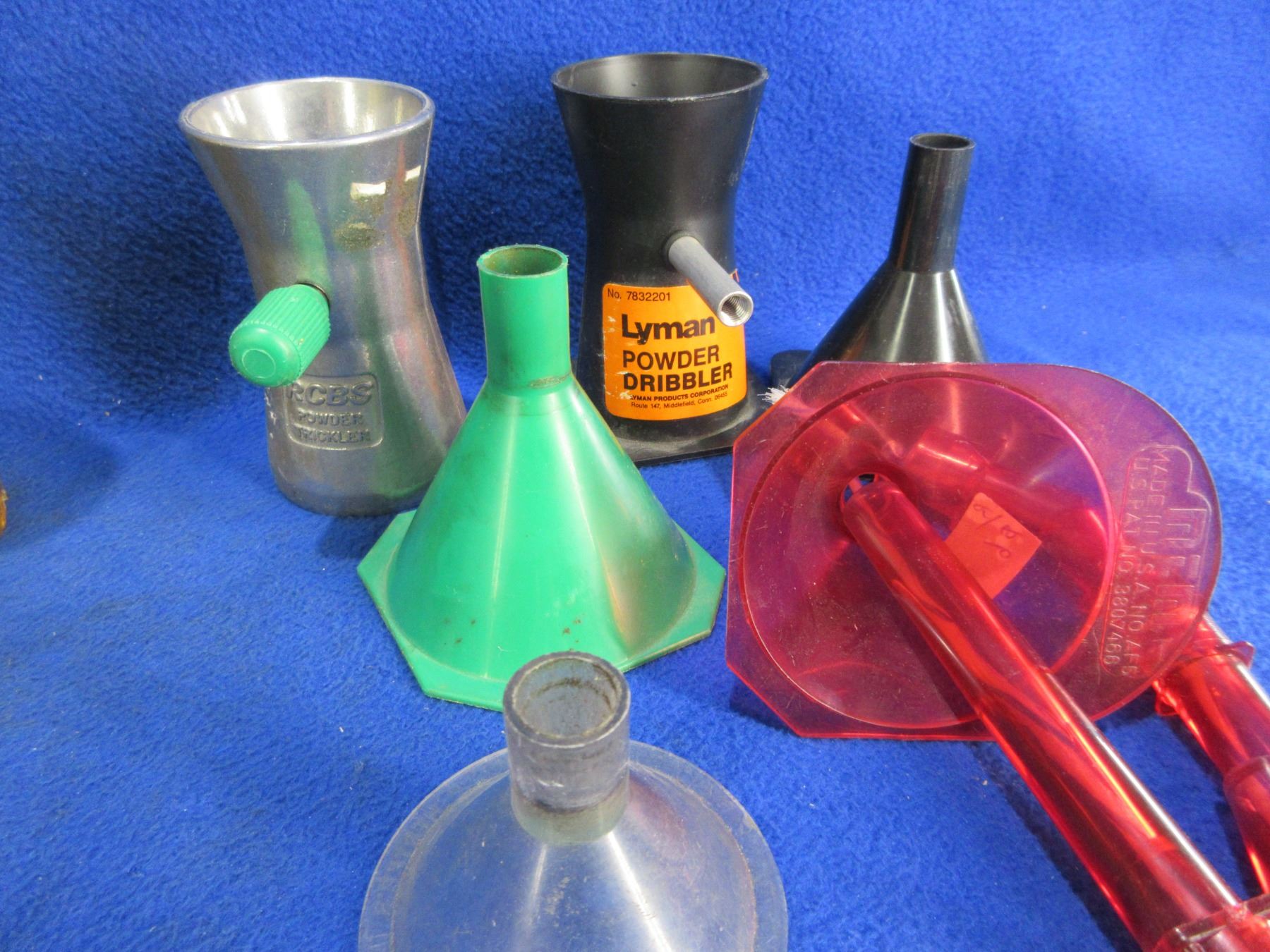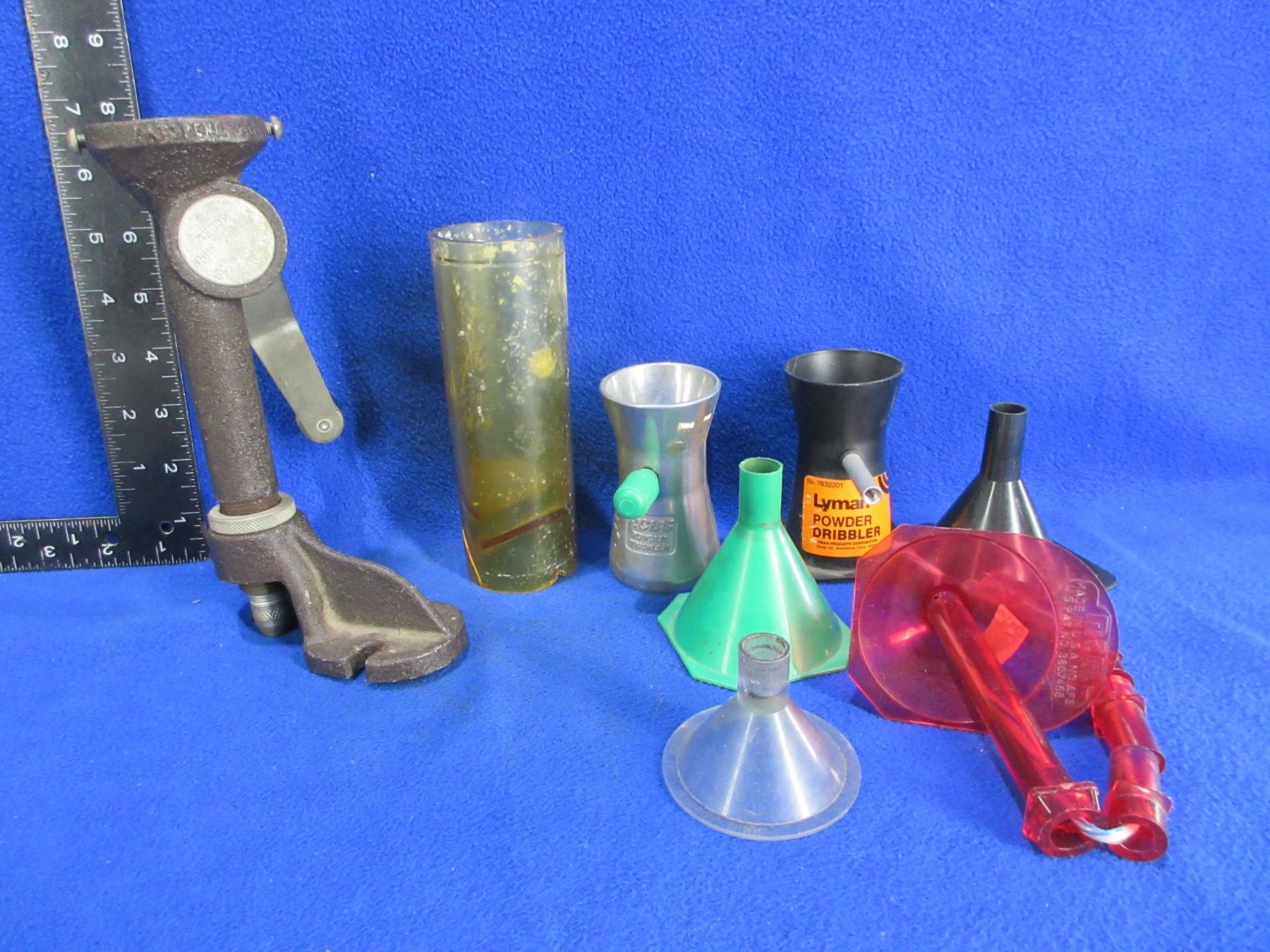 Lot 100 Lot of Misc. Reloading Equipment - Powder Measure, 4 Funnels, 2 Powder Tricklers