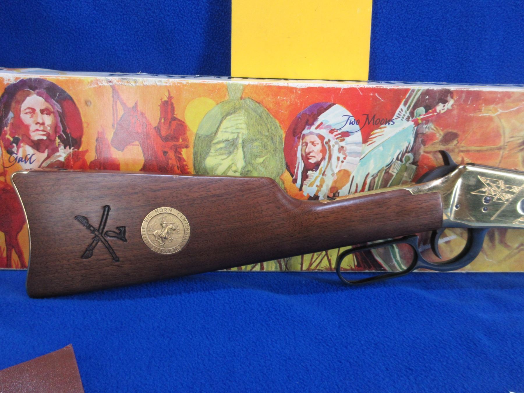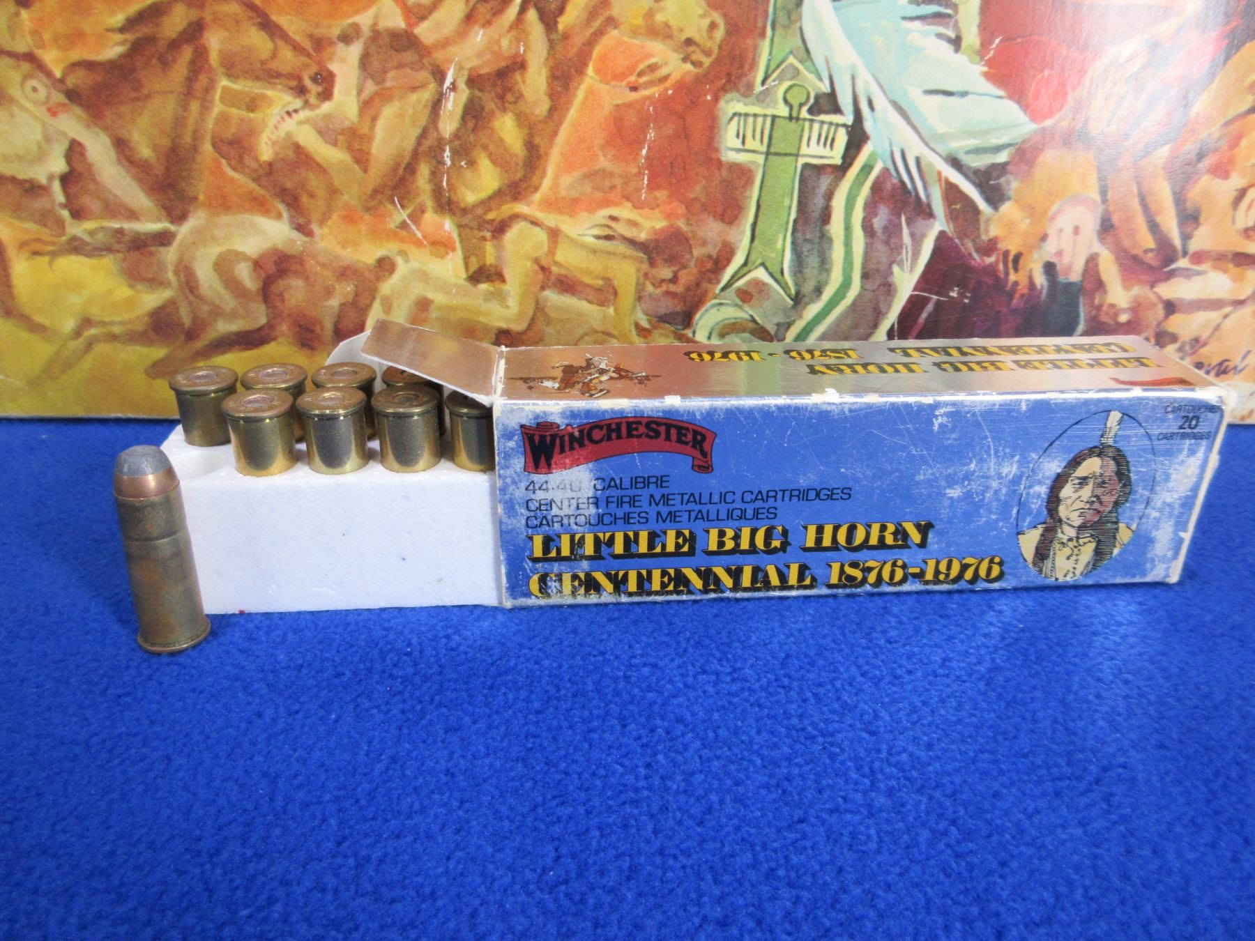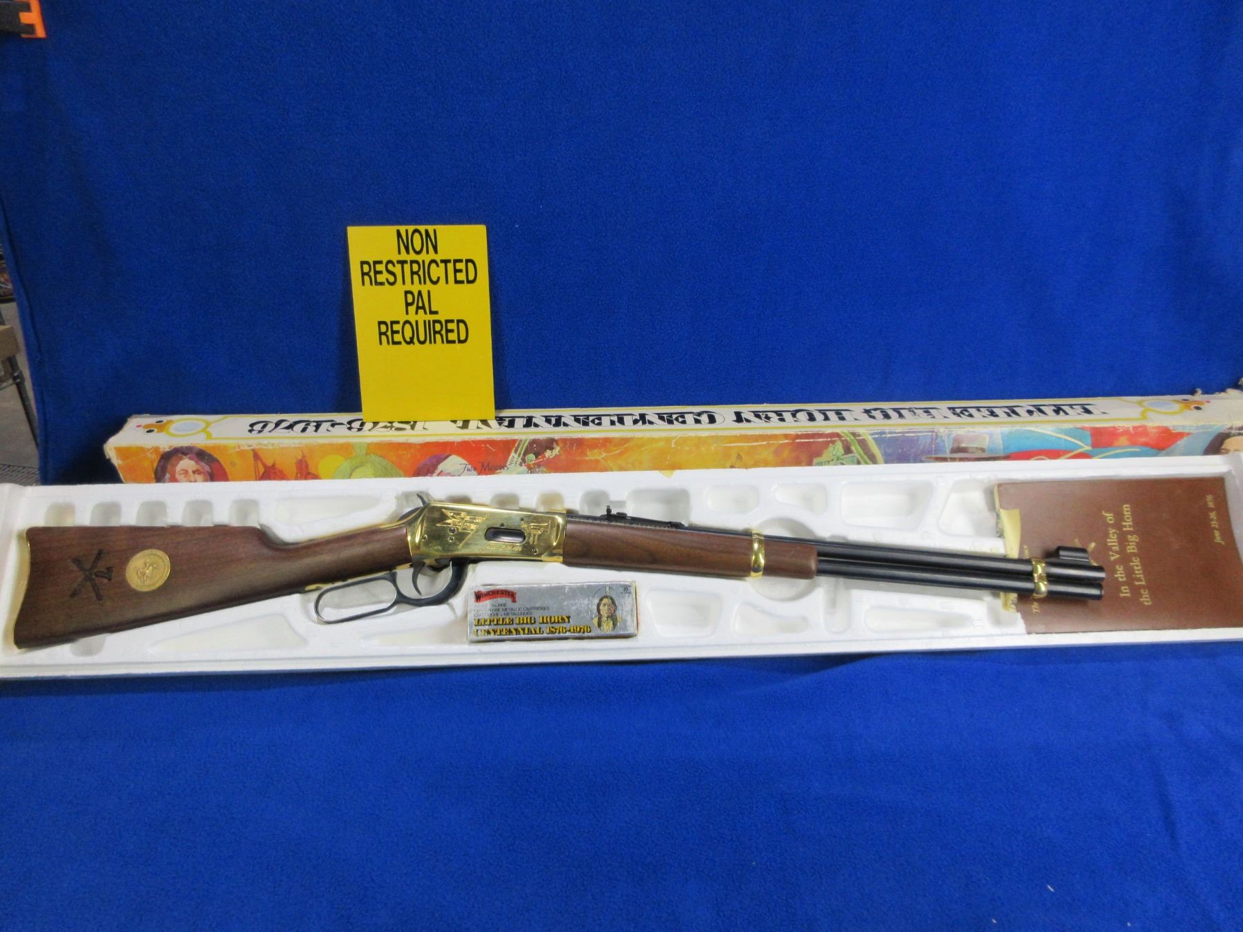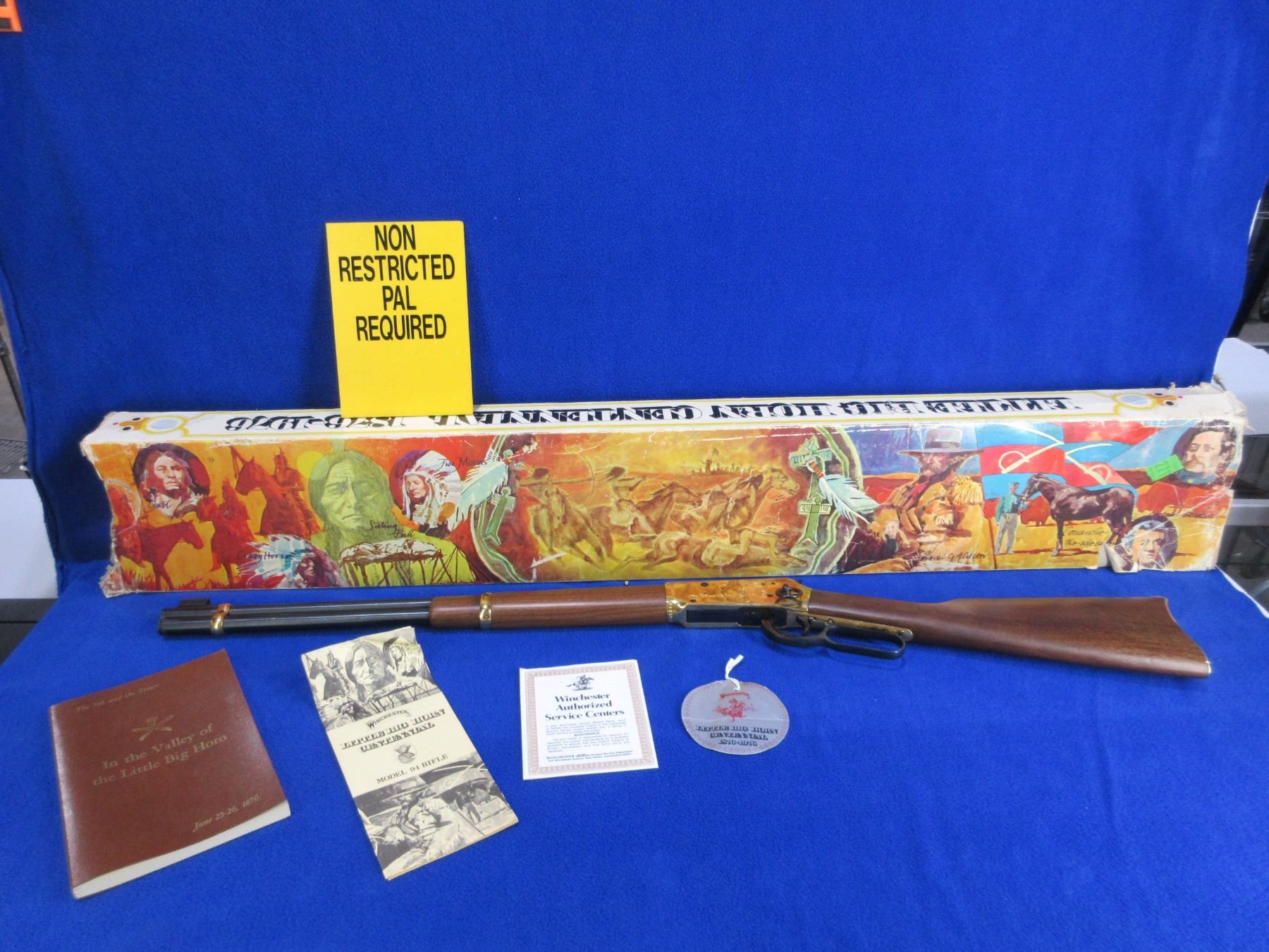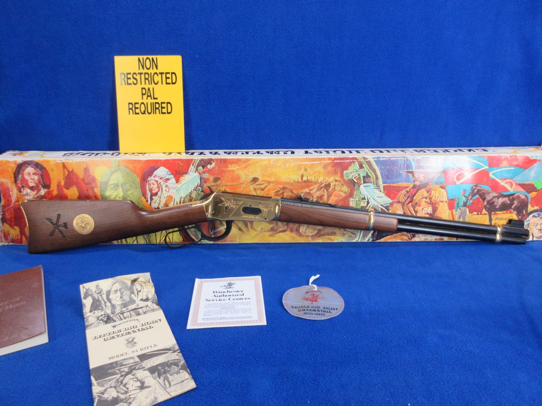 Non-Restricted - Winchester Model 94 Saddle Ring Carbine Little Big Horn Centennial in 44-40 Win - A beautiful little gun! This is a Never Fired lever action rifle with tube magazine, engraved gold plated action appears to be in very good working order. Barrel is 20", rifling is very good, bluing is good, has both sights, stock and forearm are good to very good with handling marks but stock has a small chip at the top, gold plated butt plate and gold plated furniture good, comes with original box (sleeve has damage), book - "In The Valley of The Little Big Horn", papers, full box of 44-40 Win. Little Big Horn Centennial ammo (Ammo and Rifle has to be Picked Up or Shipped Separately: Ammo by UPS Only, Rifle by Canada Post). Ser #LBH06448