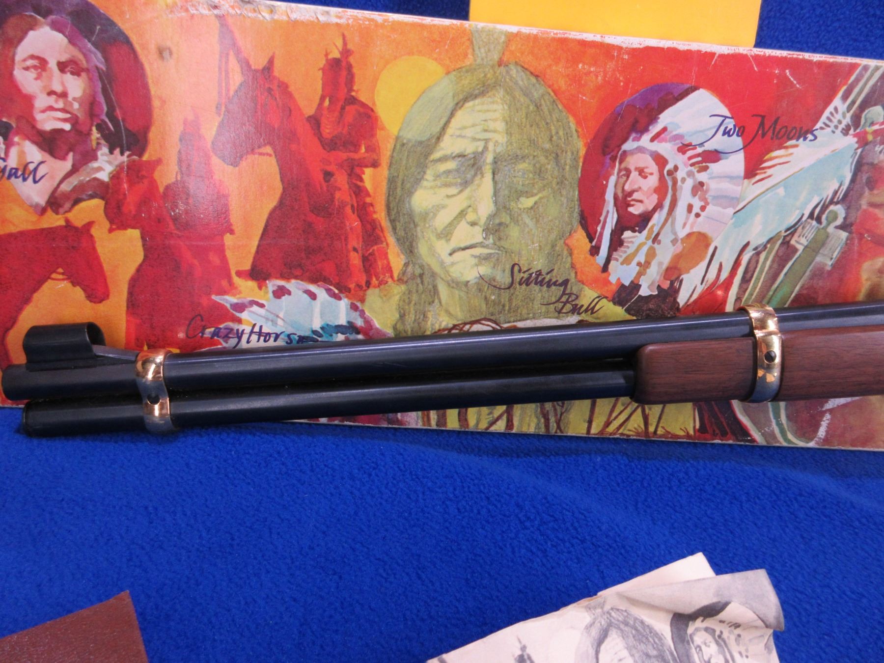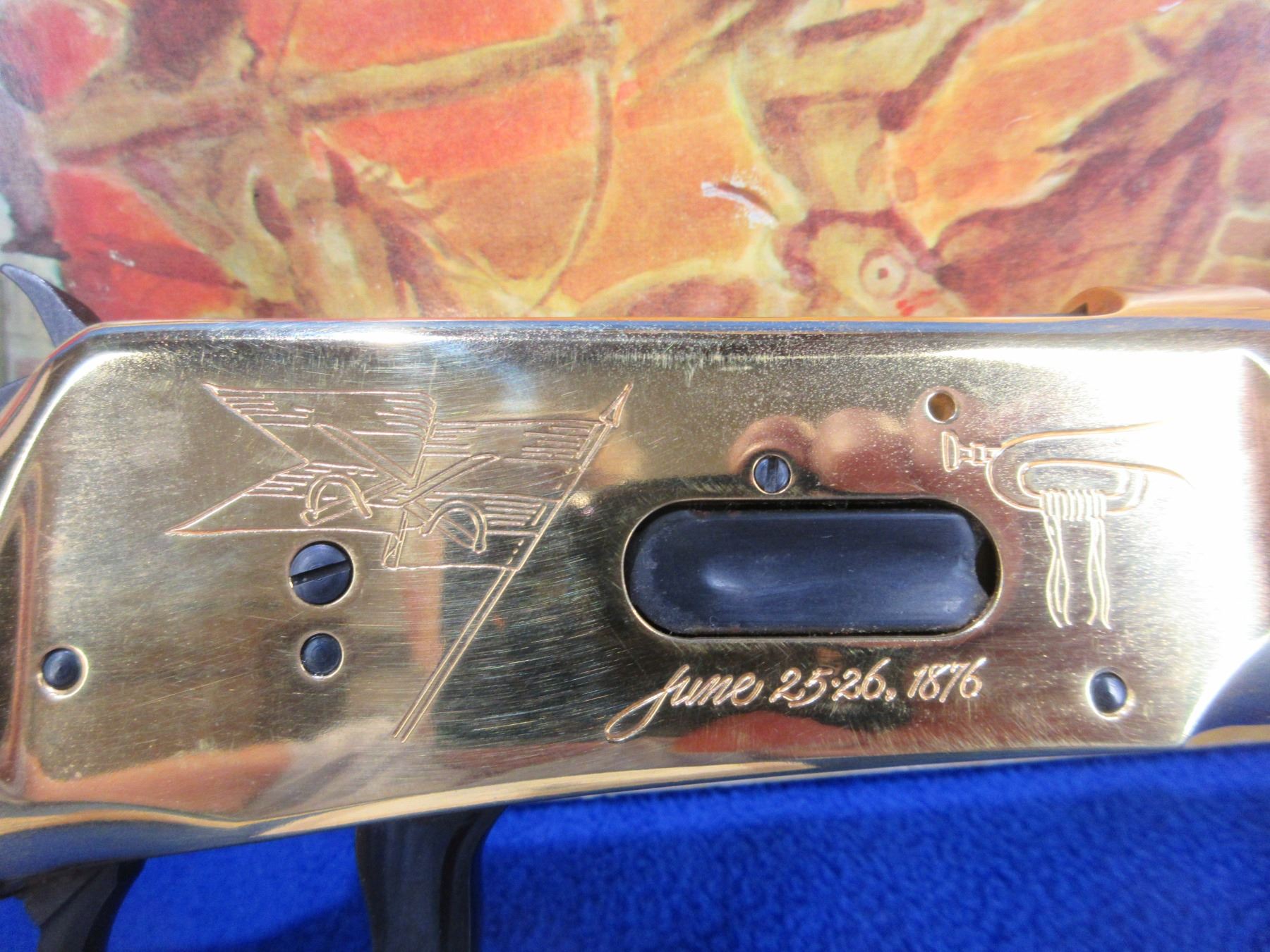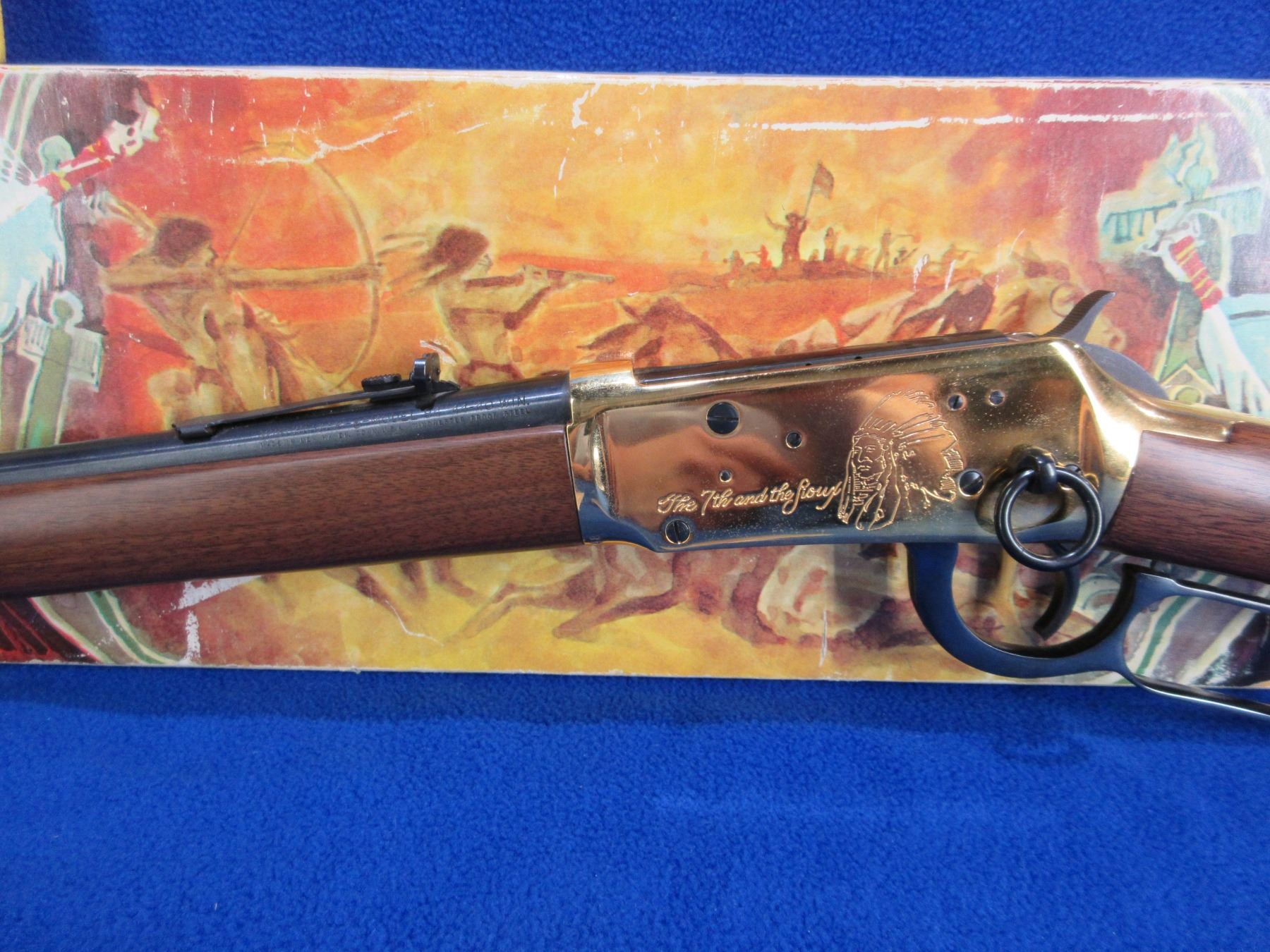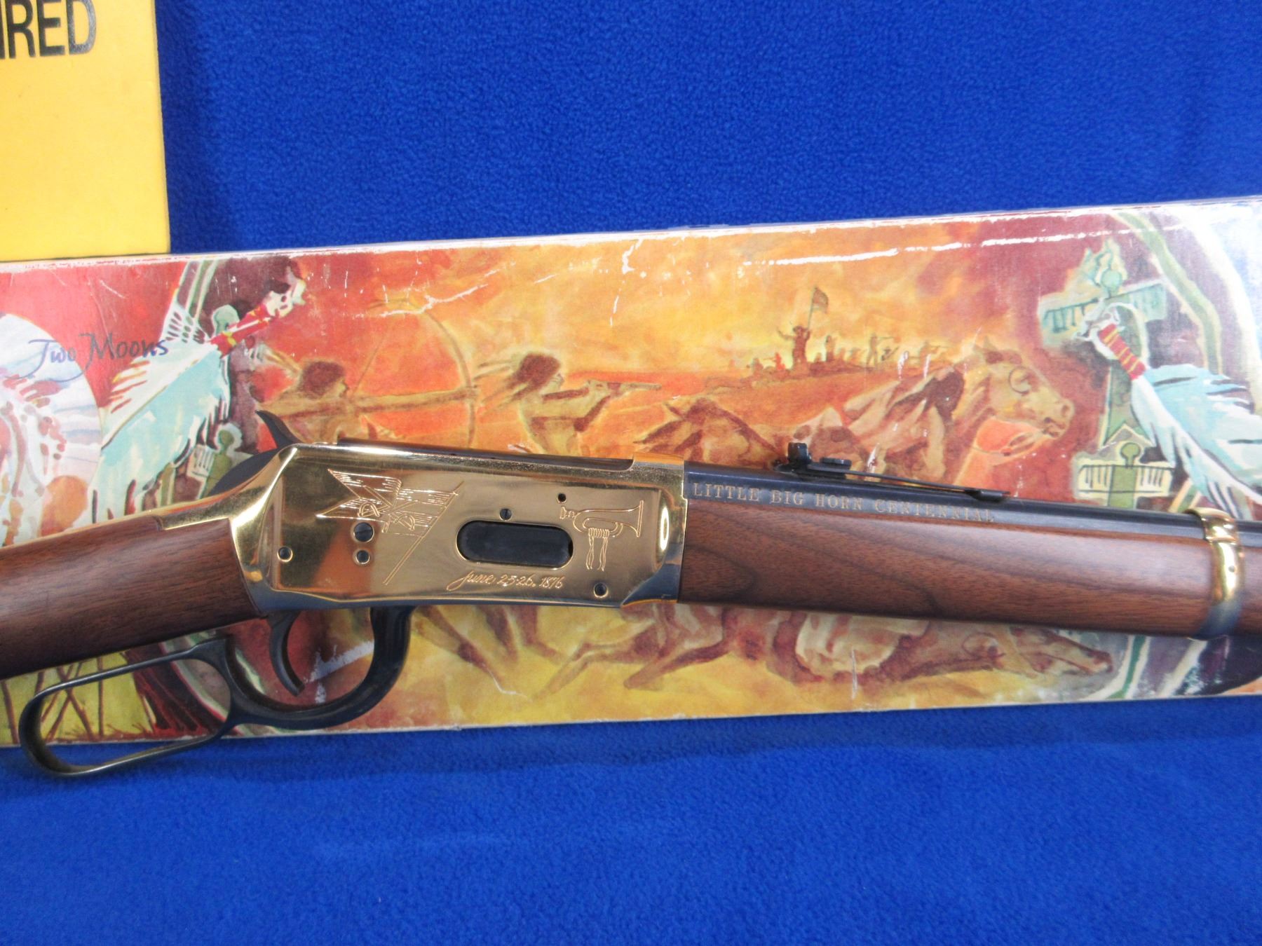Non-Restricted - Winchester Model 94 Saddle Ring Carbine Little Big Horn Centennial in 44-40 Win - A beautiful little gun! This is a Never Fired lever action rifle with tube magazine, engraved gold plated action appears to be in very good working order. Barrel is 20", rifling is very good, bluing is good, has both sights, stock and forearm are good to very good with handling marks but stock has a small chip at the top, gold plated butt plate and gold plated furniture good, comes with original box (sleeve has damage), book - "In The Valley of The Little Big Horn", papers, full box of 44-40 Win. Little Big Horn Centennial ammo (Ammo and Rifle has to be Picked Up or Shipped Separately: Ammo by UPS Only, Rifle by Canada Post). Ser #LBH06448