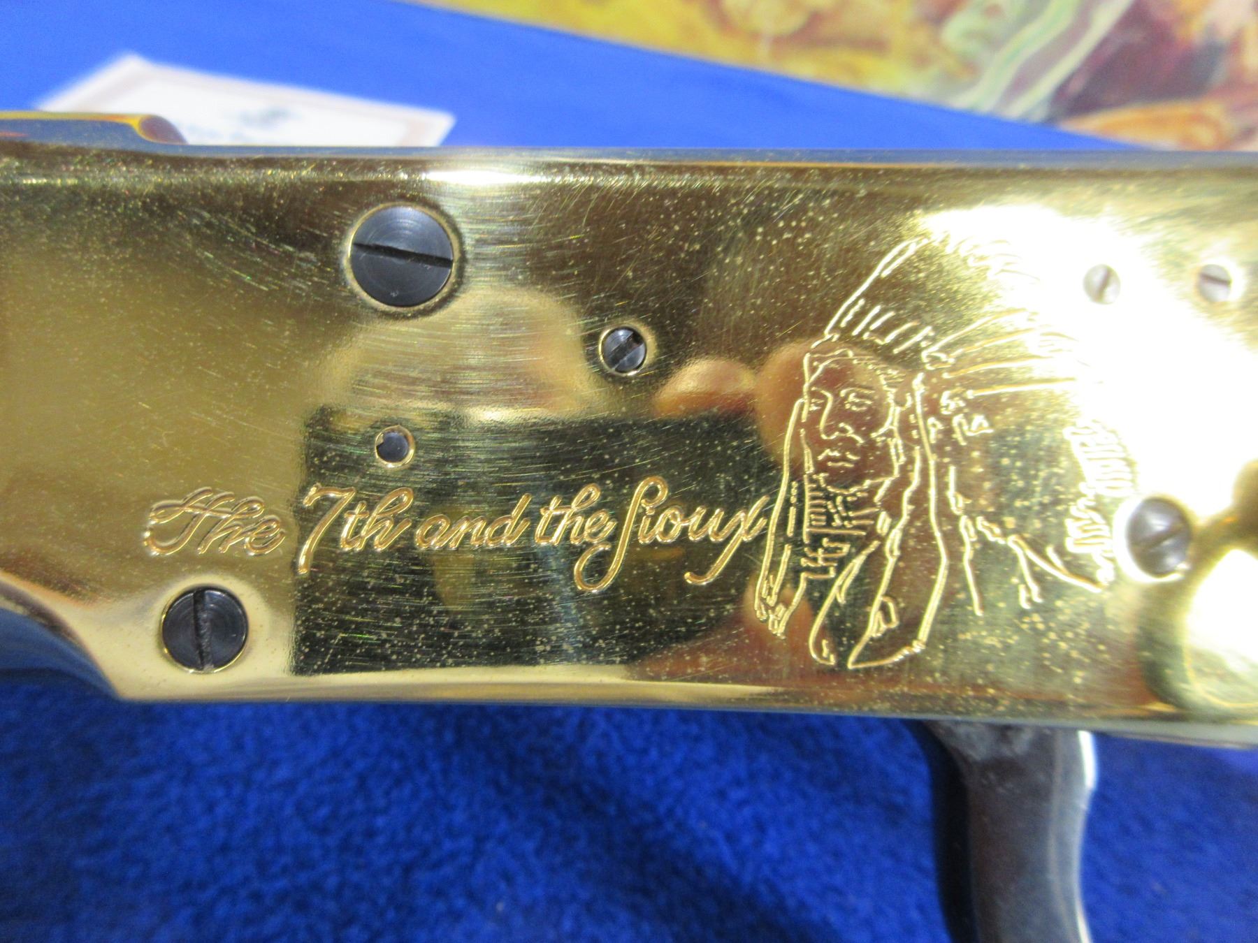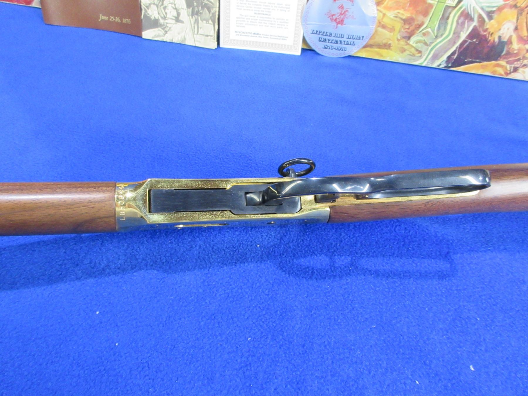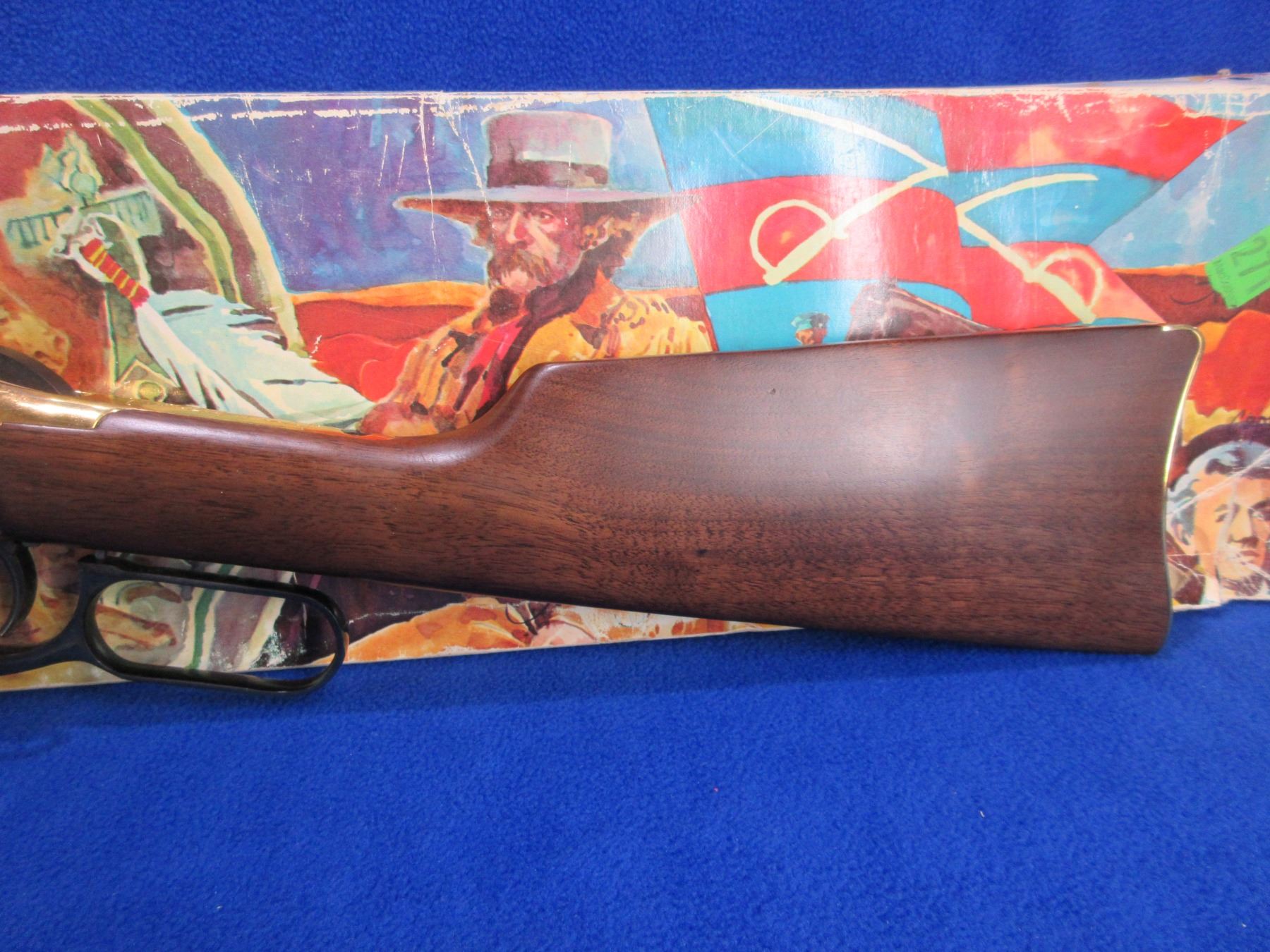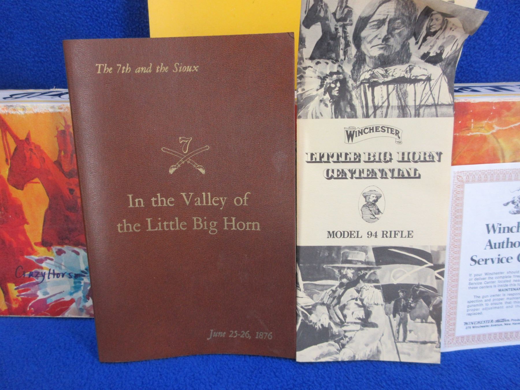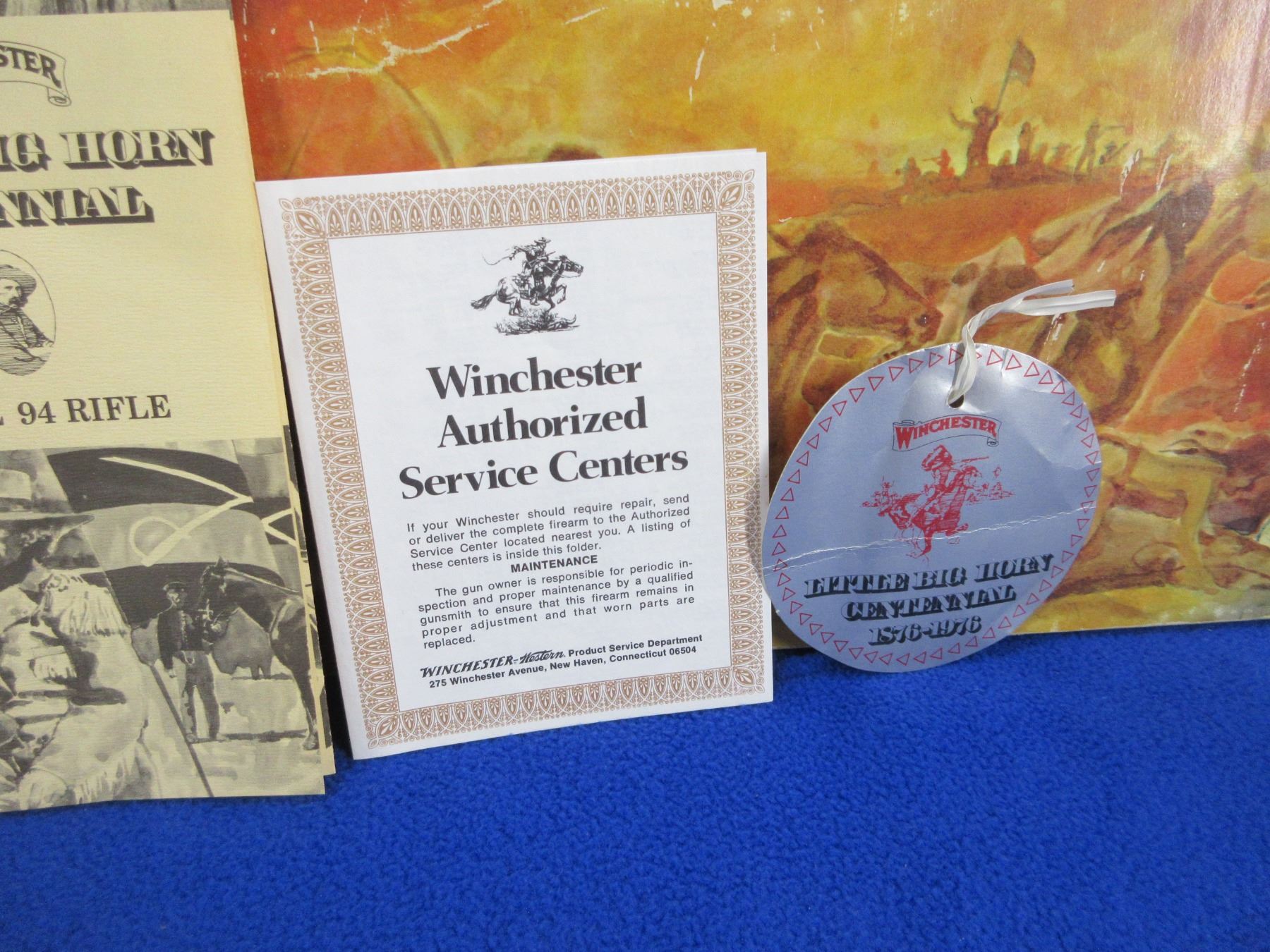 Non-Restricted - Winchester Model 94 Saddle Ring Carbine Little Big Horn Centennial in 44-40 Win - A beautiful little gun! This is a Never Fired lever action rifle with tube magazine, engraved gold plated action appears to be in very good working order. Barrel is 20", rifling is very good, bluing is good, has both sights, stock and forearm are good to very good with handling marks but stock has a small chip at the top, gold plated butt plate and gold plated furniture good, comes with original box (sleeve has damage), book - "In The Valley of The Little Big Horn", papers, full box of 44-40 Win. Little Big Horn Centennial ammo (Ammo and Rifle has to be Picked Up or Shipped Separately: Ammo by UPS Only, Rifle by Canada Post). Ser #LBH06448