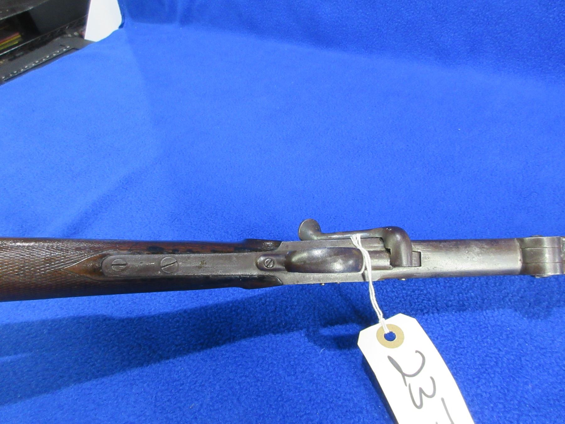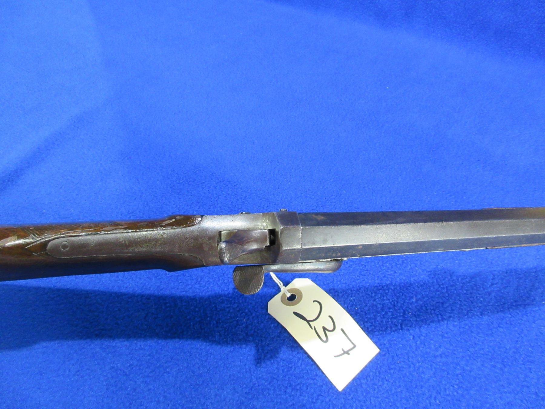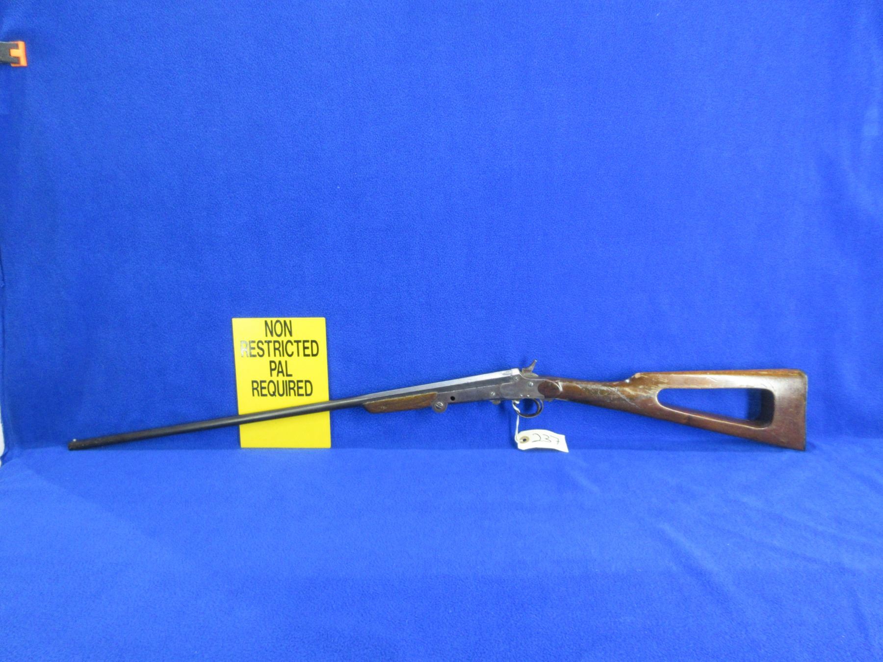 Non-Restricted - Belgian Single Shot in 410 Ga. 2 1/2" - This is a folding tip up hammer single shot shotgun with side lever, action is tight and appears to be in good working order. Partial octagon barrel is 25 1/4", bore is fair with pitting, bluing on barrel is good for age with light pitting, bluing on action is turning grey with light pitting, has bead front sight, stock is good for age with many usage marks, forearm is good for age with many usage marks, metal butt plate. Ser # None