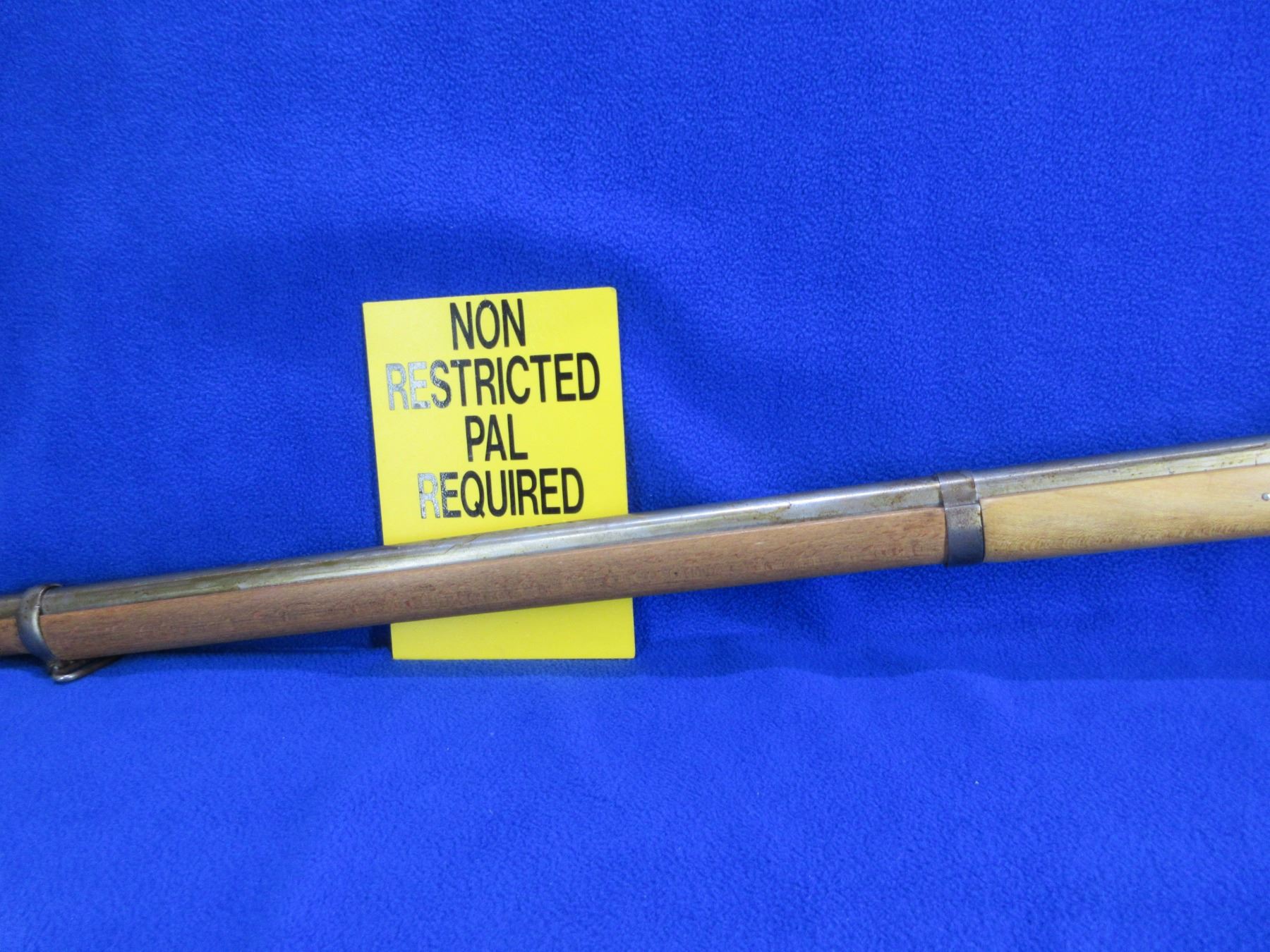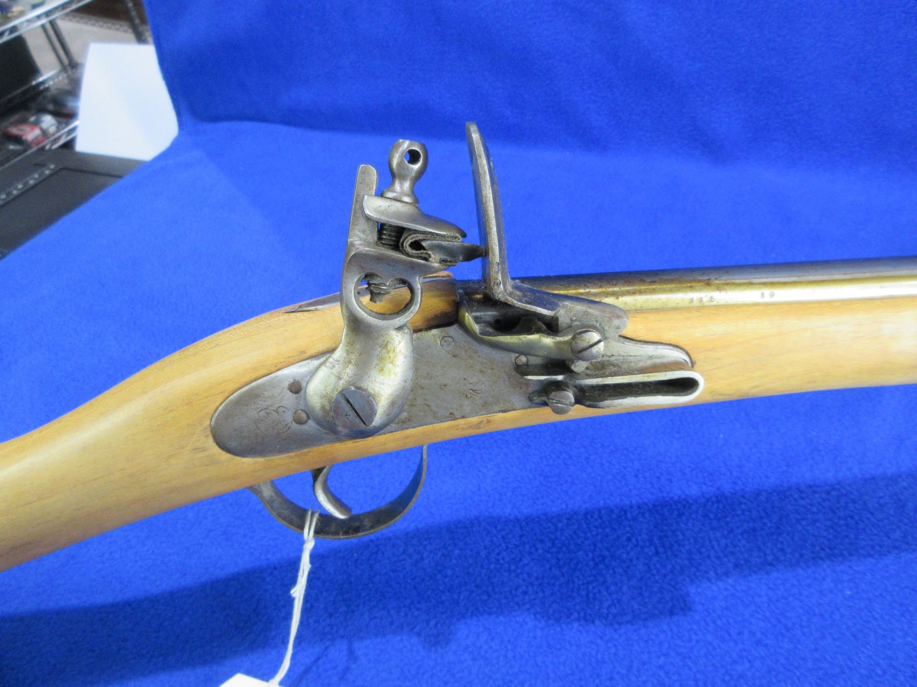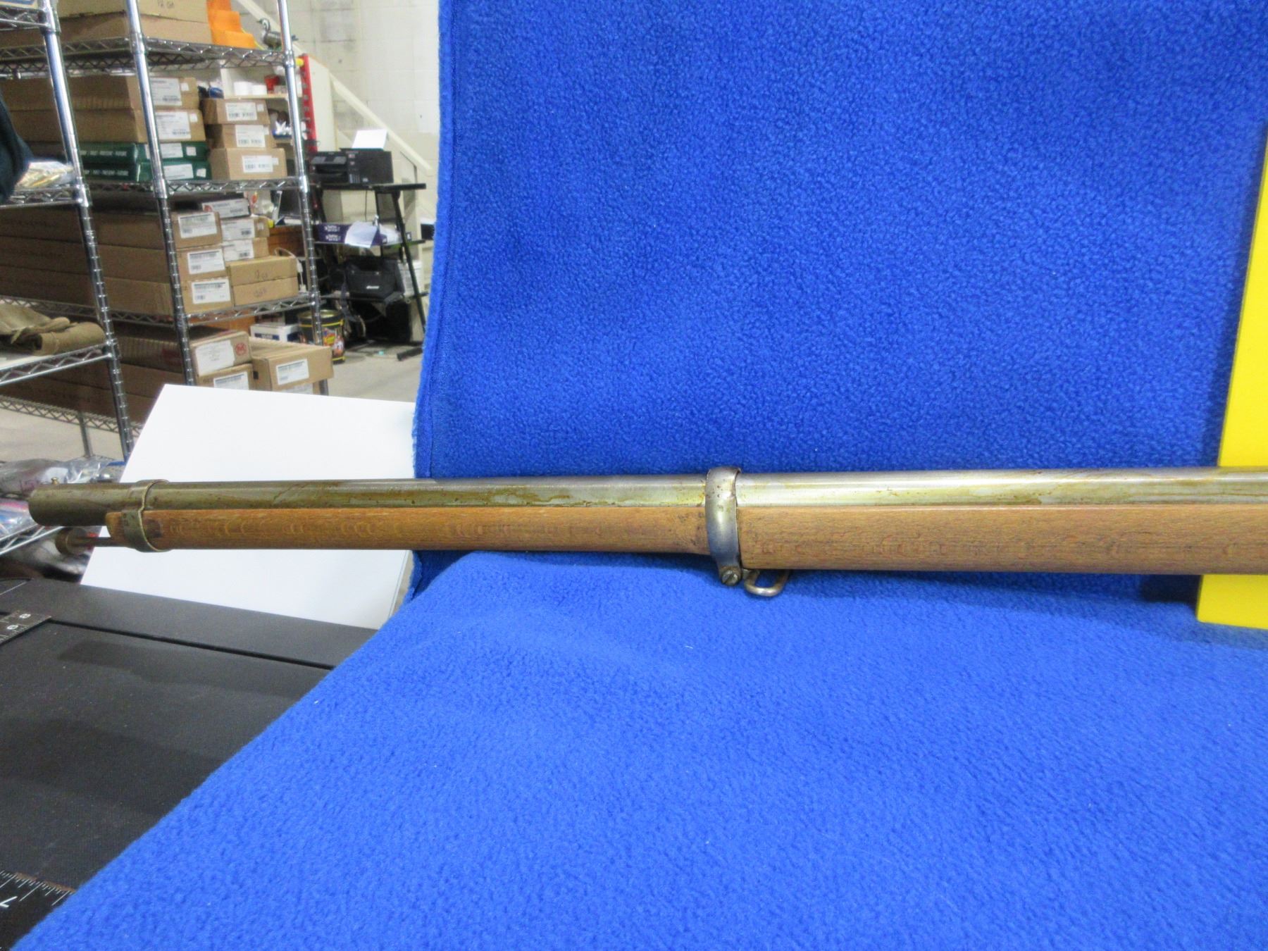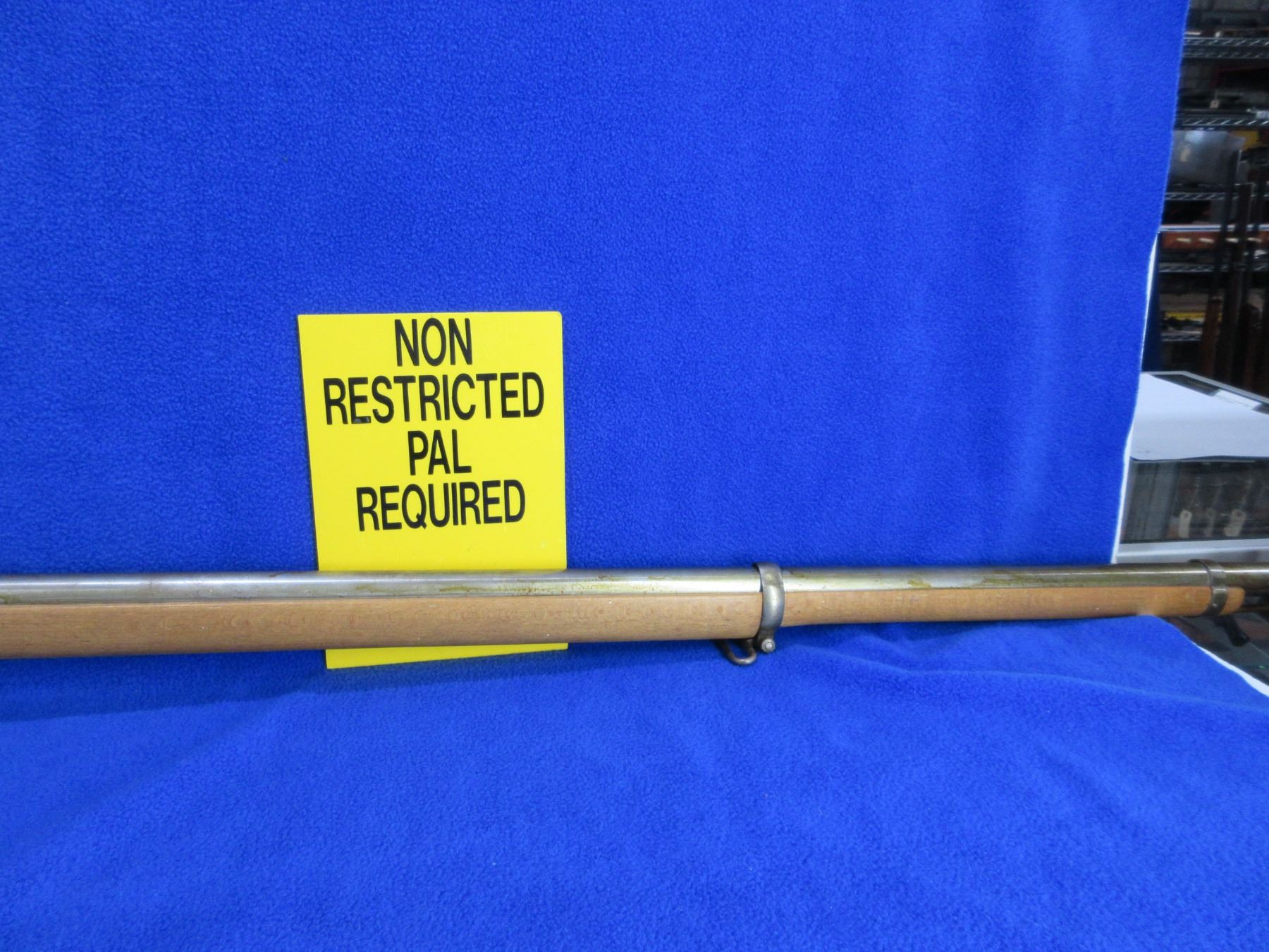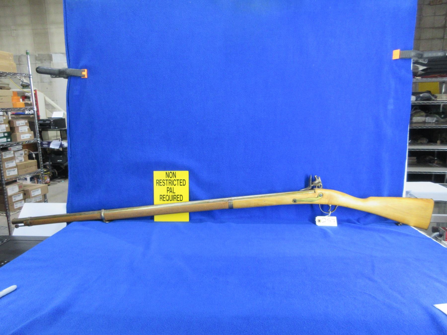 Antique - No PAL Required - Flintlock Rifle in Approx. 65 Cal. - This is a flintlock muzzleloading rifle, action appears to be in working order. Barrel is 44", bore appears good for age, stainless finish is spotted with varnish, has bead front sight, stock is good for age and appears refinished, forearm is good but appears replaced, metal butt plate good, comes with ram rod and swivels. Ser # 445