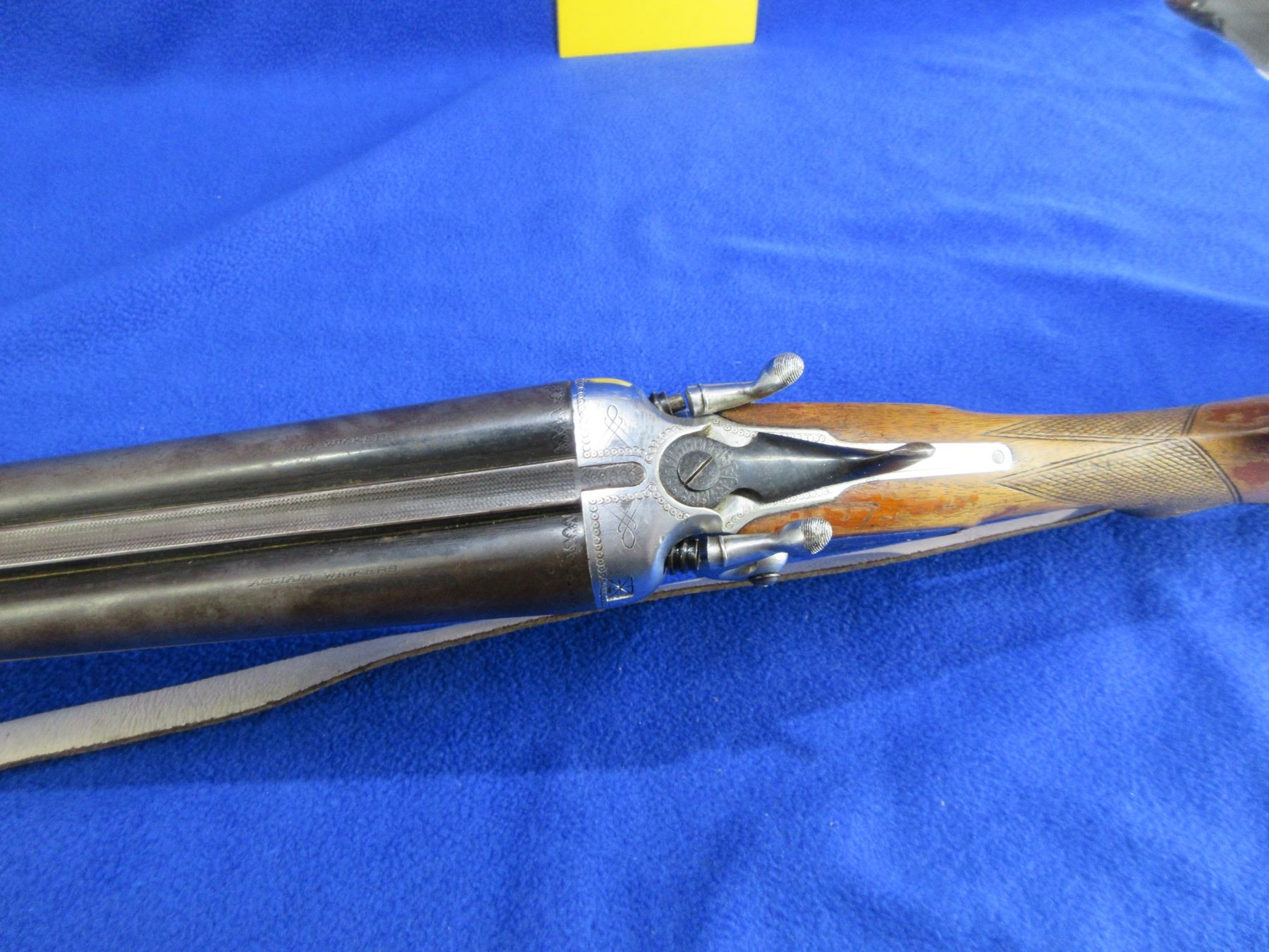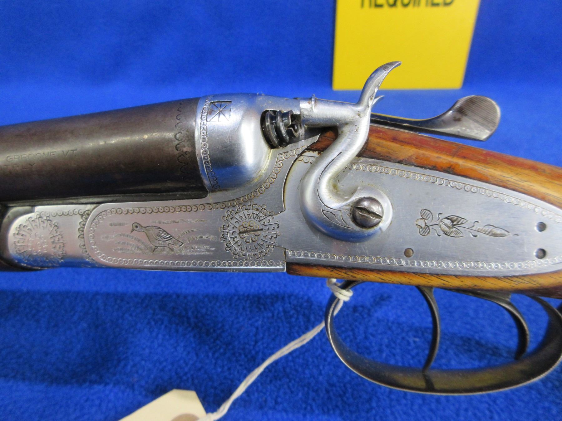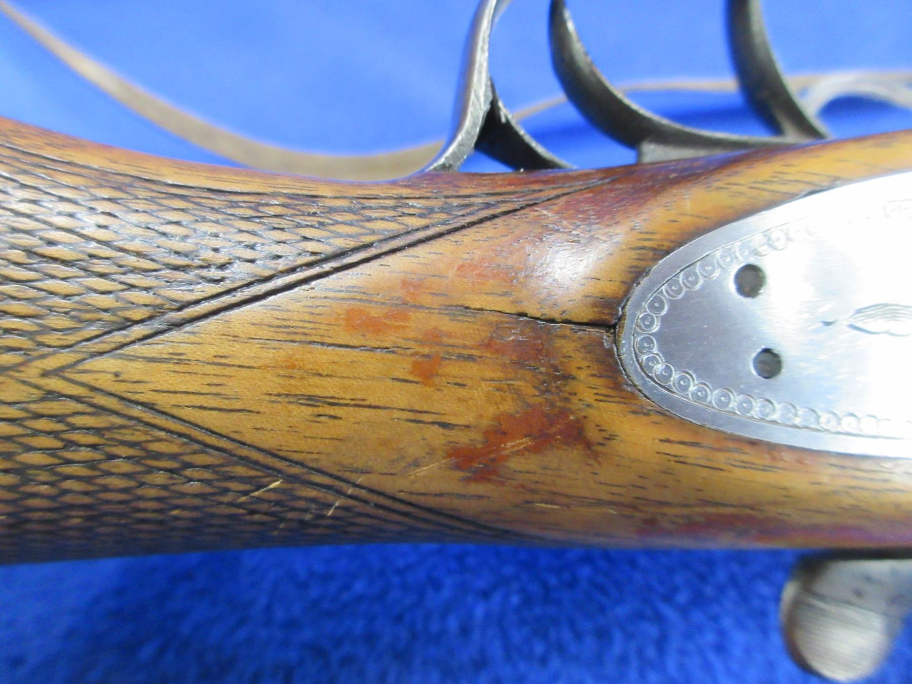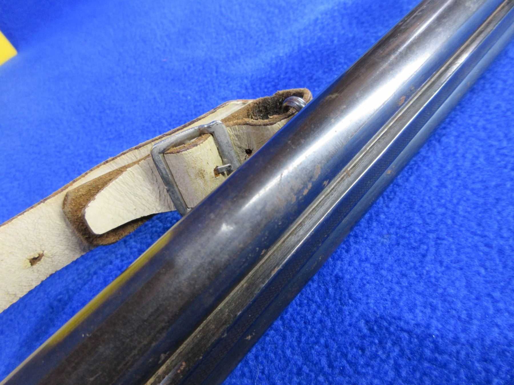 Non-Restricted - Angelo Zoli Acciaio Wickers in 16 Ga. 2 3/4" - This is a tip up SXS hammer shotgun, very nicely engraved action has a small amount of play and appears to be in working order but left firing pin is sticking. Barrels are 27 1/2", bores are good but right barrel is ringed approx. 15" from muzzle, left barrel has a dent approx 14" from muzzle, bluing is turning grey with some rust and pitting, bead front sight missing, stock has a 1" crack on the back left side of the action and a large sticker on left side, forearm is good with usage marks, butt plate good, comes with swivels and sling. Ser # 14362
