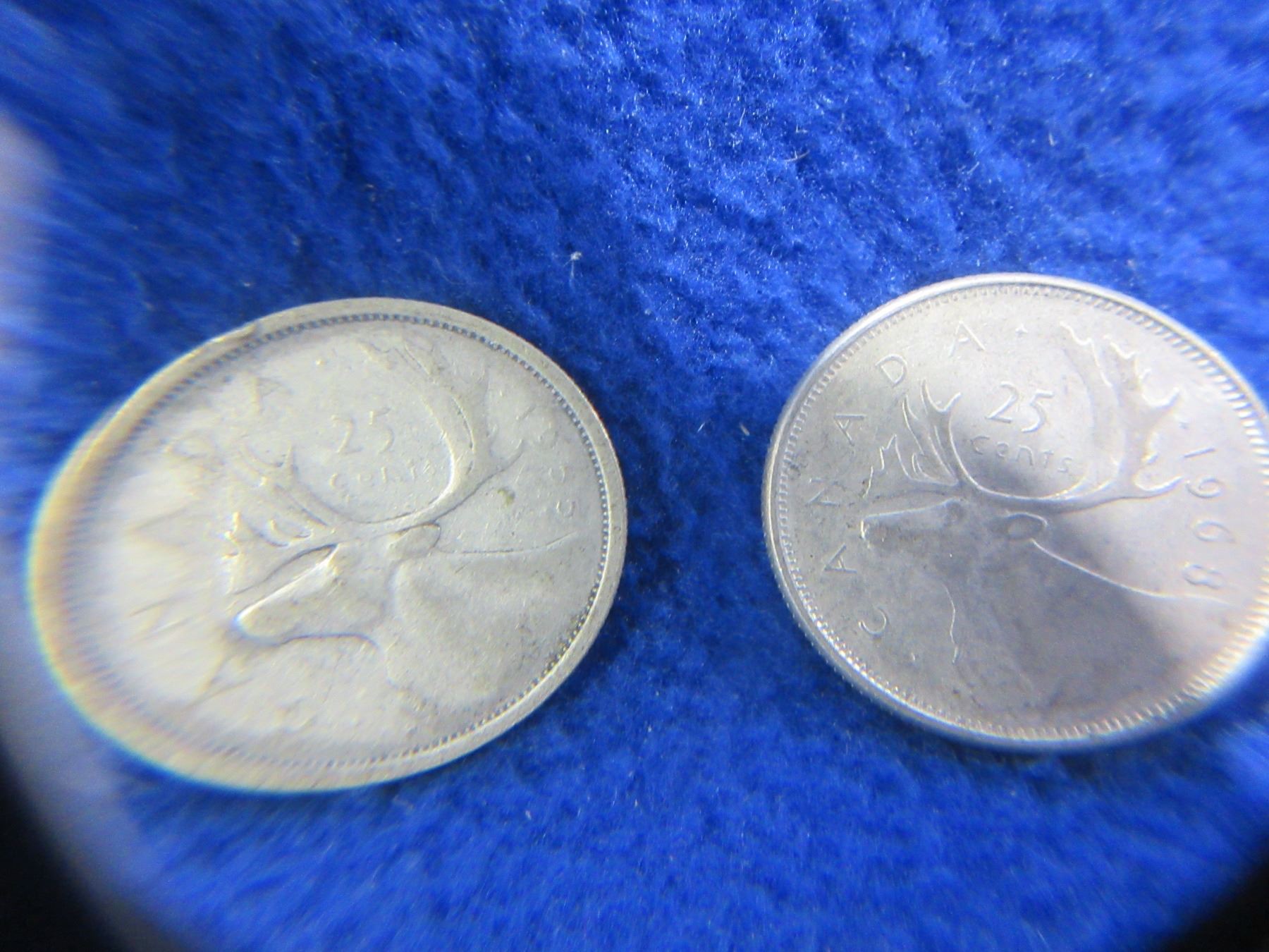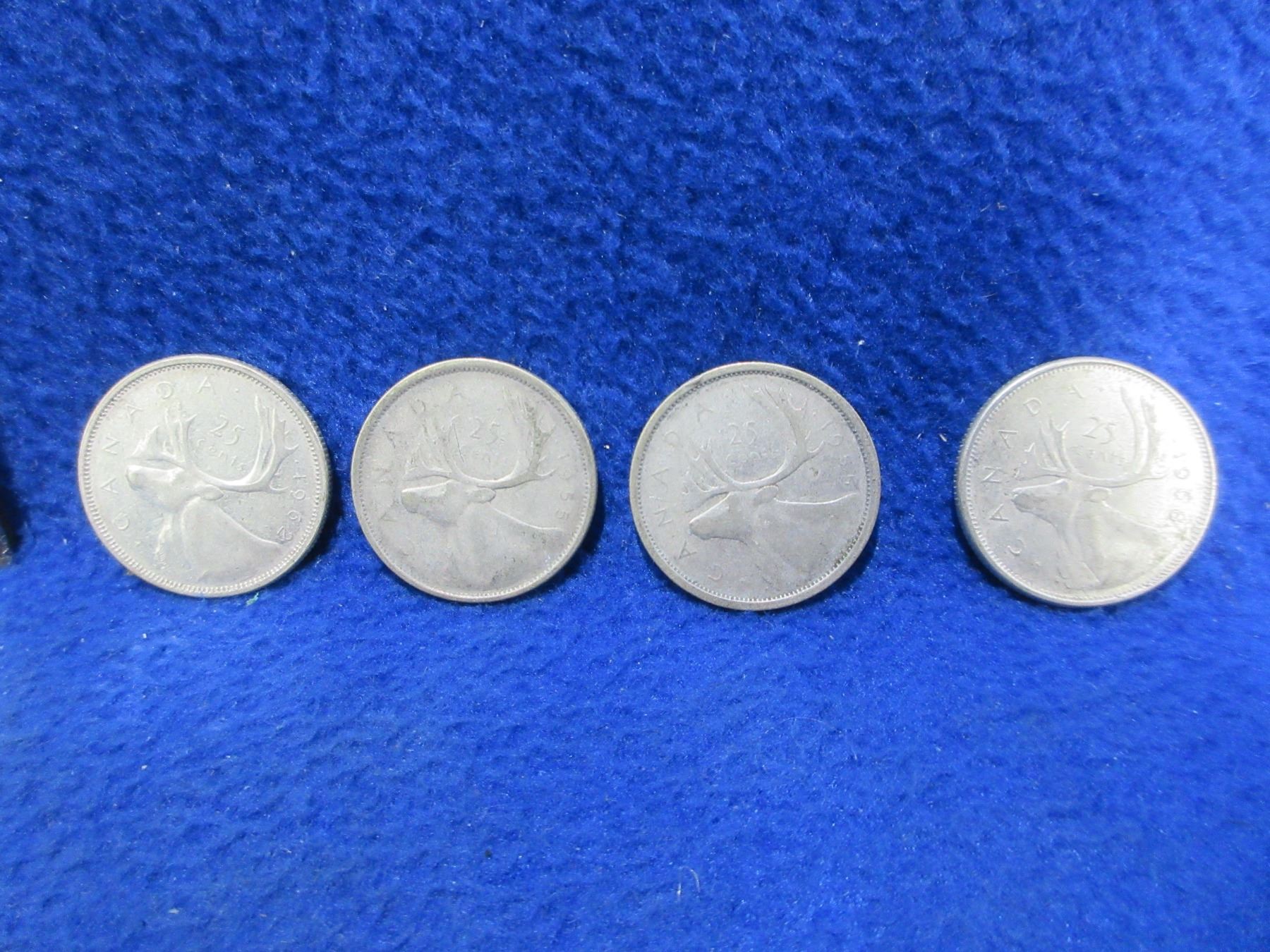4 - Canadian 25 Cent Pieces - 1955, 1955, 1962, 1968 - 1955 and 1962 are .800 Silver, 1968 are .500 Silver