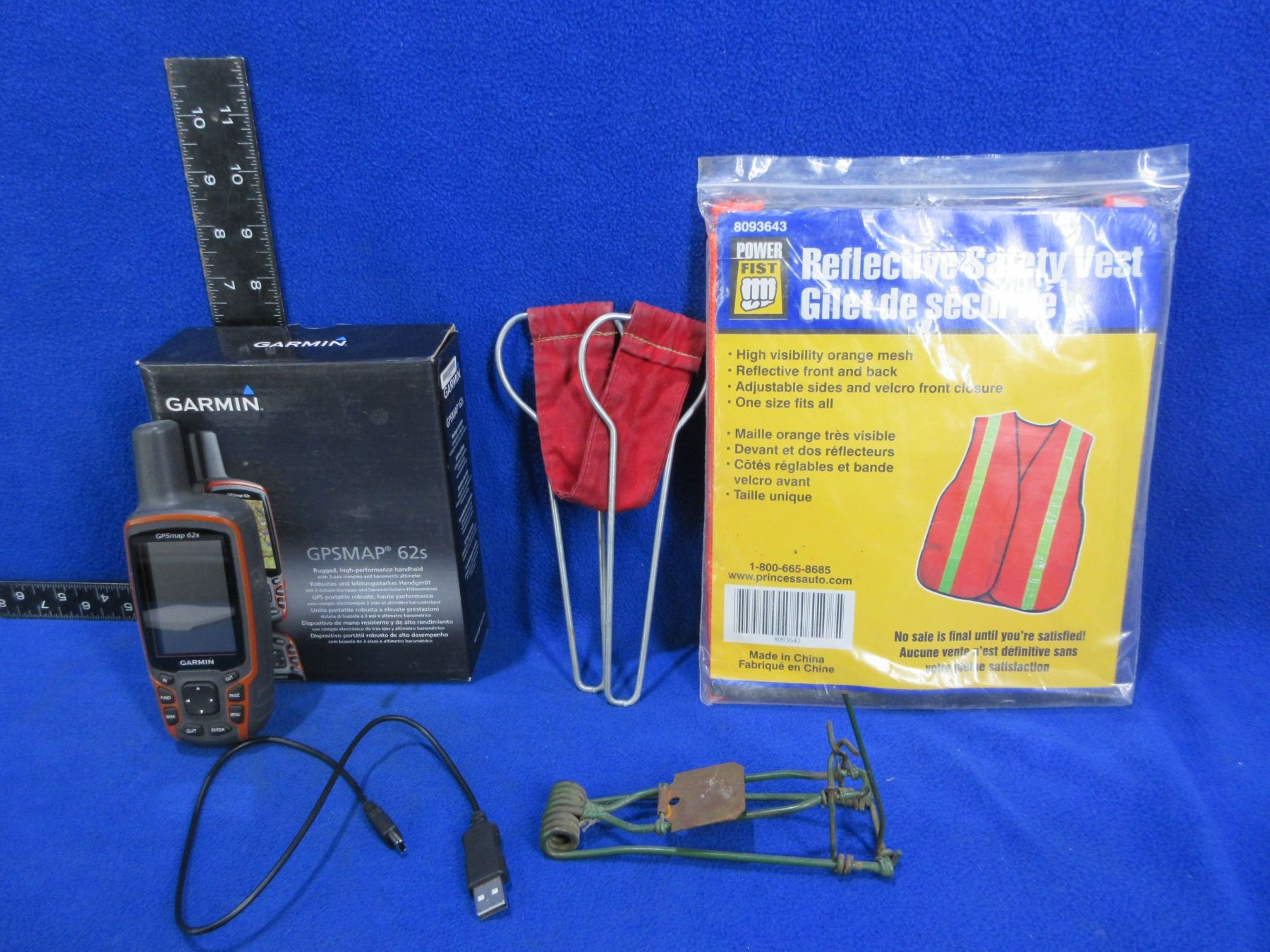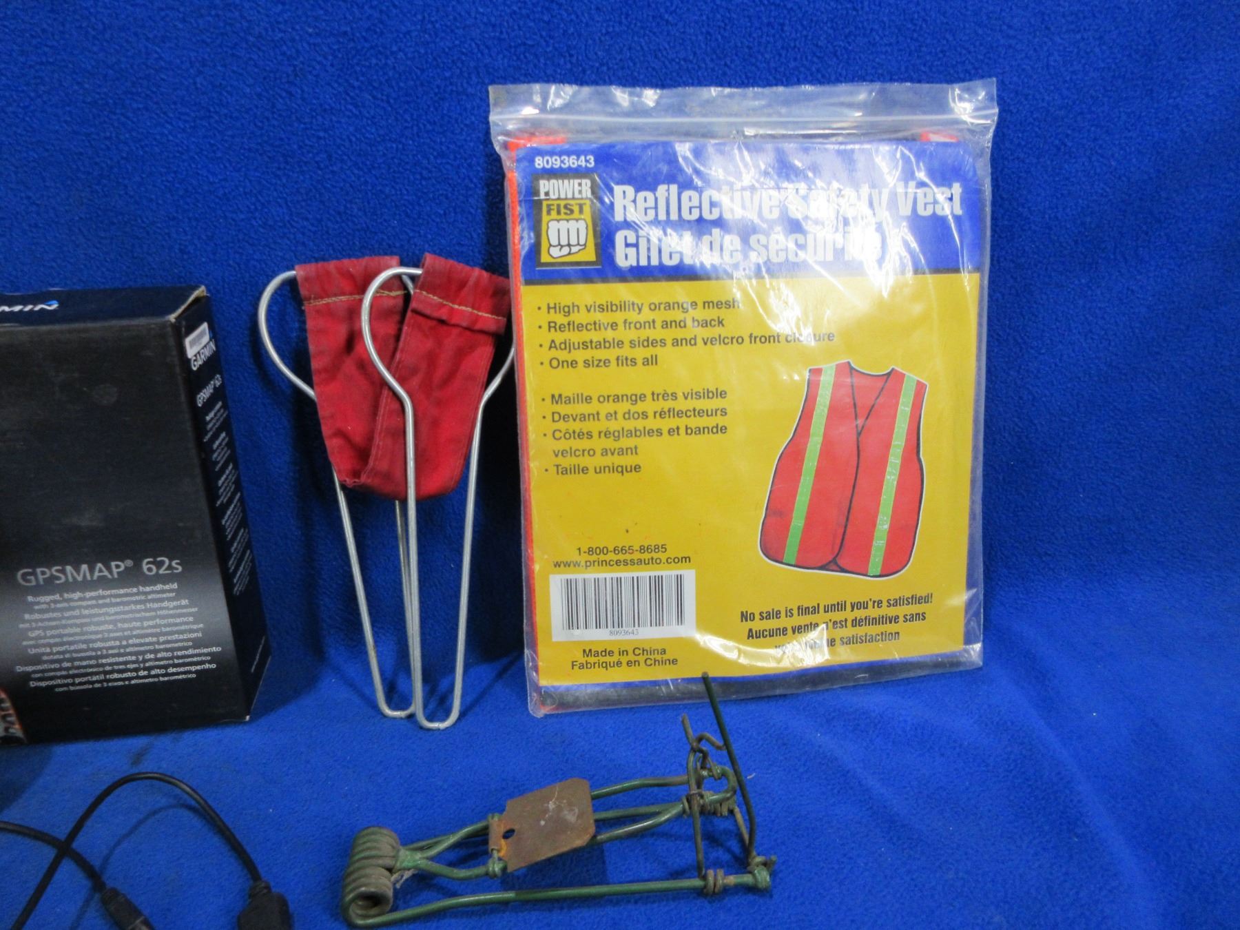 Lot 377 Lot of Misc. - Garmin GPS Map 62S, Safety Vest, Bird Carrier, Gopher Trap