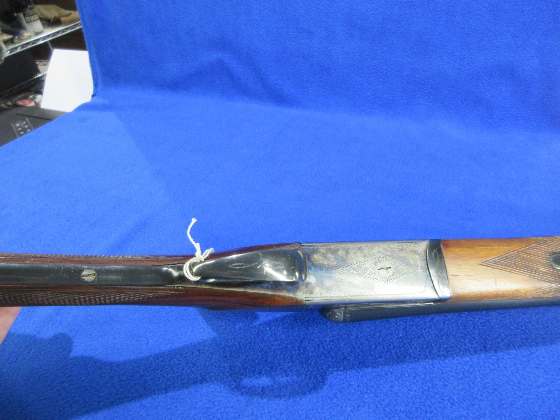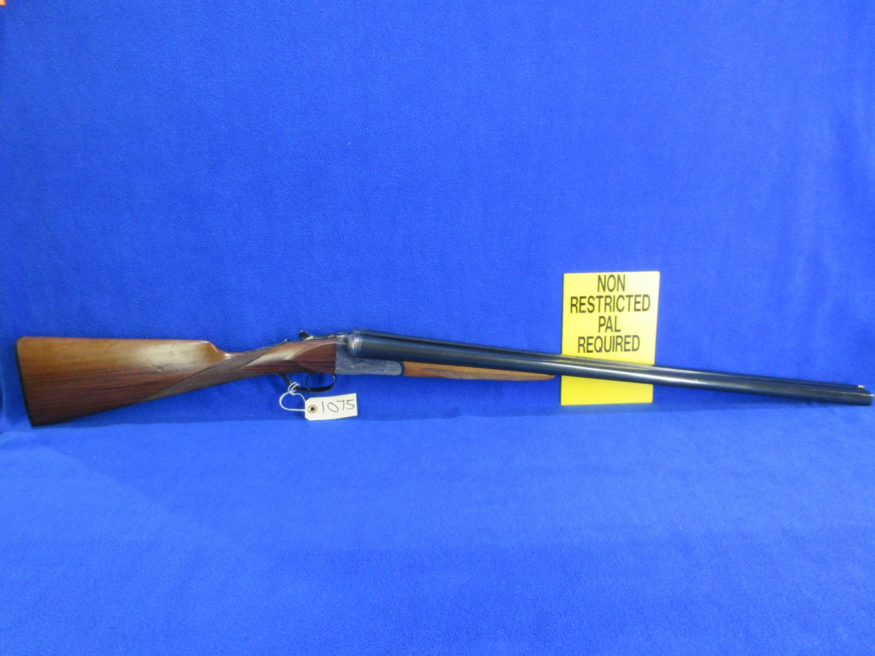 Non-Restricted - Laurona Eibar in 12 Ga. 2 3/4" - This is a tip up SXS shotgun, engraved case hardened action is tight and appears to be in good to very good working order. Barrels are 27 3/4", bores are good to very good, bluing is good with some very light pitting, has bead front sight, stock is good with usage marks, forearm is good with usage marks, butt plate good. Chokes appear to be full and mod (1 Star and 3 Star on the Barrels). Ser # 163095