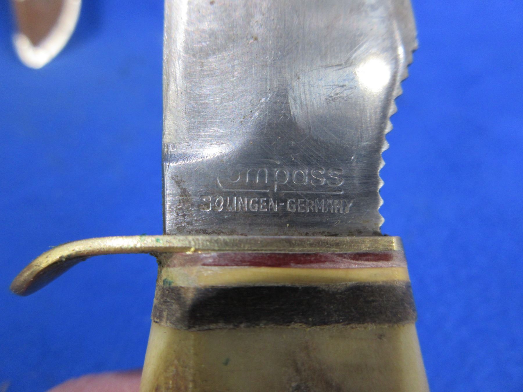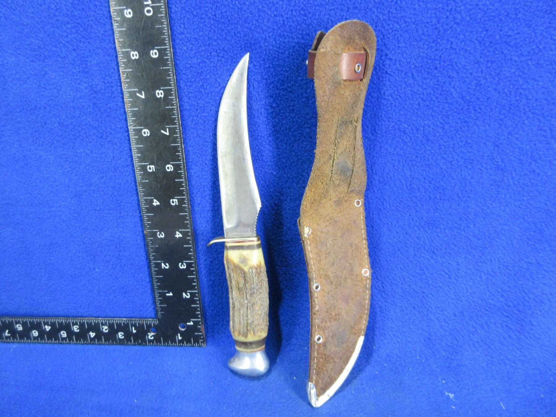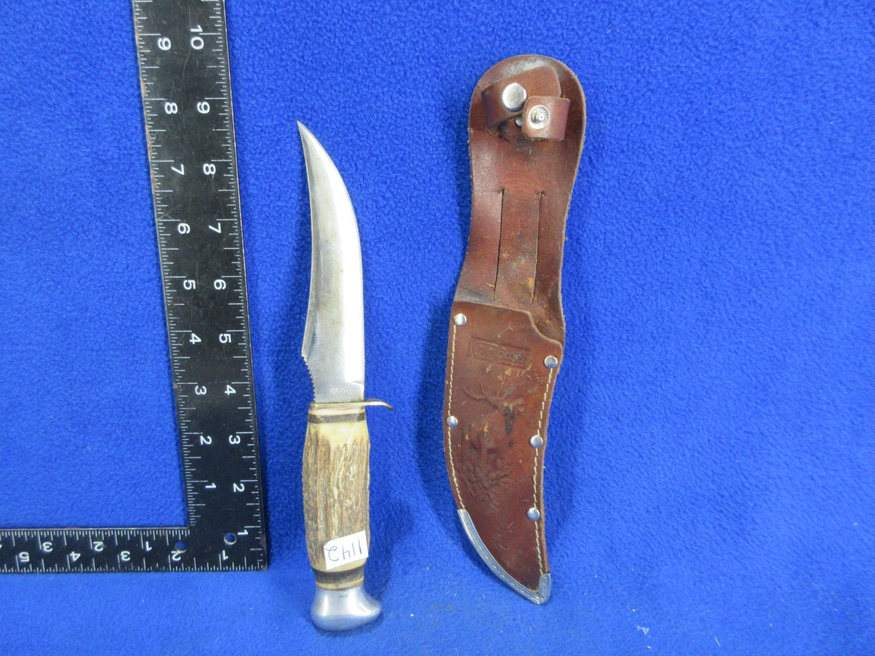 Lot 1142 Compass Fixed Blade Knife # 853 w/ Stag Handle & Compass Sheath