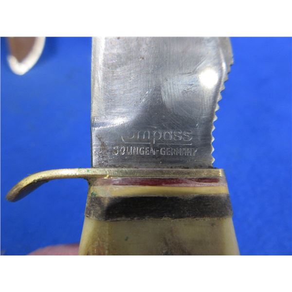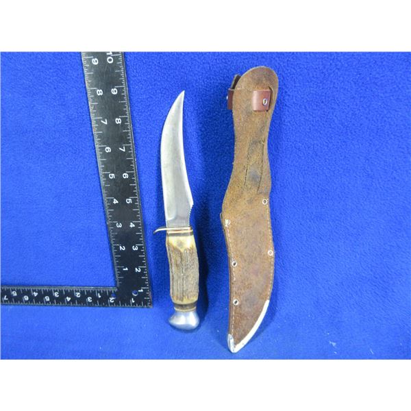 Compass Fixed Blade Knife # 853 w/ Stag Handle & Compass Leather Sheath - 5" Blade, 9" Total Length
