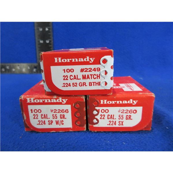 22 Cal. .224" Hornady Bullets - Sealed Box of 100 (55gr SX), Sealed Box of 100 (55gr SP W/C), Box of 65 (52gr BTHP Match)