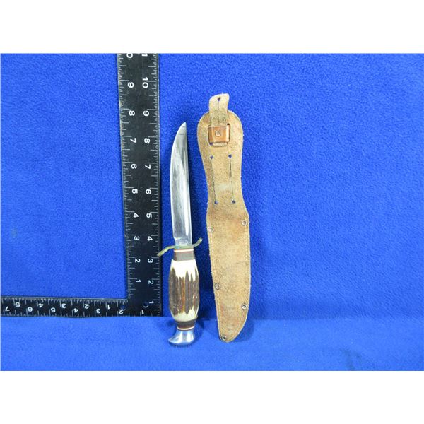 Vintage Mibro Solingen 828 Fixed Blade Knife with Leather Sheath - Stag Handle, 4 3/4" Blade, 8 3/4" Total Length