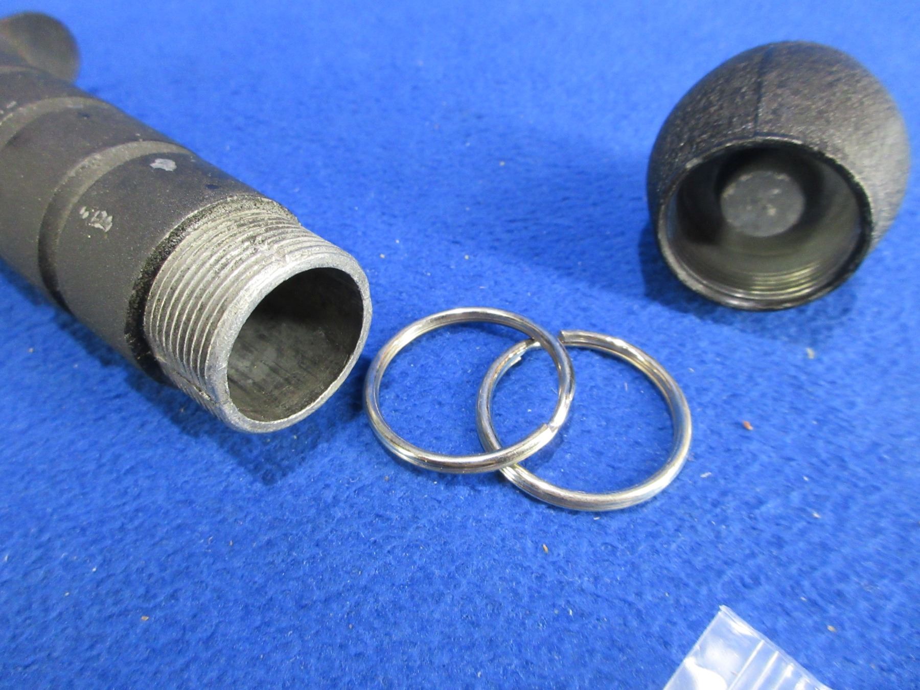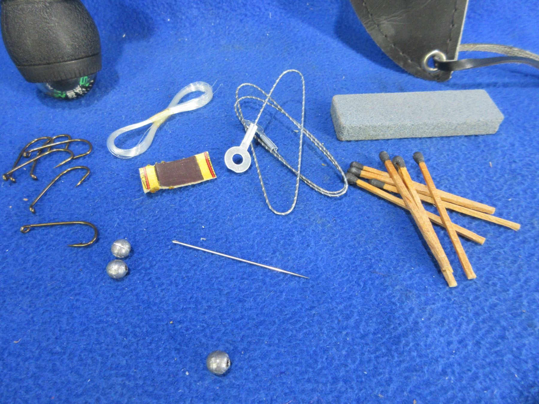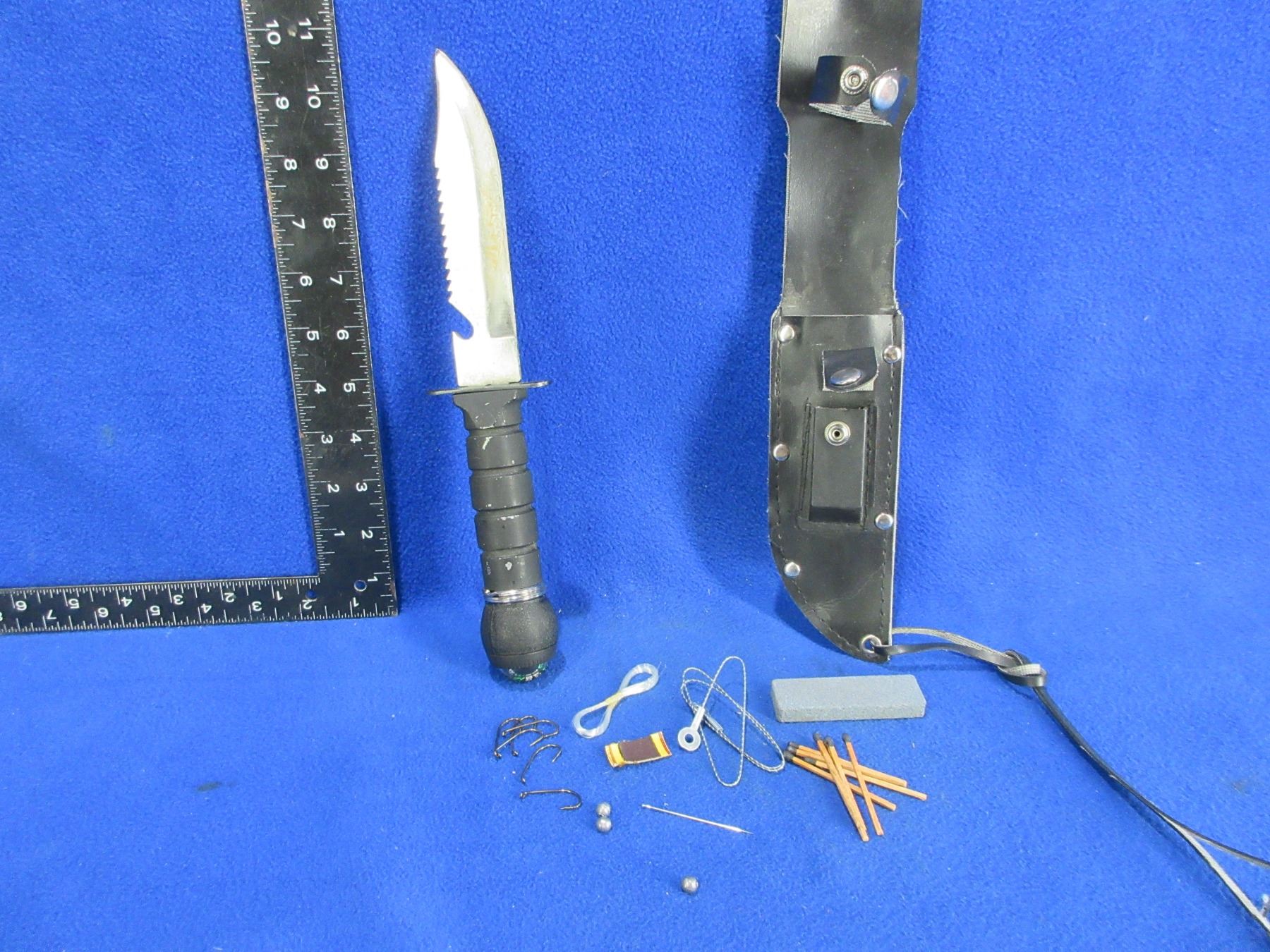 Hunting Survival Knife with Sheath - 420 Stainless Taiwan - 5 3/4" Blade. Has survival kit in the handle and sharpening stone in the sheath, handle has 2 key rings on the pommel threads and compass appears not working