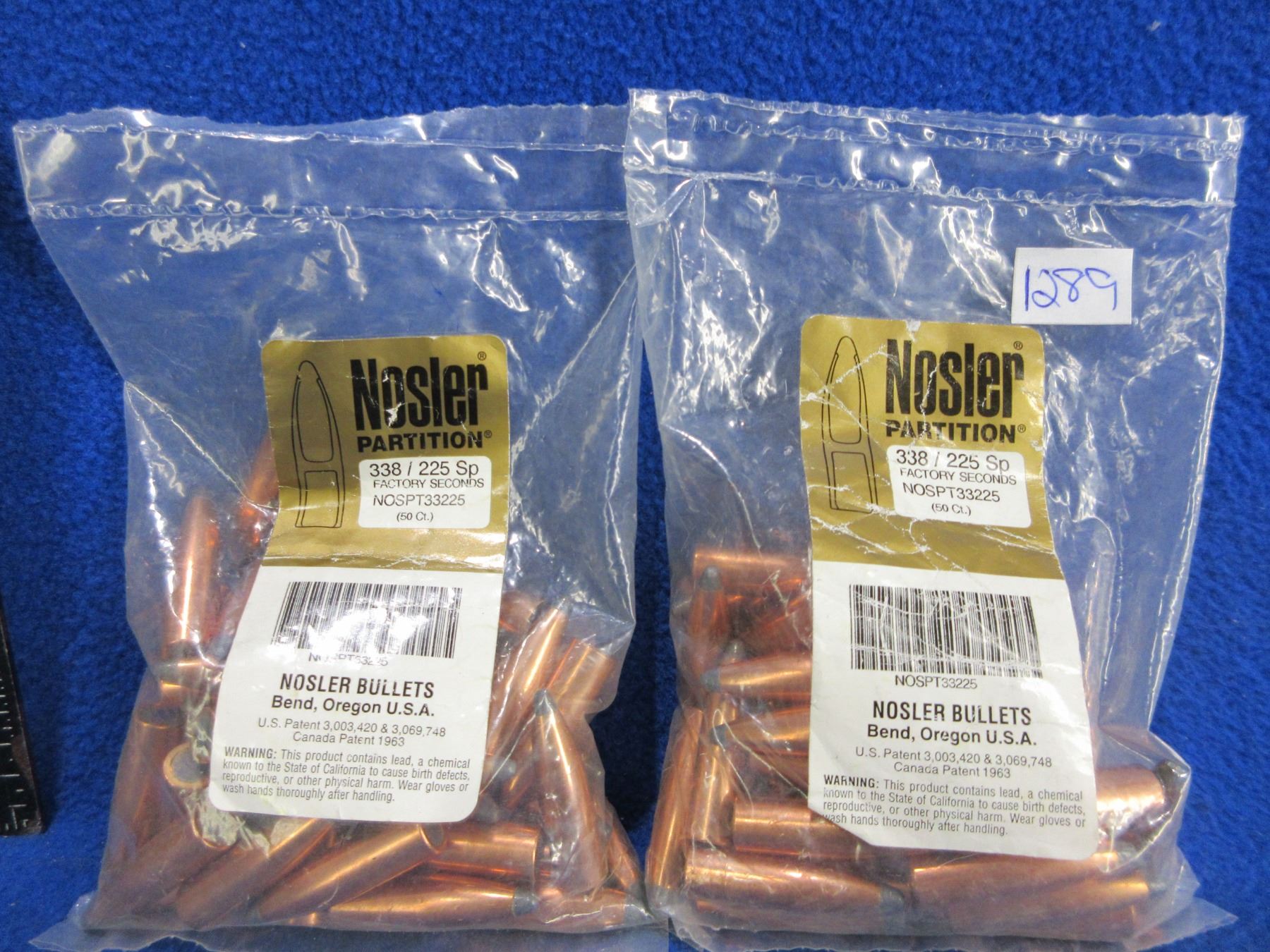 Lot 1289 338 Cal. .338" 225gr SP Nosler Partition Bullets - 2 Sealed Bags of 50