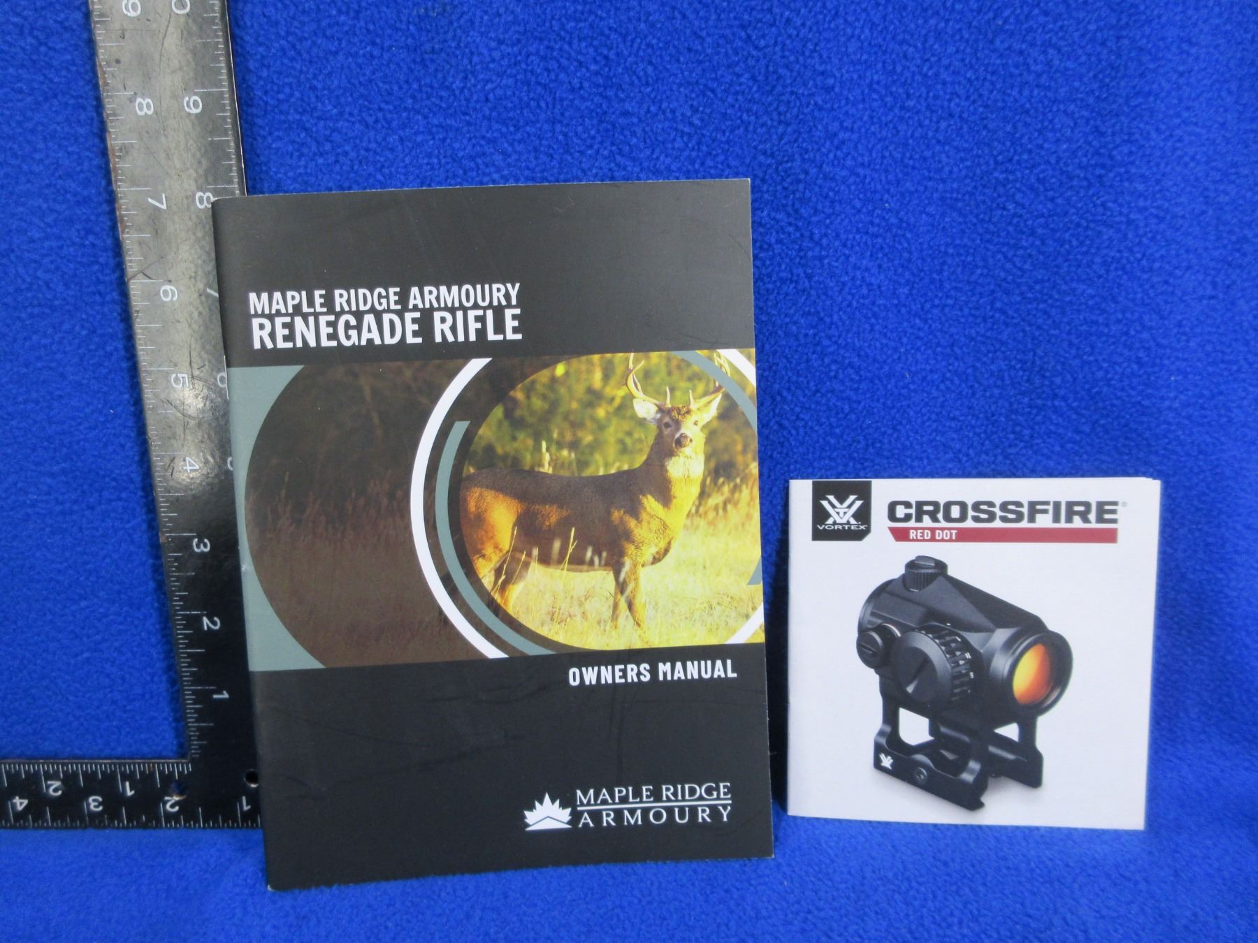 NEW - Never Fired, Never Used - Non-Restricted - Maple Ridge Armory Renegade in 223 Wylde (223/5.56 NATO) - This is a straight pull bolt rifle with removable magazine. Barrel is 12 1/2" with threaded muzzle protector. Black Nitride finish, has no sights but has Vortex Crossfire Red Dot. Comes with lens covers, manual and Vortex Red Dot manual. Adjustable stock, length of pull is 13 1/2". Approx. $1300.00 Retail. Ser # 2000727
