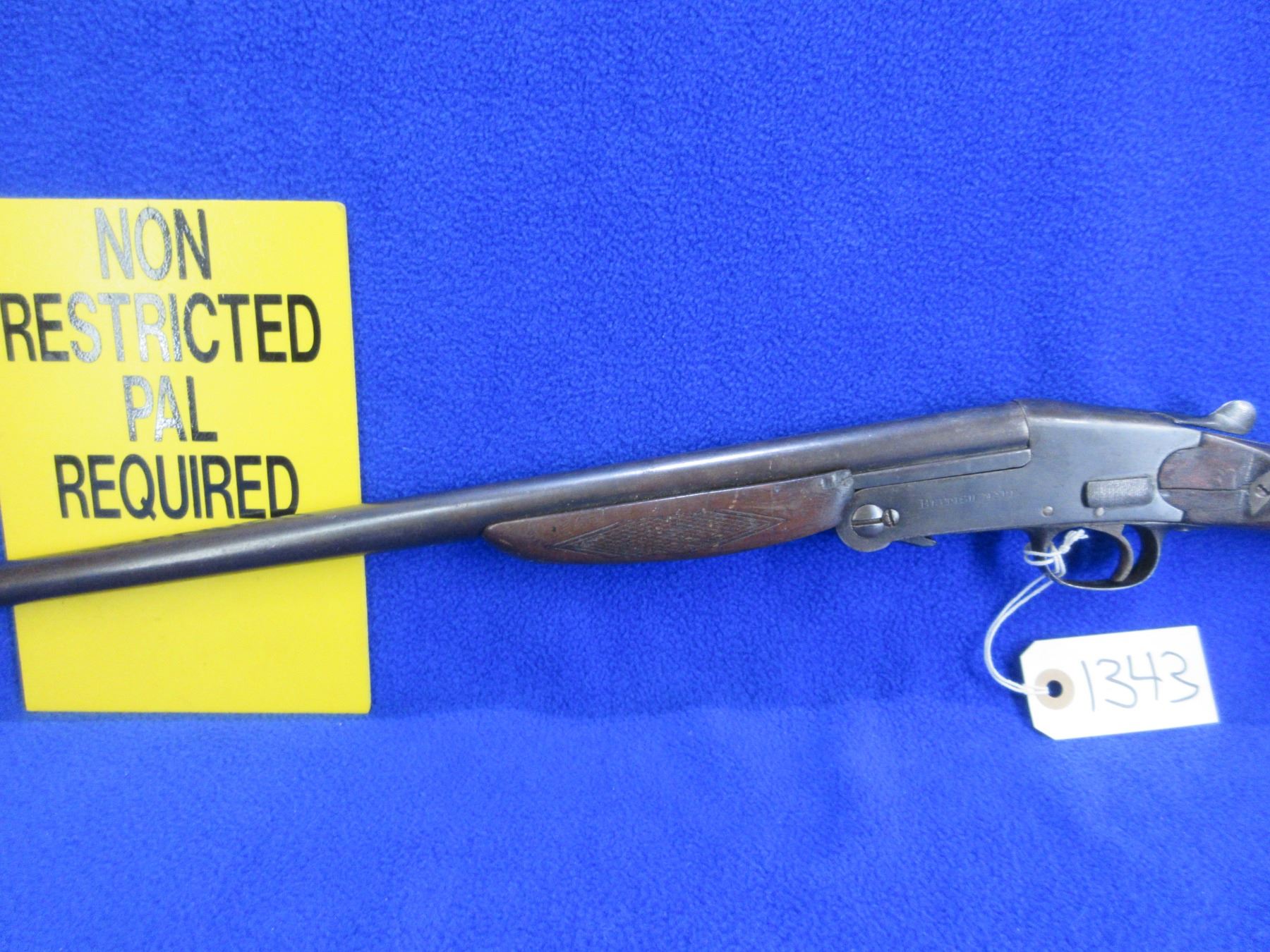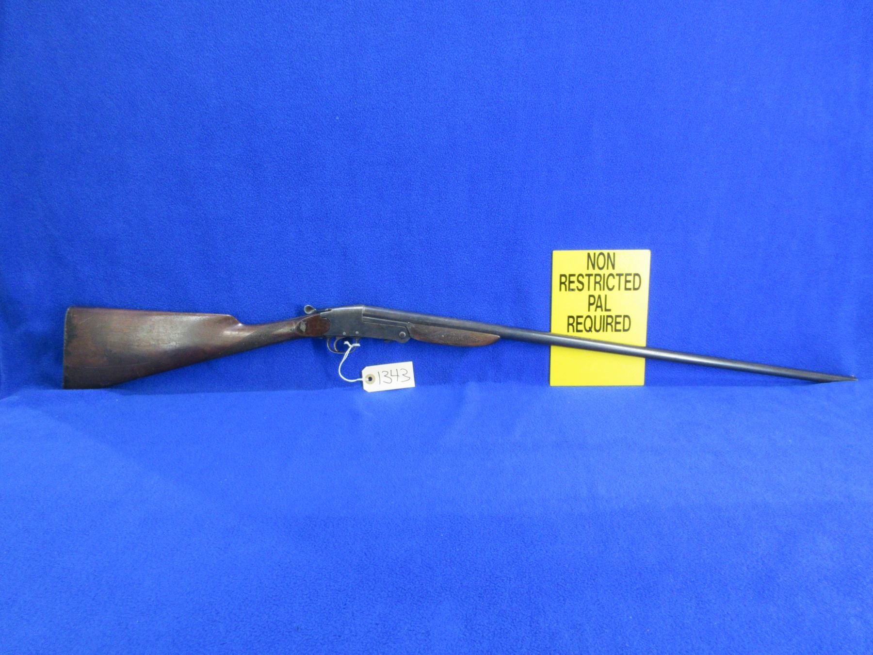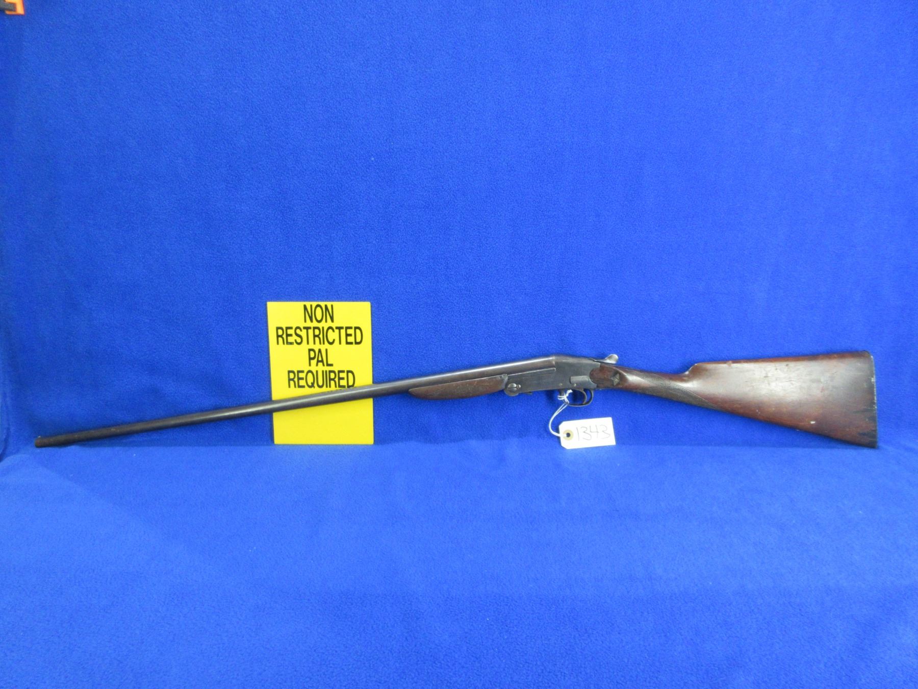 Non-Restricted Carswell Single Shot in 410 Ga. 2 3/4" - This is a tip up single shot shotgun, action is tight and appears to be in working order but should not be fired as stock is broken. Barrel is 26 5/8", bore is good, bluing is good but has light pitting and is turning brown, has bead front sight, stock has multiple cracks in the wrist area, length of pull is 14", forearm has a crack underneath at the back, metal butt plate poor. Ser # 3883