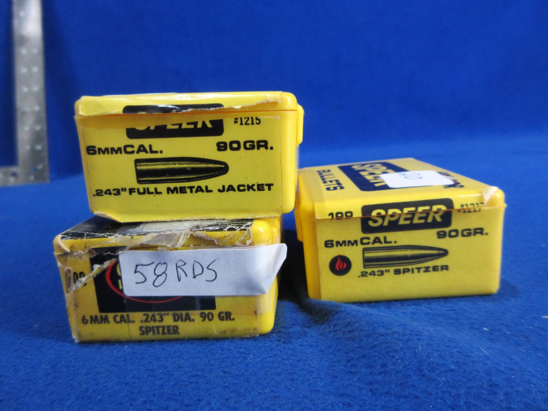 Lot 1353 6MM .243" 90gr Speer Bullets - Box of 58, 20 (Spitzer), Box of 20 (FMJ)