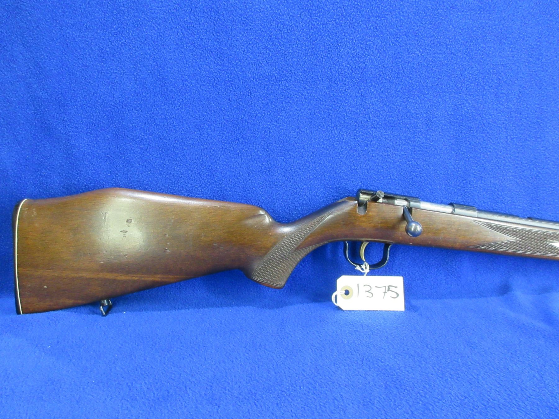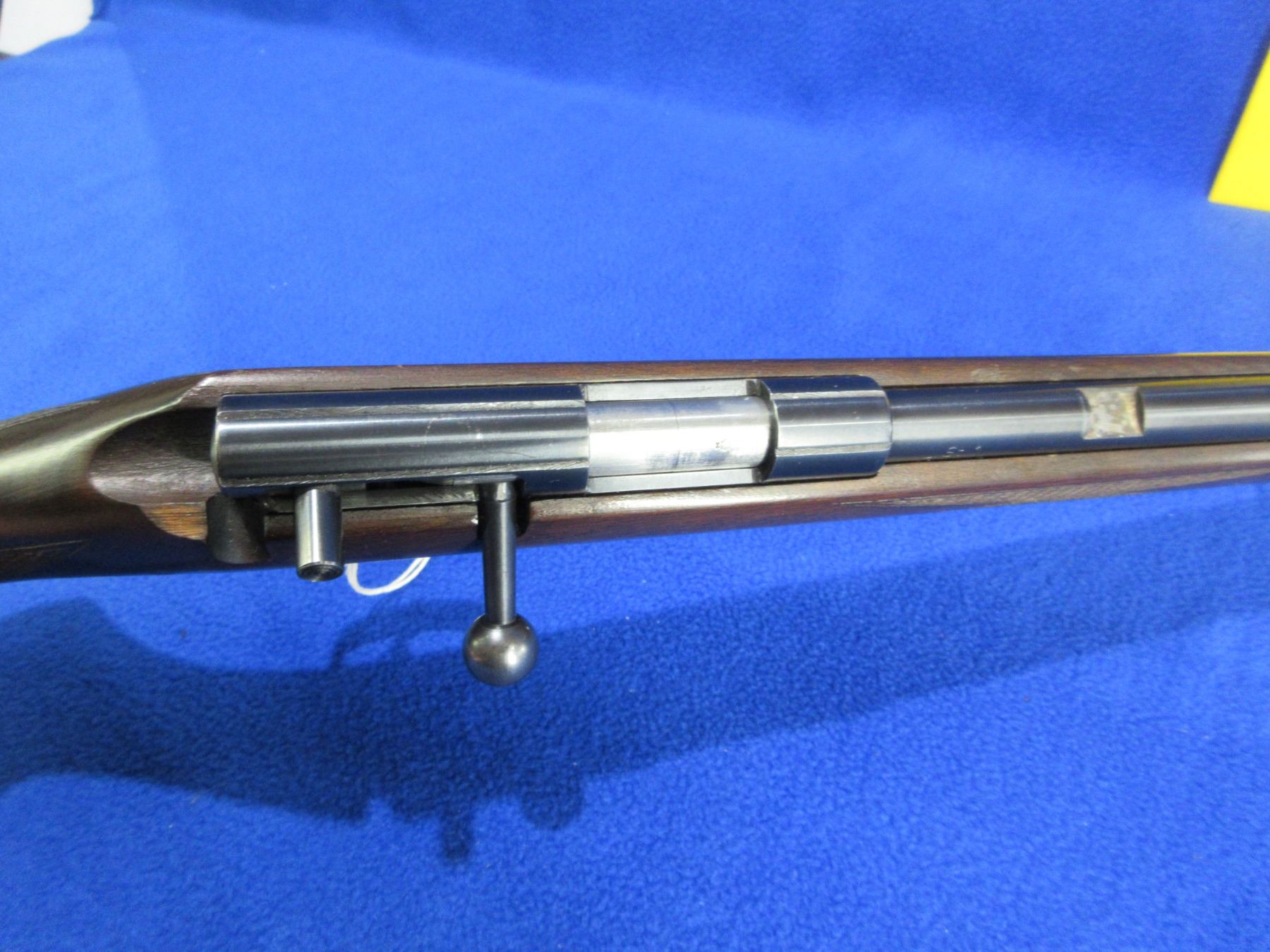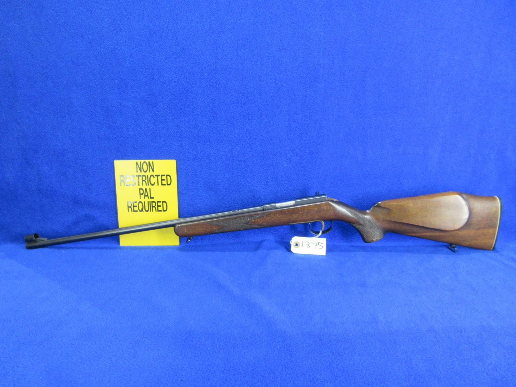 Non-Restricted - Voere Made in Germany in 22 LR - This is a single shot bolt action rifle, action appears to be in good to very good working order. Barrel is 21 1/2", rifling is good to very good, bluing is good to very good, has front sight, missing rear sight but has integral base, stock is good with usage marks, length of pull is 14", butt plate good, comes with swivels. Ser # 567196