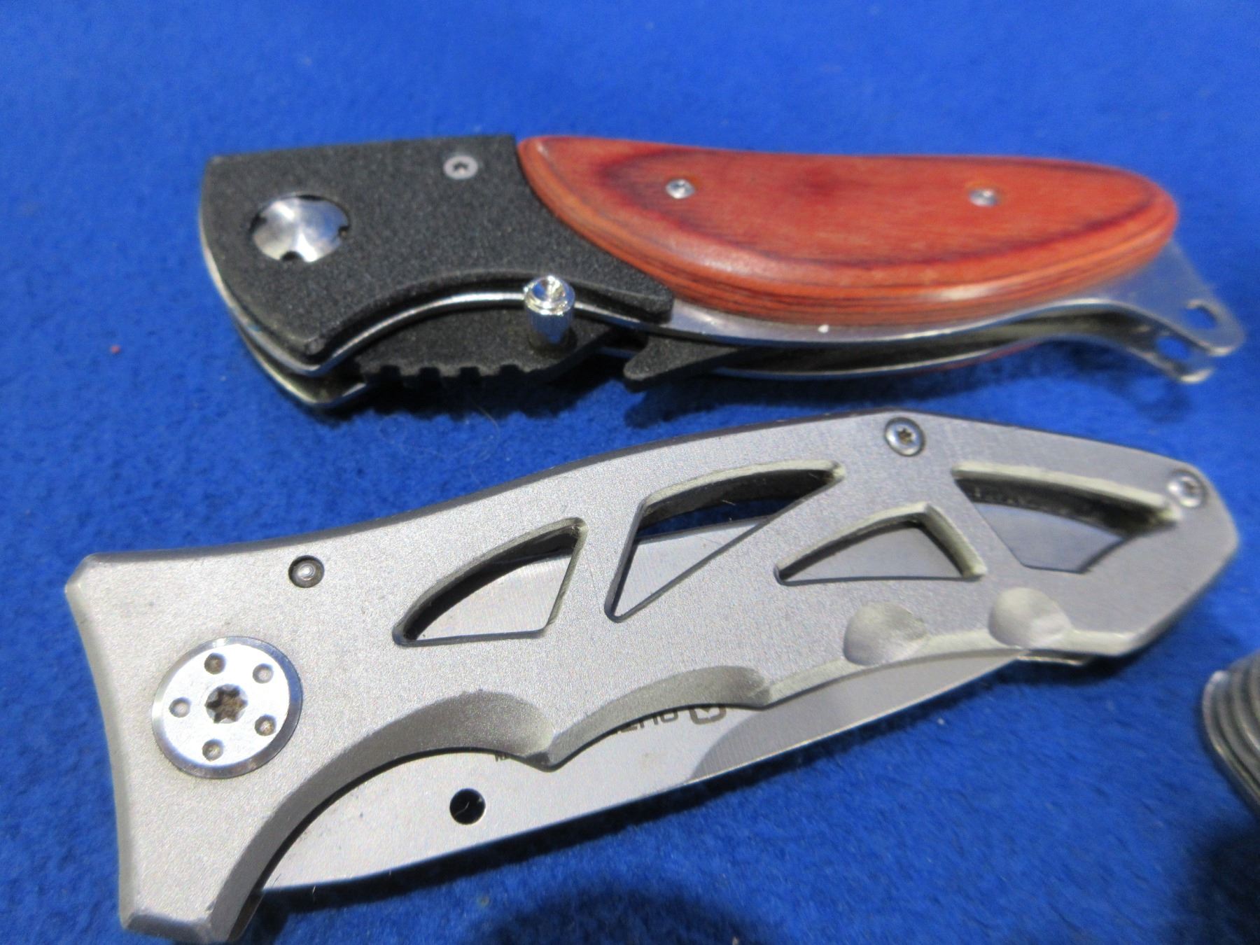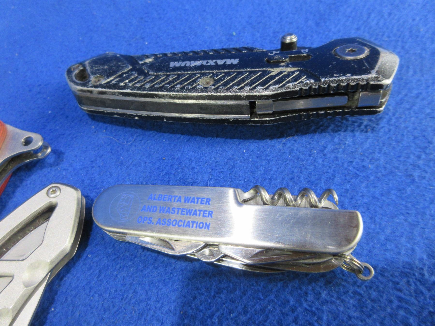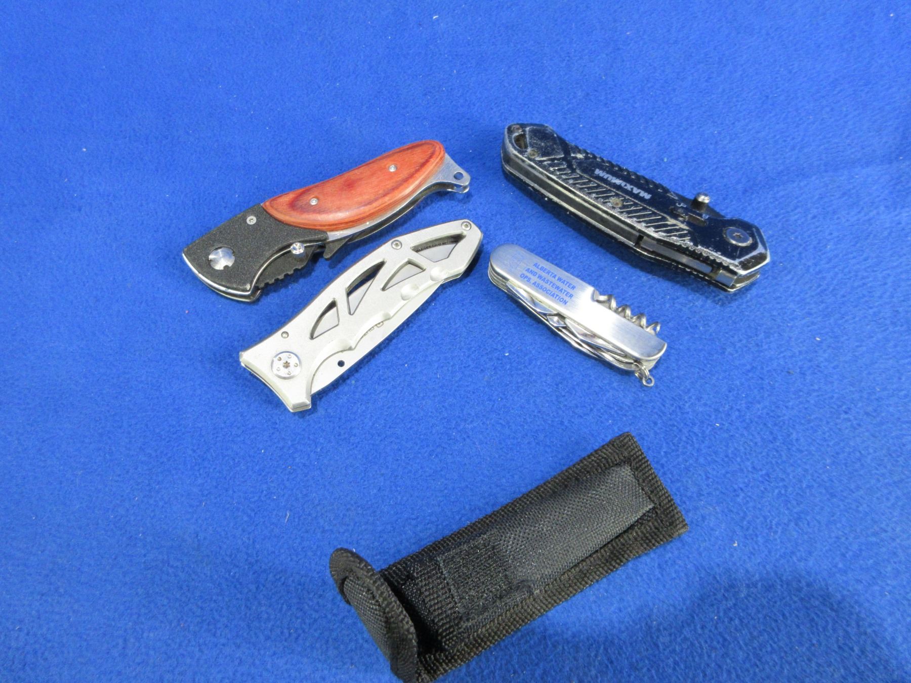 4 Folding Pocket Knives - 3 are Lock Blade, 1 is Swiss Style w/ Sheath