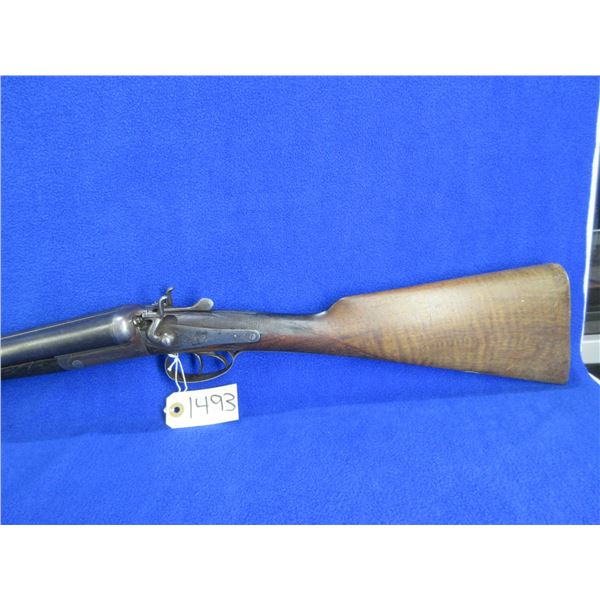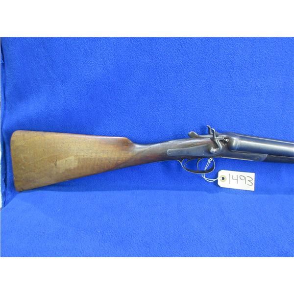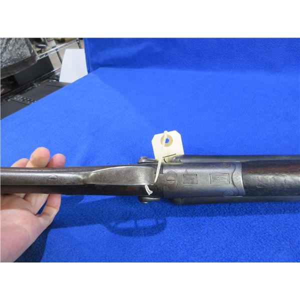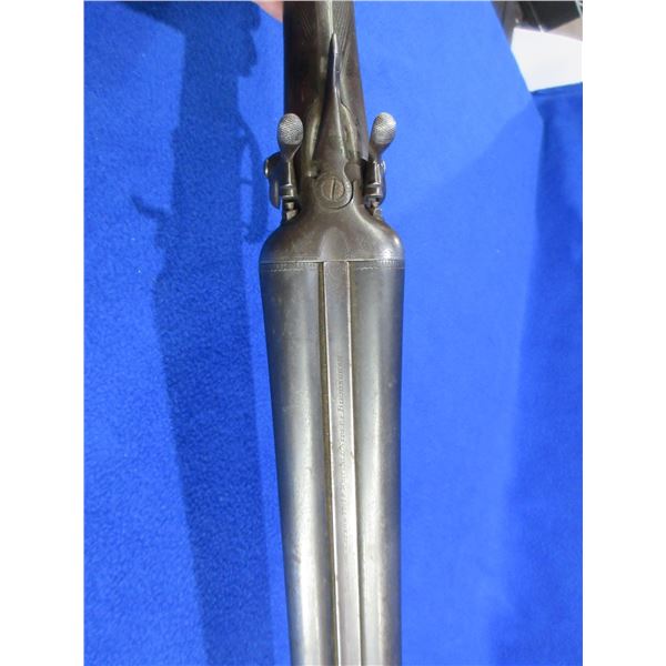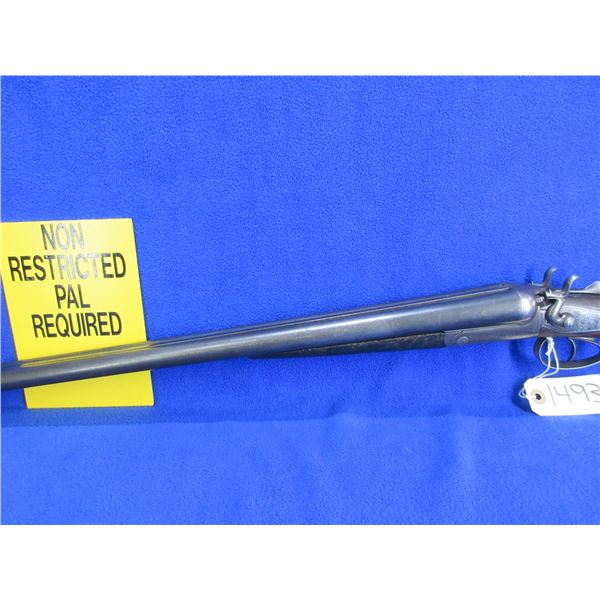 Non-Restricted - Powell & Son SXS in 12 Ga. 2 1/2" - This is a tip up SXS hammer shotgun, action has a small amount of play and appears to be in working order. Barrels are 30", bores are fair to good to but have straight lines that appear like grooves , bluing is turning grey with rust and pitting, has bead front sight, stock is good for age with many usage marks, length of pull is 14", forearm is good for age with many usage marks. Ser # 148