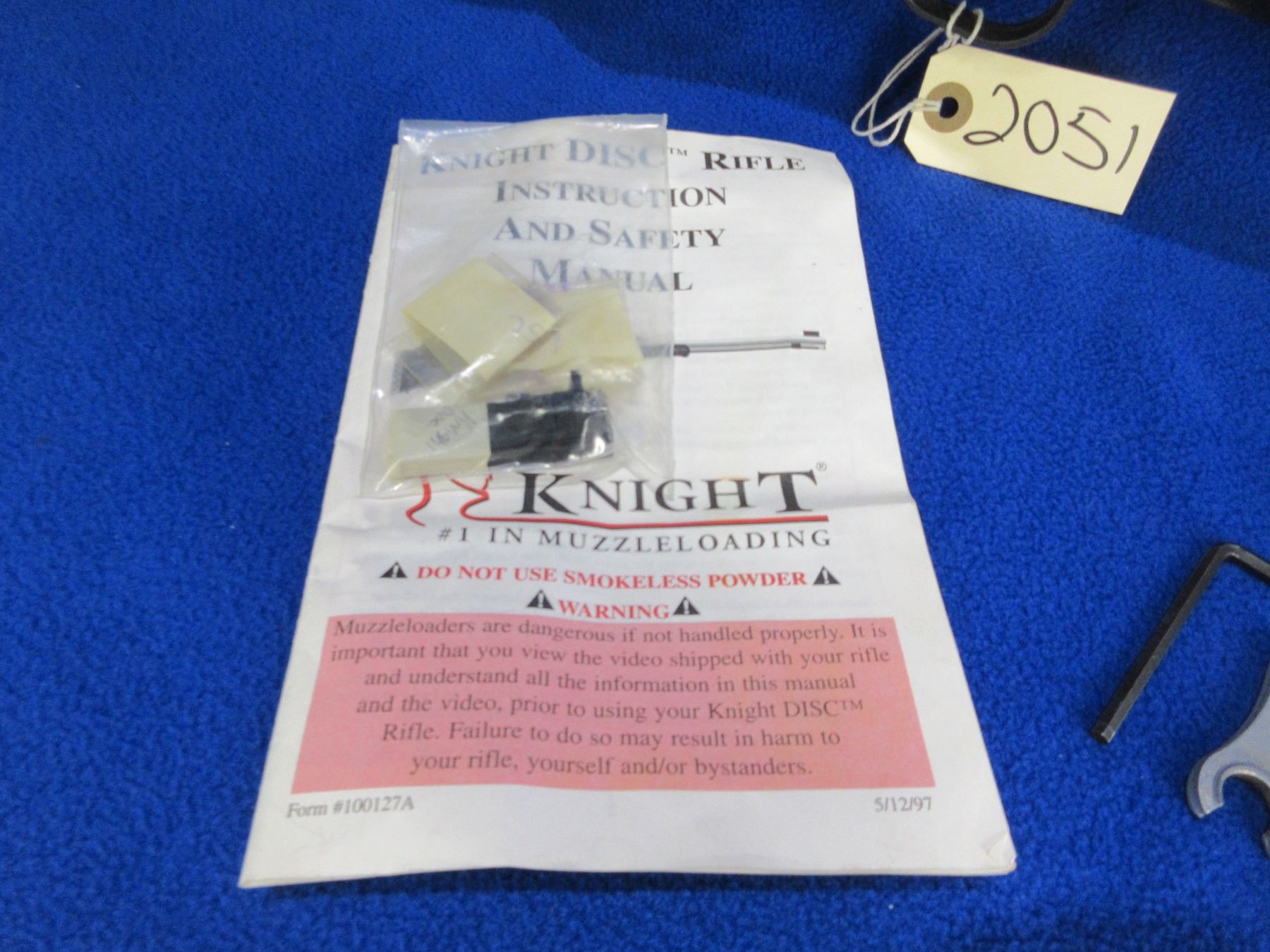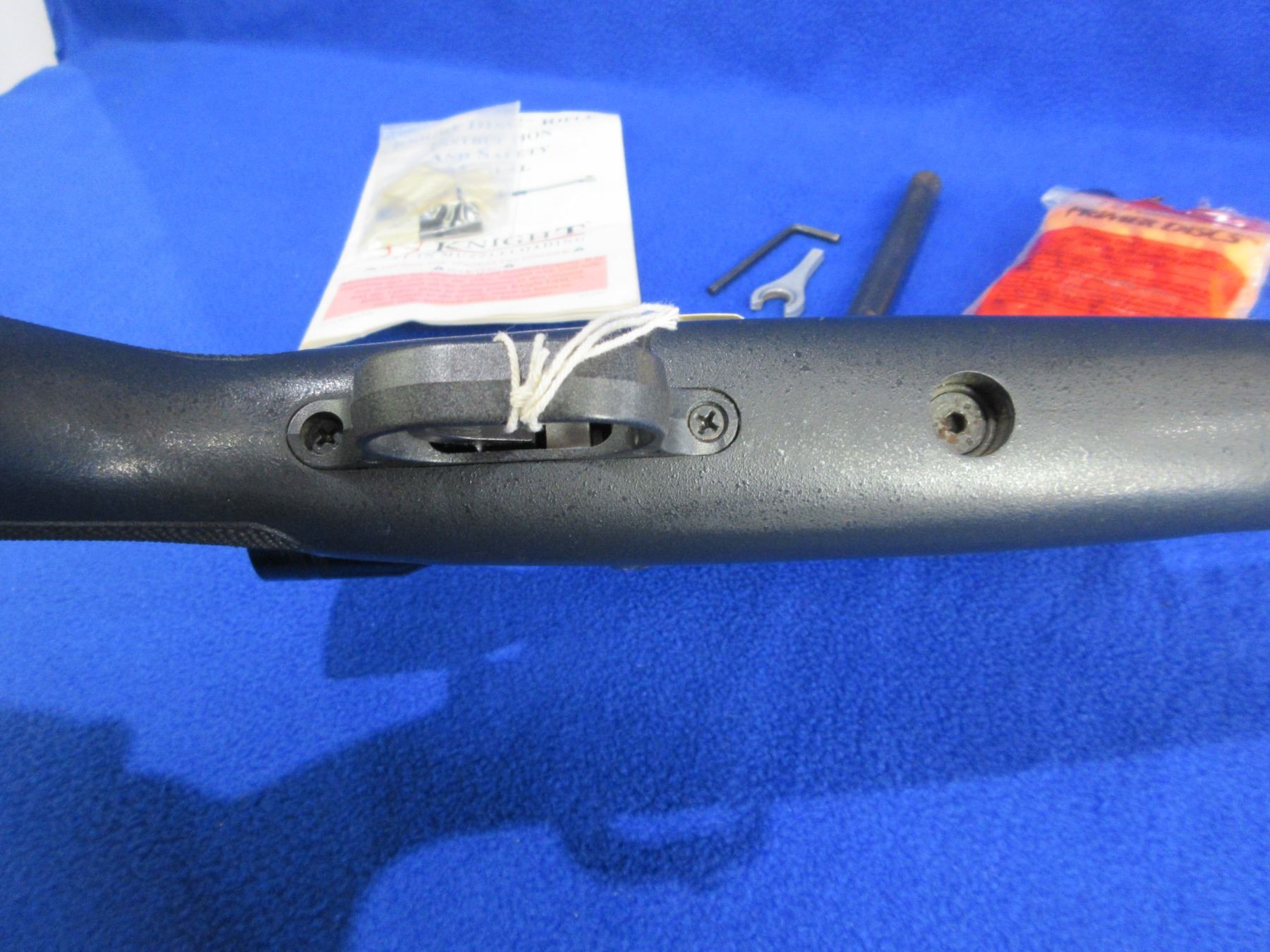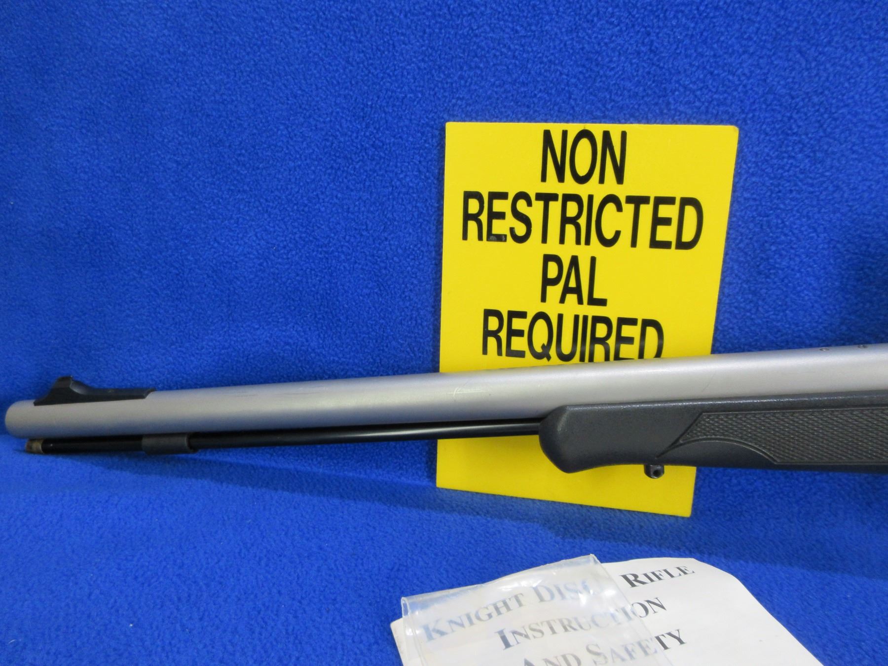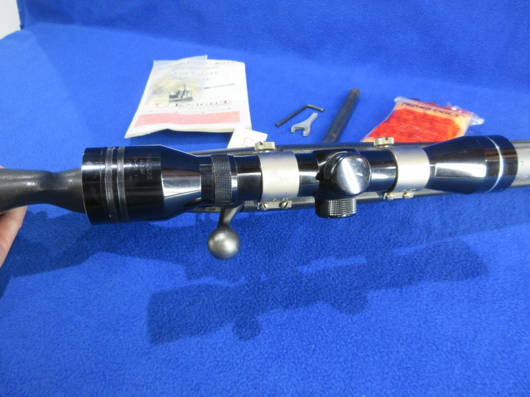 Non-Restricted - Knight D.I.S.C. Inline in 50 Cal. - This is a bolt action muzzleloading 209 primer rifle, action appears to be in good to very good working order. Stainless barrel is 22 3/4", rifling appears good, stainless finish is good, has front sight (rear sight in bag), has Tasco 4x32 sccope with Weaver rings - appears clear - duplex reticle, sunthetic stock is good, length of pull is 14 1/2", rubber recoil pad good, comes with swivel studs, ram rod, primer disks, chamber plug wrench and instruction manual. Ser # S005106