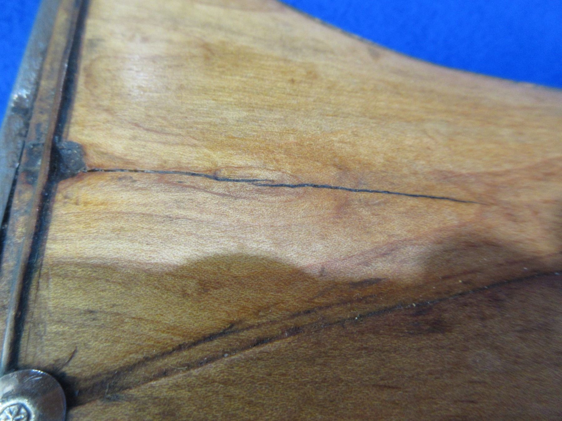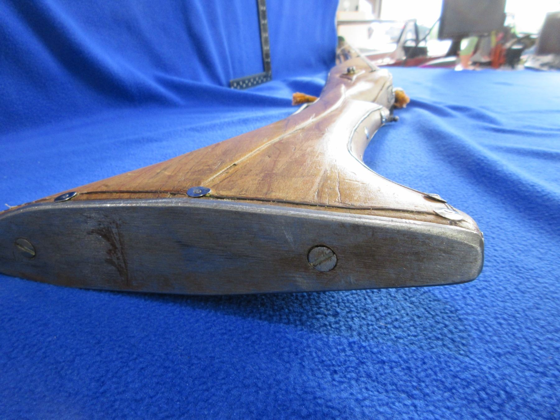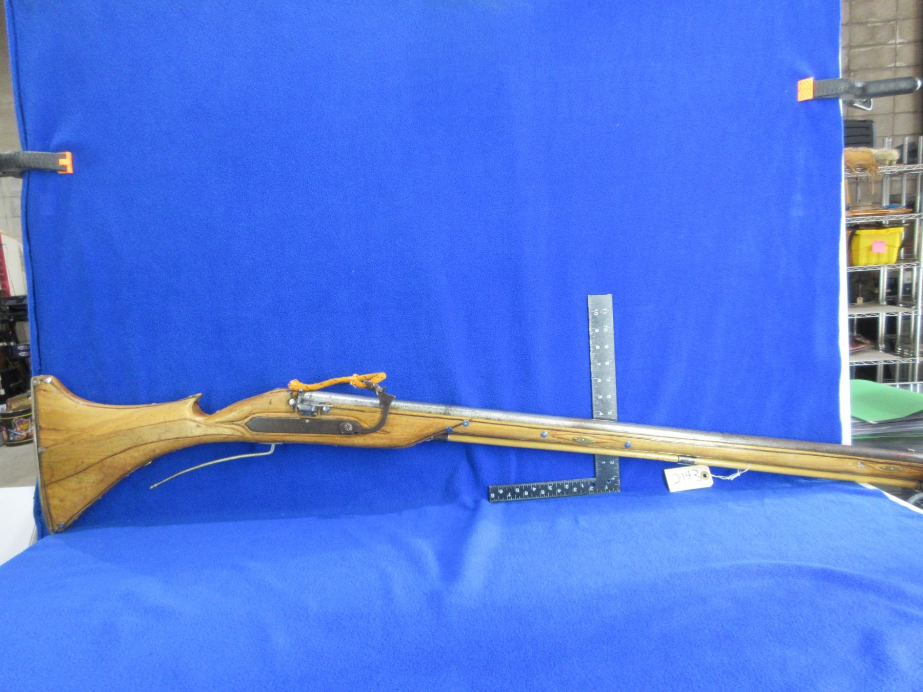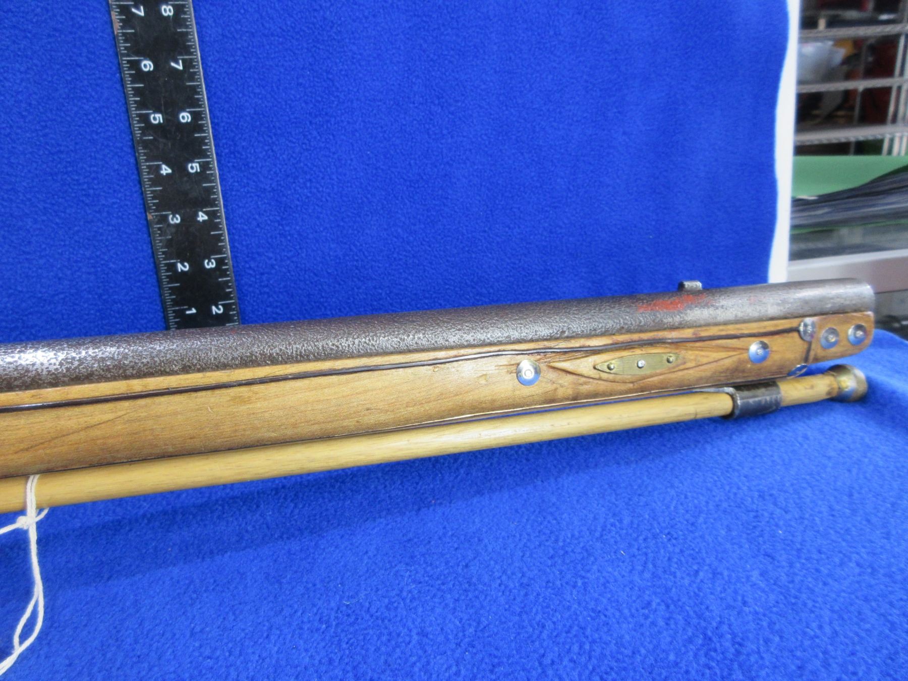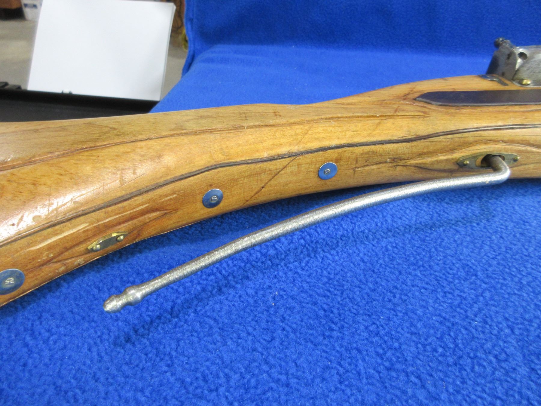 Replica Matchlock Rifle in approx 75 Cal. - This is a replica only, trigger does move the hammer. Silver finish on 39" barrel is pitted. Stock has a unique design but does have drying cracks on the butt. Stock is inlaid with copper wire, metal butt plate, comes with ram rod, 55" overall length. This is a unique wall hanger that anyone can own.