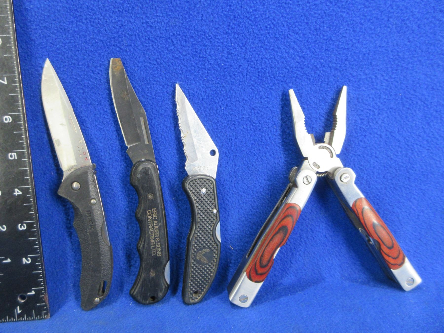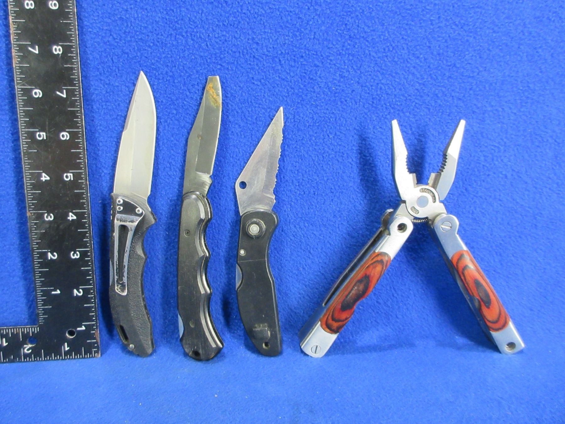 3 Folding Blade Lock Knives & Multi-Tool Pliers - Blade Tip Missing on 1 Knife