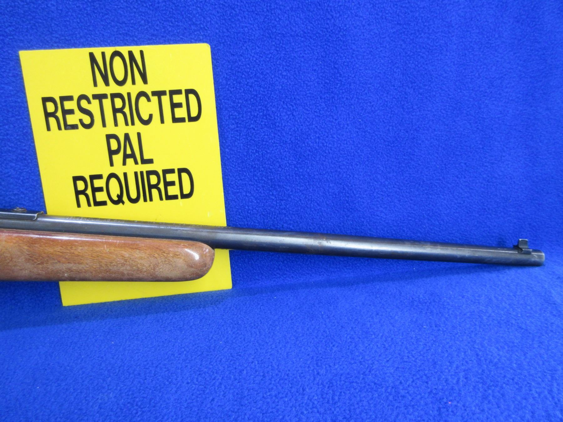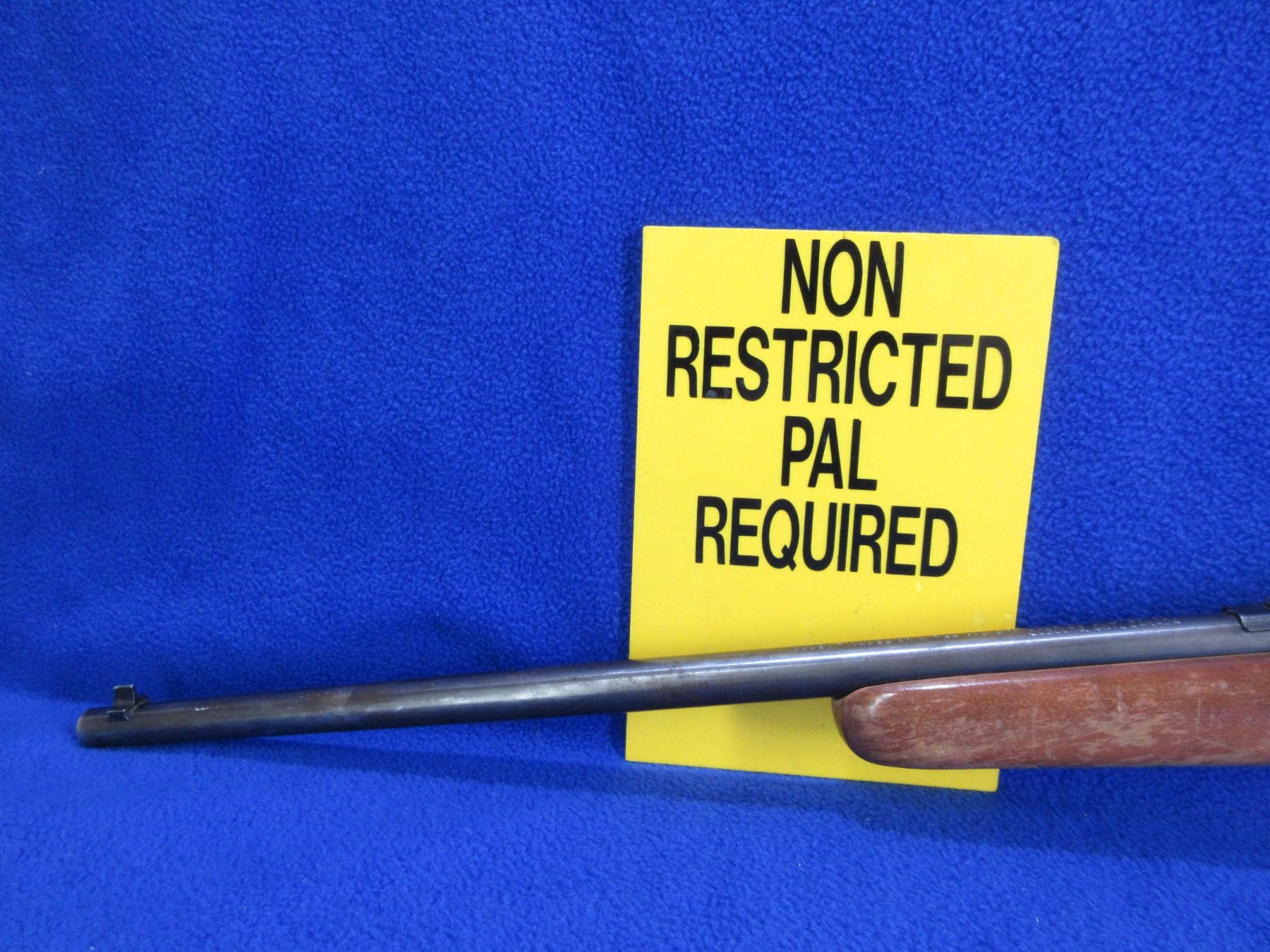 Non-Restricted - Cooey by Winchester Model 64A in 22 LR - This is a semi-auto rifle with removable magazine, action appears to be in good to very good working order. Barrel is 20", rifling is good, bluing is good with wear patches and light pitting, has both sights and integral rail, stock is good with usage marks and finish flaking, length of pull is 13", butt plate good. Ser # None