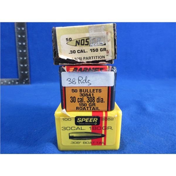 30 Cal. .308" Speer, Nosler and Barnes Bullets - Box of 70 (Speer 180gr BT), Box of 50 (Nosler 150gr ), Box of 38 (Barnes 150gr BT)