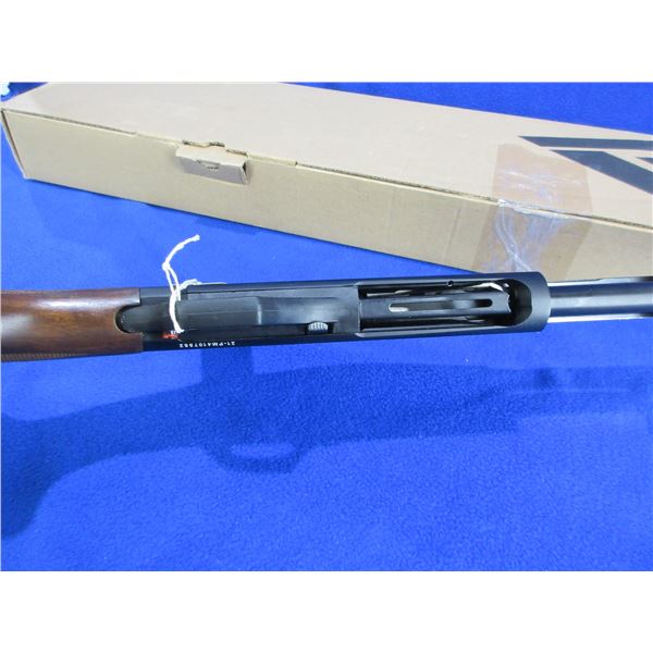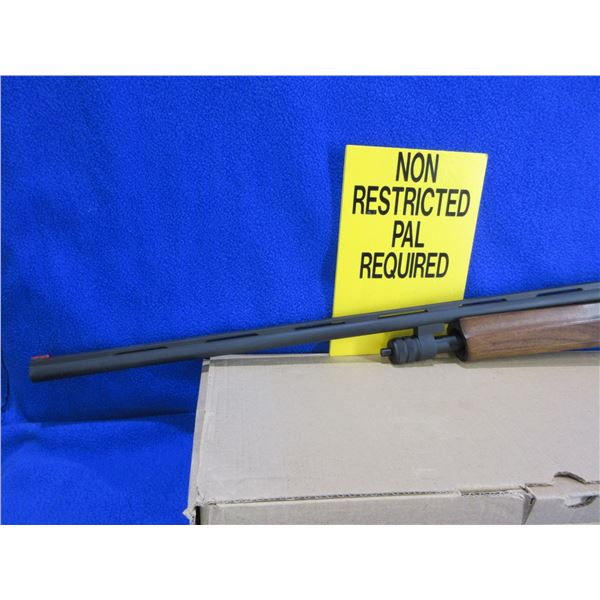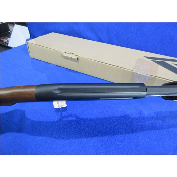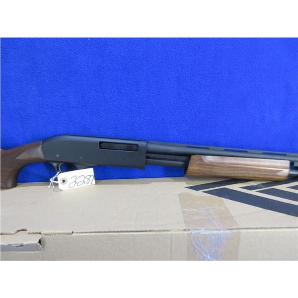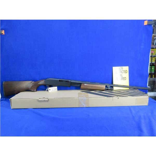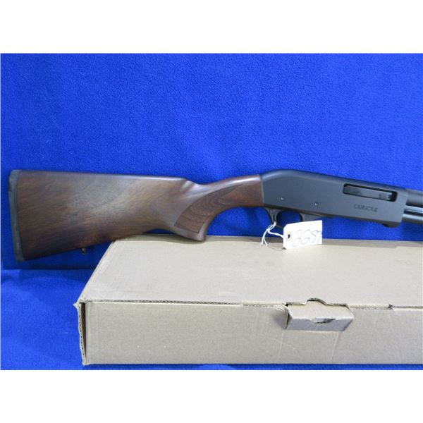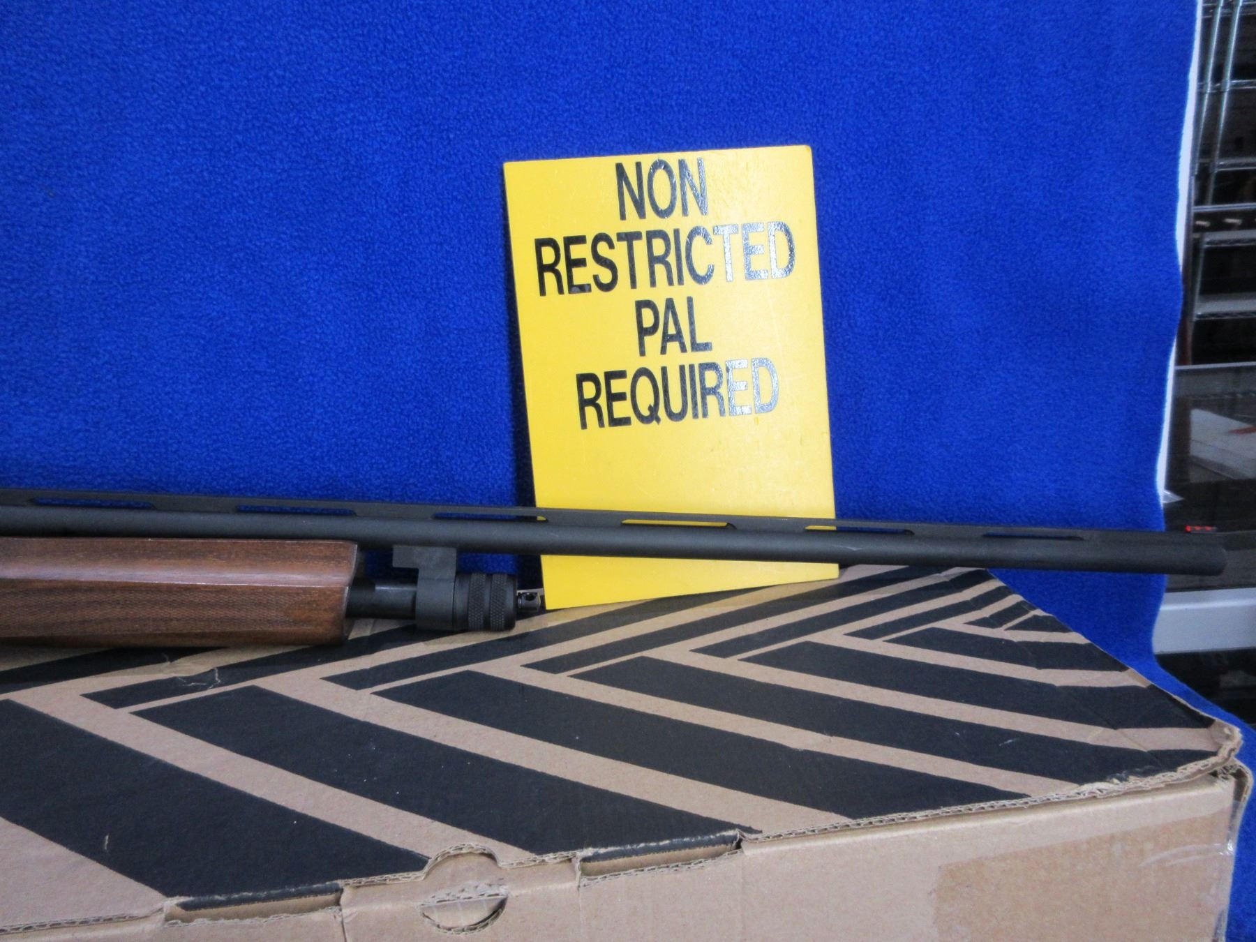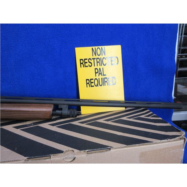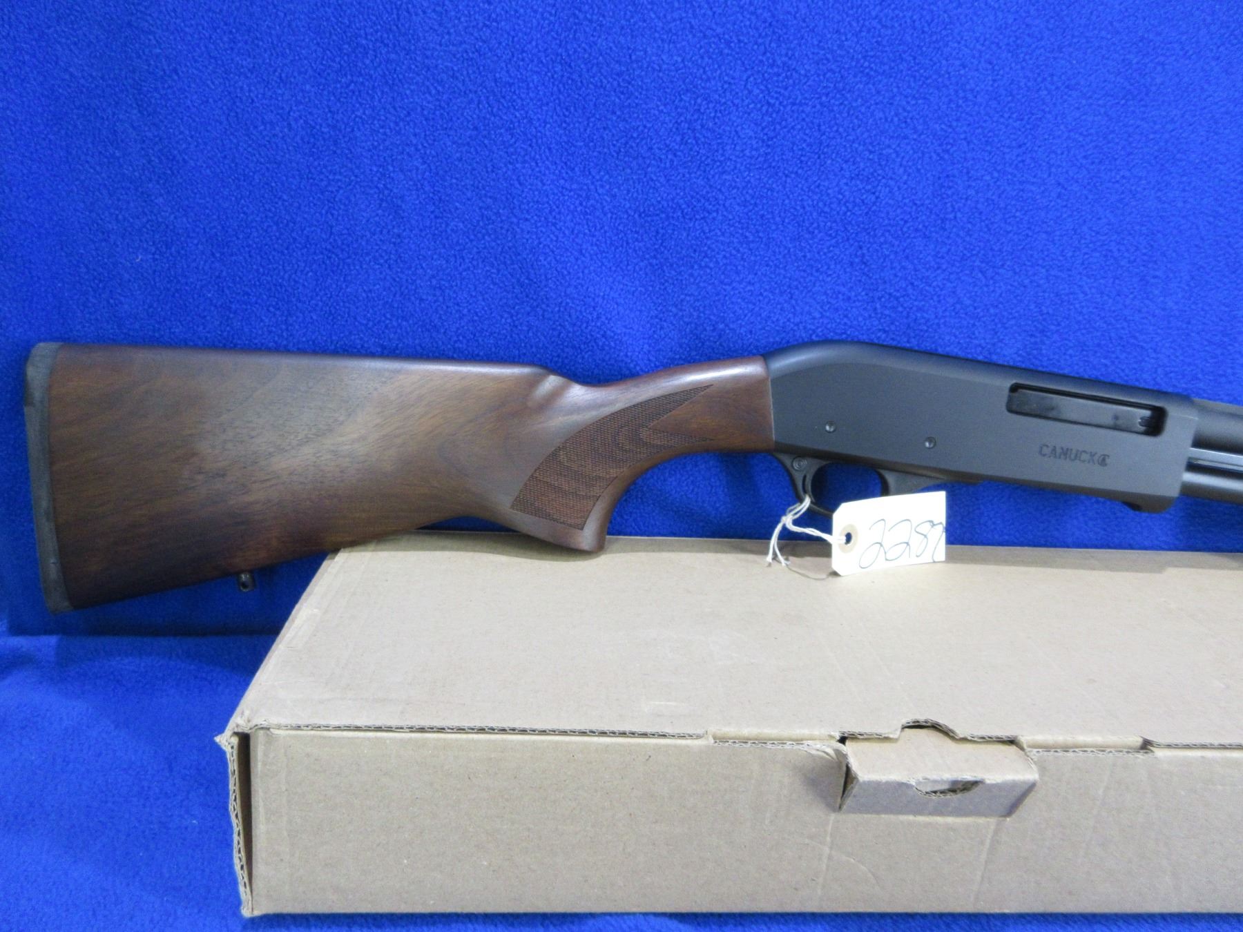 Non-Restricted - Khan Arms Canuck in 410 Ga. 3" - This is a pump action shotgun with tube magazine and removable chokes, action appears to be in good to very good working order. Vent rib barrel is 26", bore is good to very good, black finish is good with some light scratches, has fiber optic front sight, stock is very good, length of pull is 14", forearm is very good, rubber butt plate good, comes with swivel studs, five chokes, choke wrench user manual and original box. Ser # 21-PM4107582