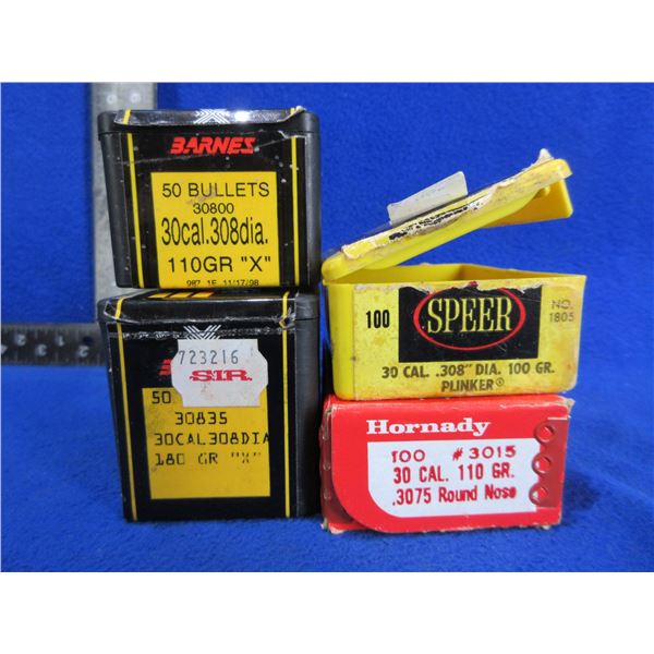 30 Cal. .308" Speer, Hornady and Barnes Bullets - Box of 56 (Speer 100gr Plinker), Box of 84 (Hornady 110gr RN ), Box of 46 (Barnes 180gr X), Box of 50 (Barnes 110gr X)