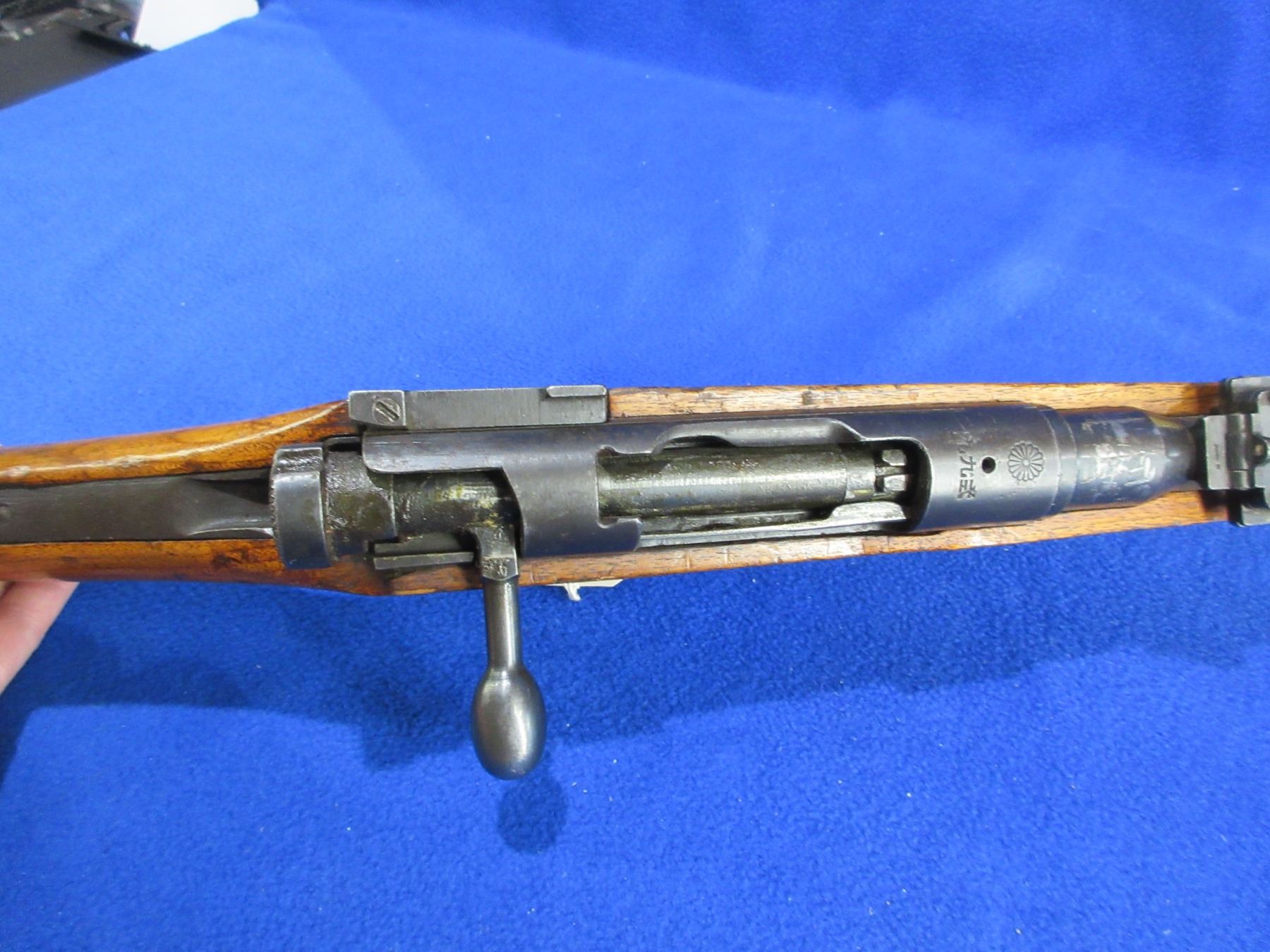 Non-Restricted - Japanese Arisaka Type 99 Nagoya Arsenal in 7.7X58 Cal. - Chrysanthemum stamped on action - This is a bolt action rifle with floorplate magazine, action appears to be in working order. Barrel is 25 1/2", rifling is good, bluing fair to good with scratches, has both sights, full wood stock and hand guard are good for age with many usage marks, length of pull is 12 1/2", metal butt plate good, comes with swivels. Ser #37783