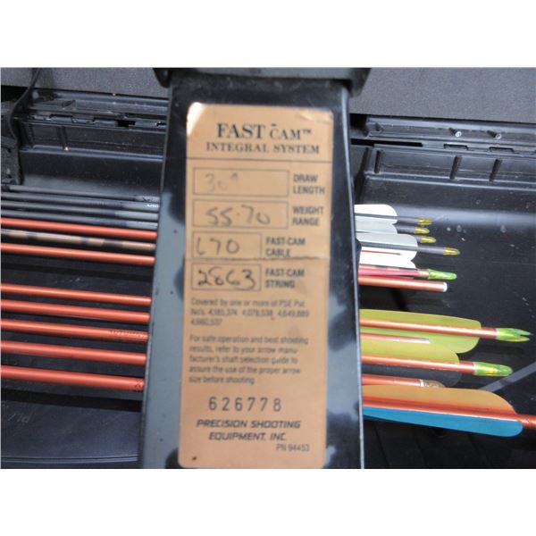 PSE Elite Series Graphite Compound Bow with Plano Hard Case - Draw Length 30", Weight Range 55-70 lbs. Plano Protector Series Model 1111 Pillarlock Single Bow Case - Outside Dimensions - 49" x 19.5" x 6.5" - Comes with 12 Arrows
