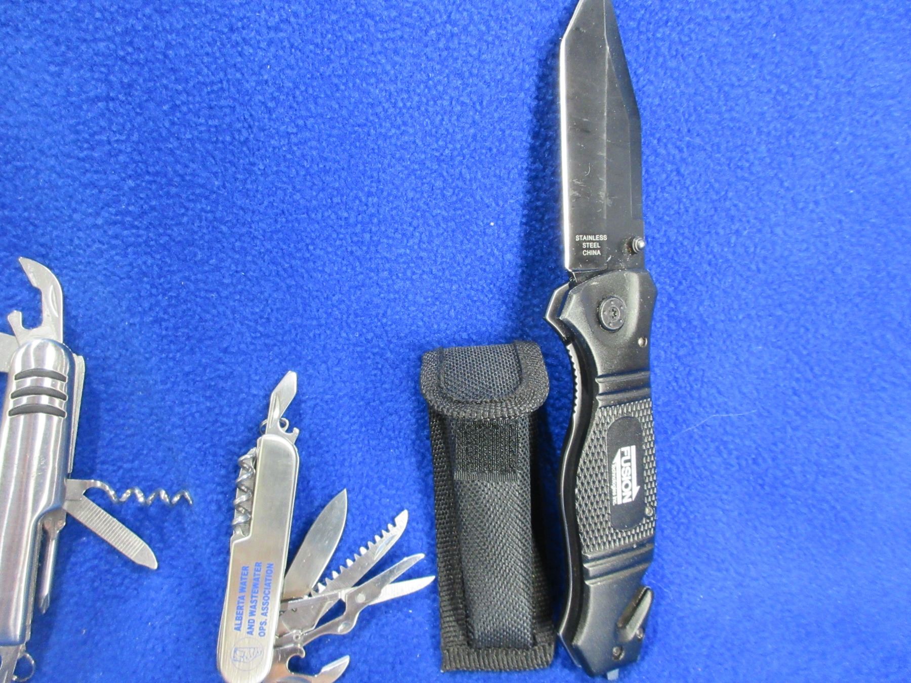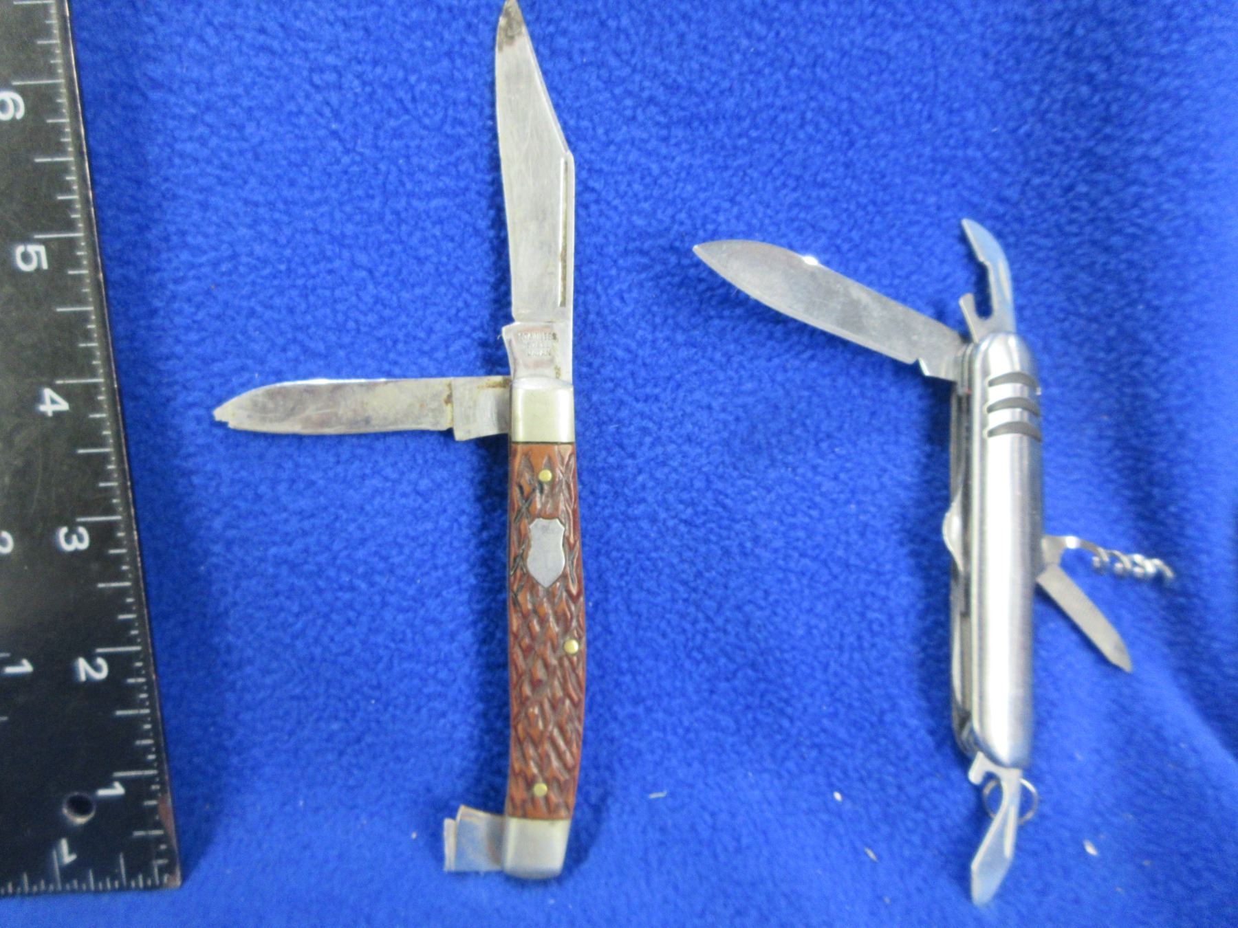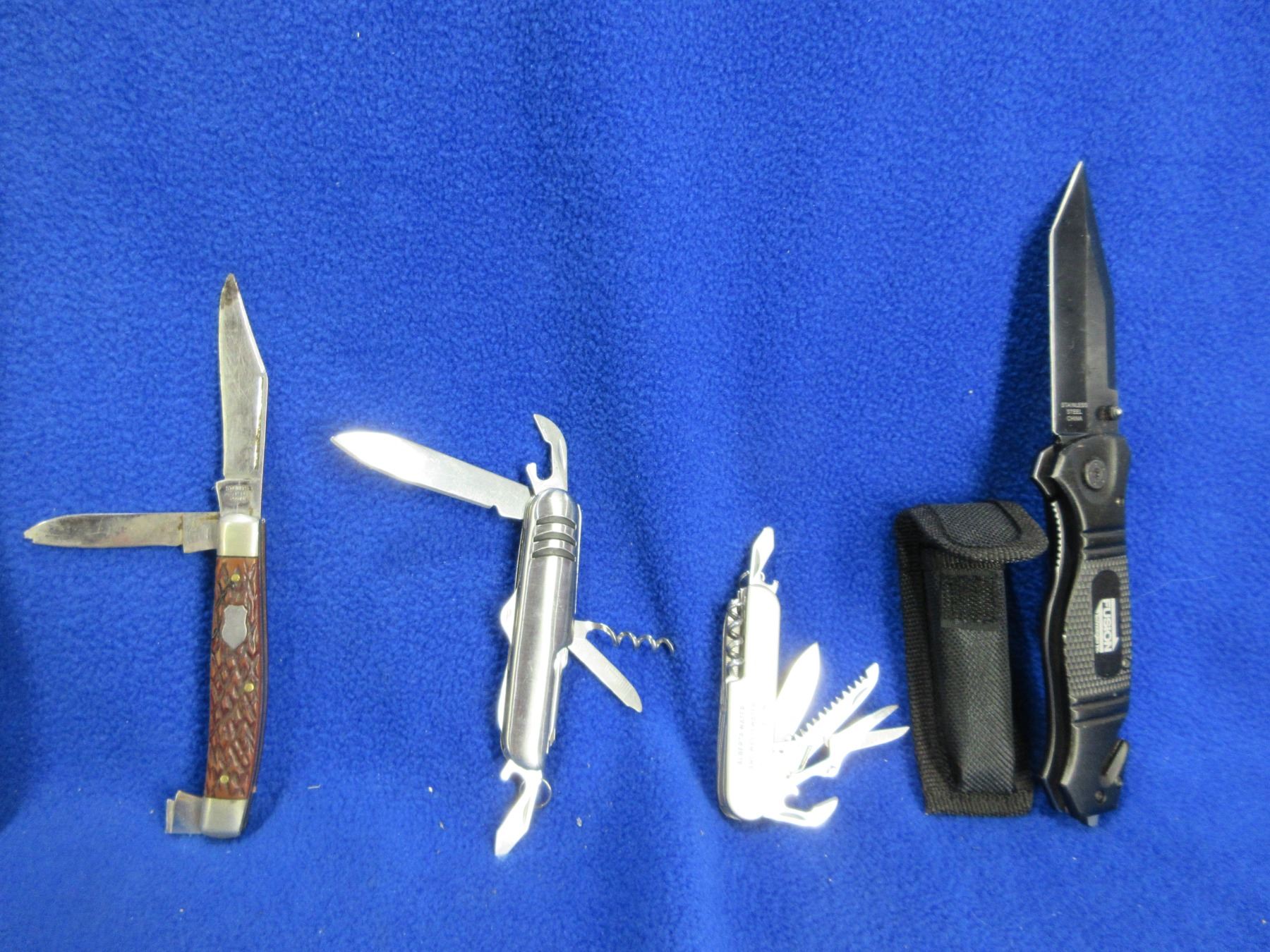 Lot 2331 4 Folding Pocket Knives - 2 Swiss Style, 1 Lock Blade, 1 Damaged