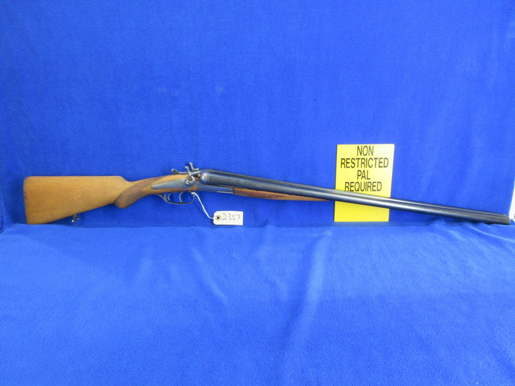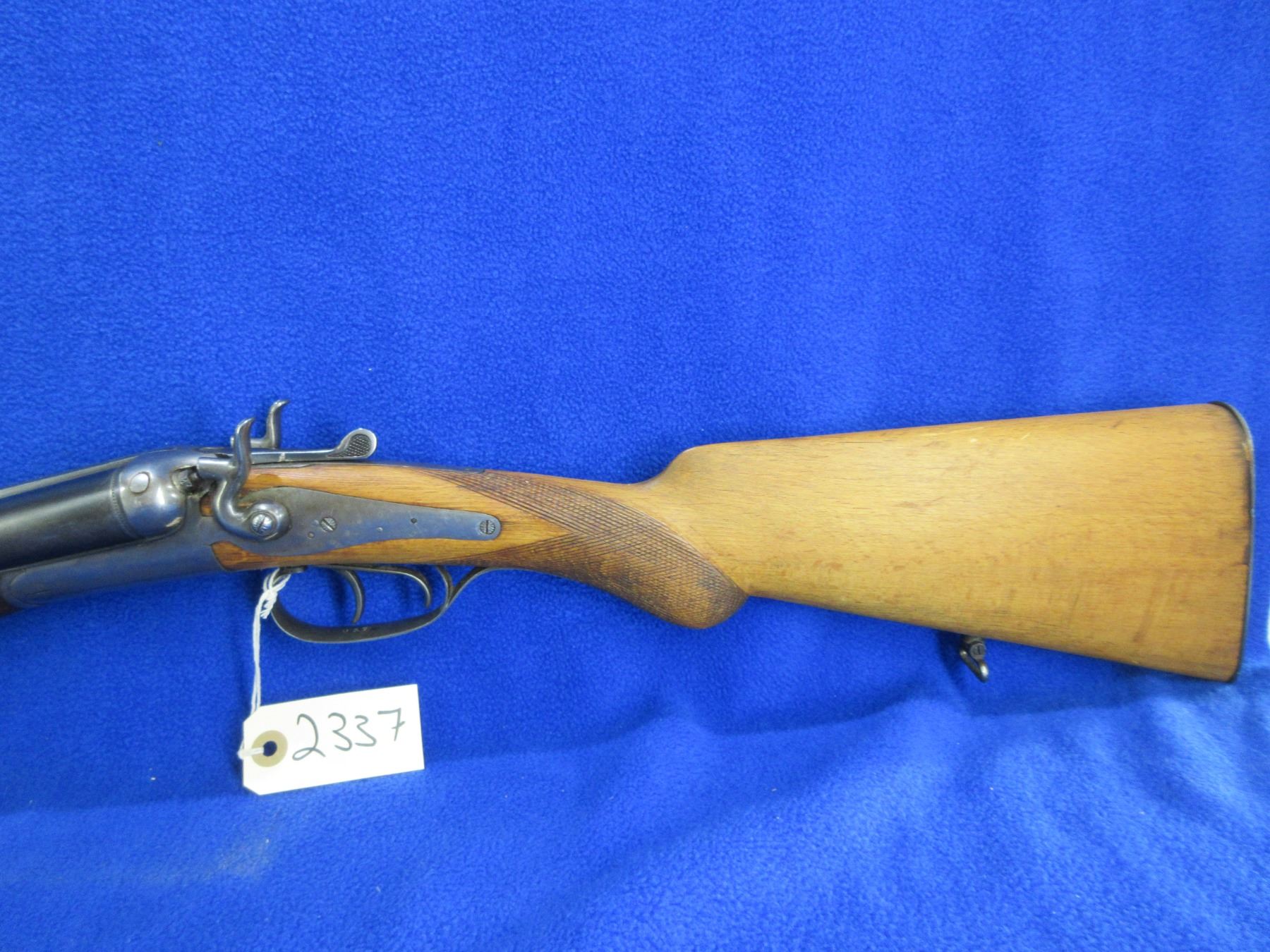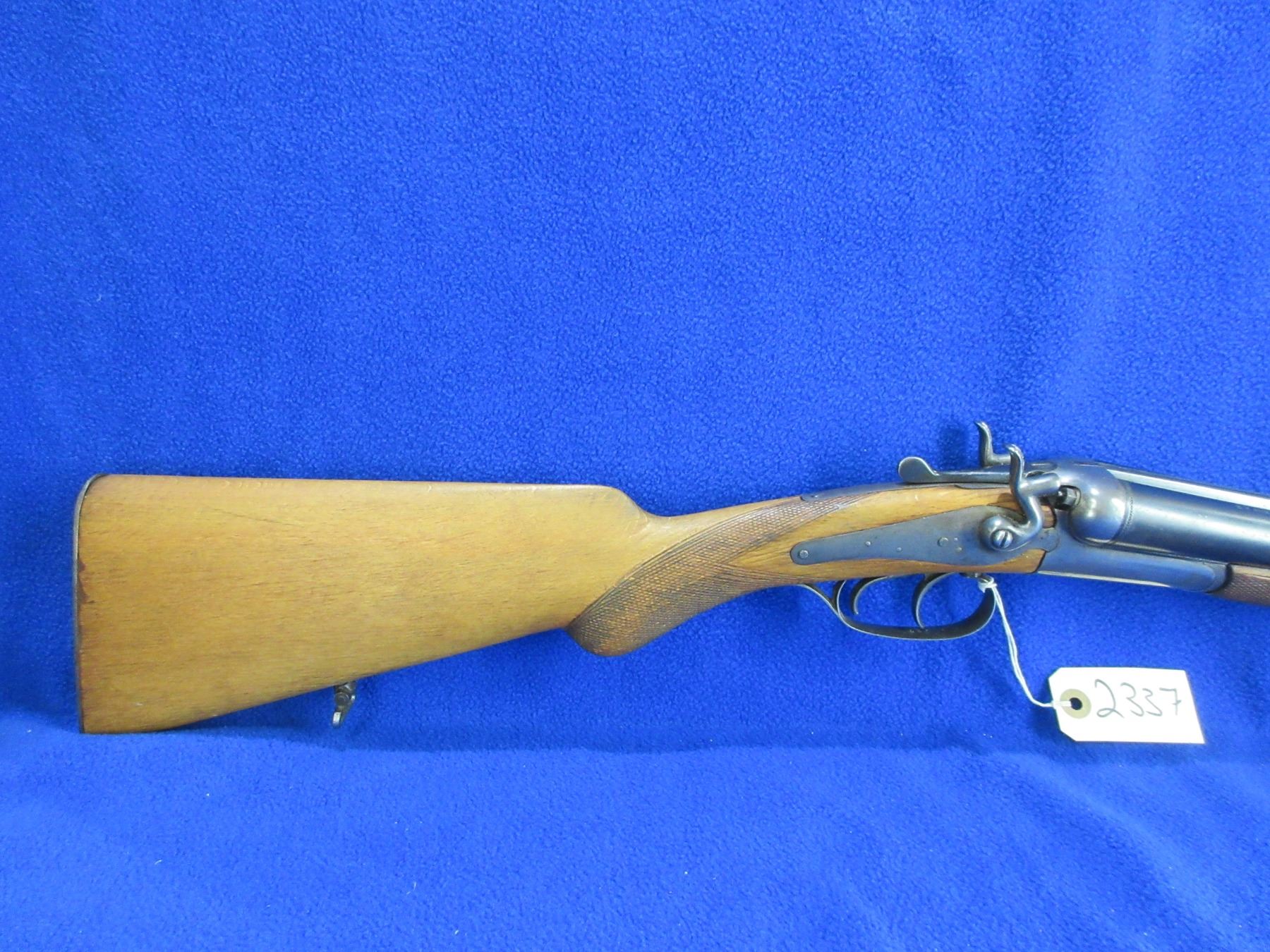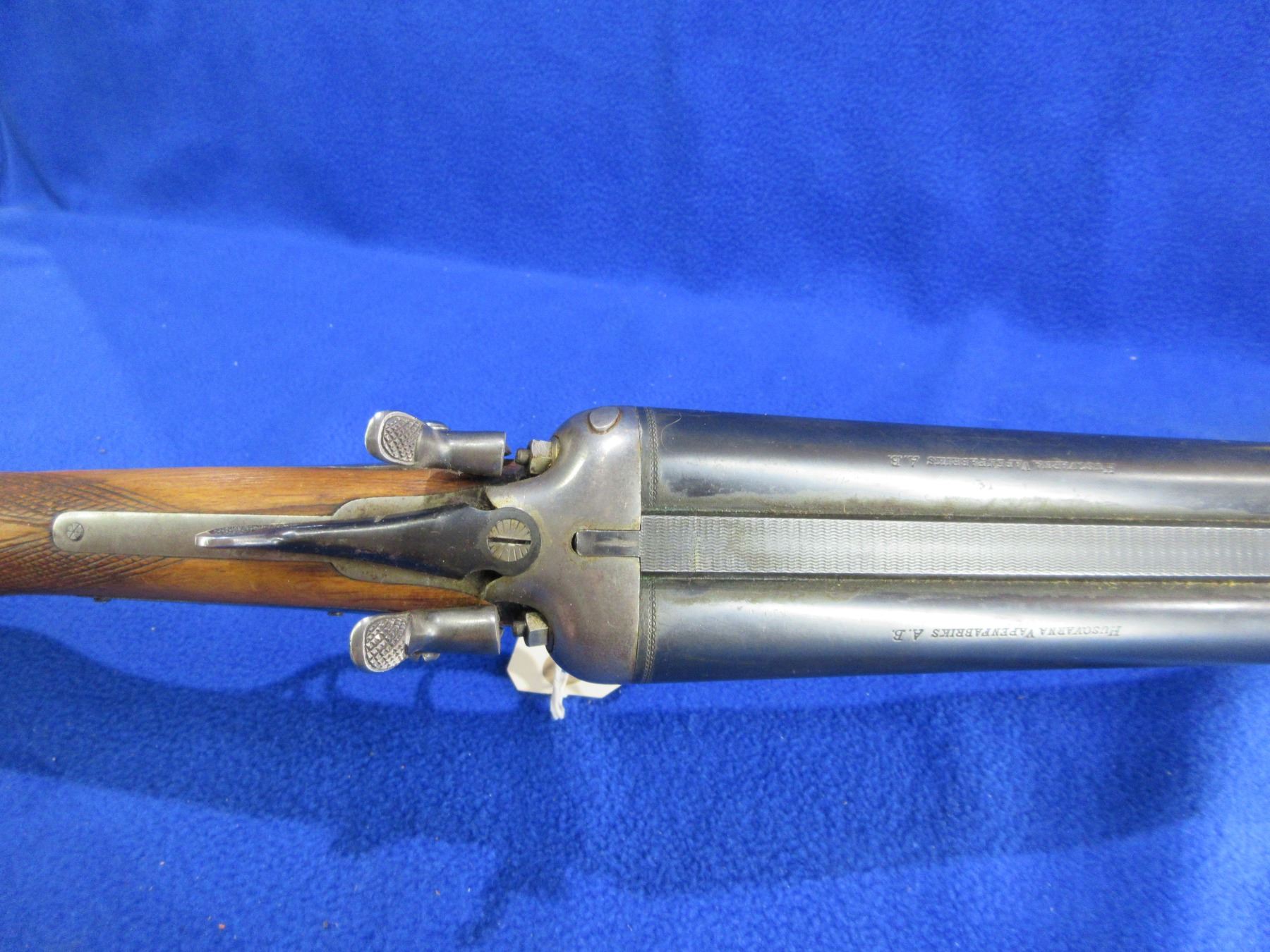 Non-Restricted - Husqvarna Vappenfabric in 12 Ga. 2 3/4" - This is a tip up SXS hammer shotgun, action is tight and appears to be in good working order. Barrels are 27 1/2"", bores are fair to good, bluing is fair to good, has bead front sight, stock is good with usage marks, length of pull is 14 1/2", forearm has a small crack at the front right side, metal butt plate good, comes with rear swivel, front swivel missing. Ser # 194037B