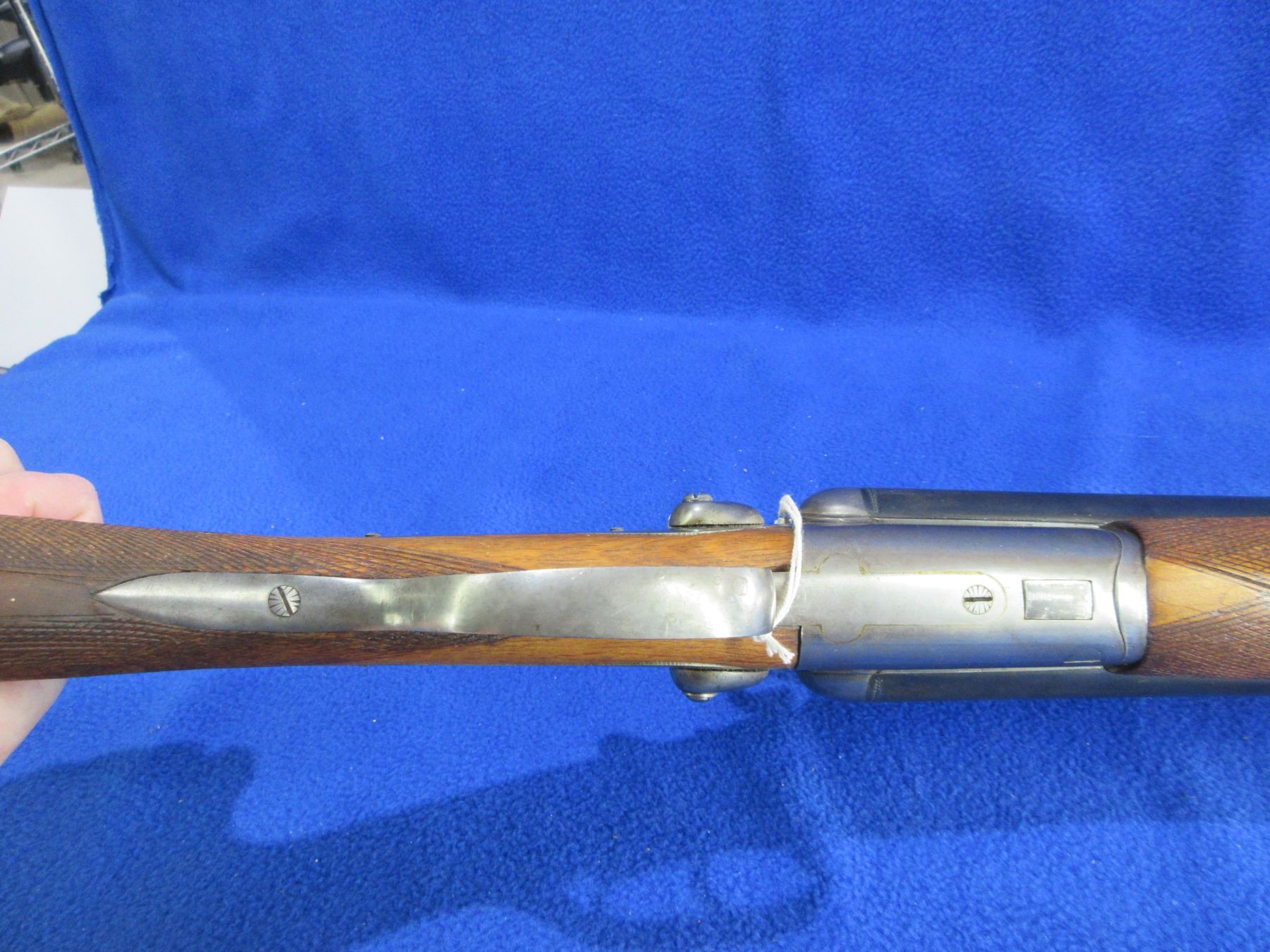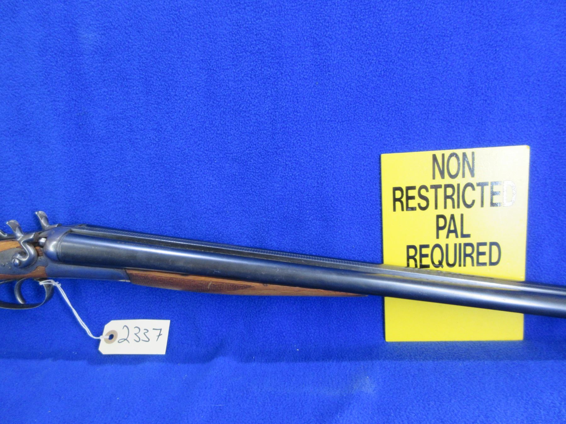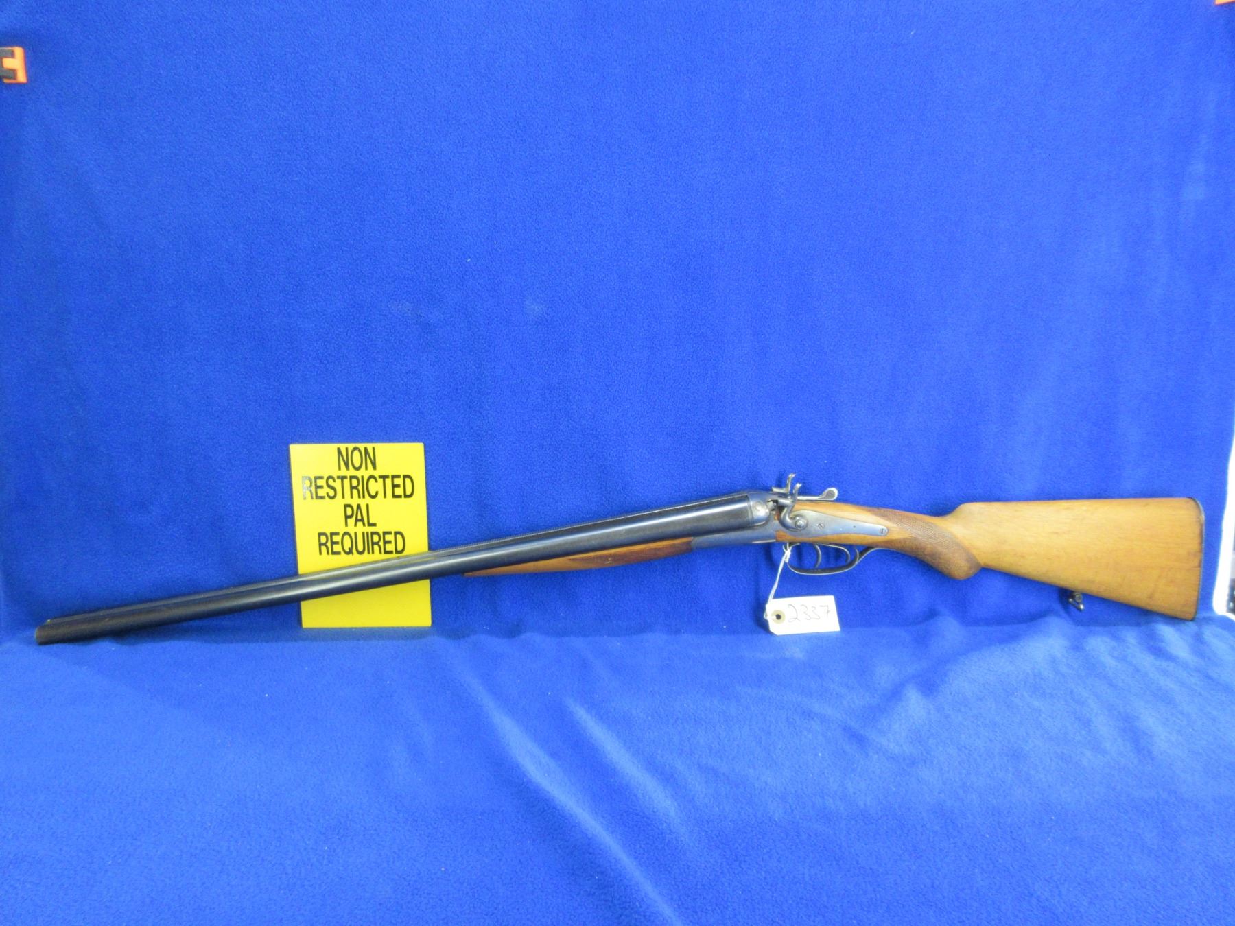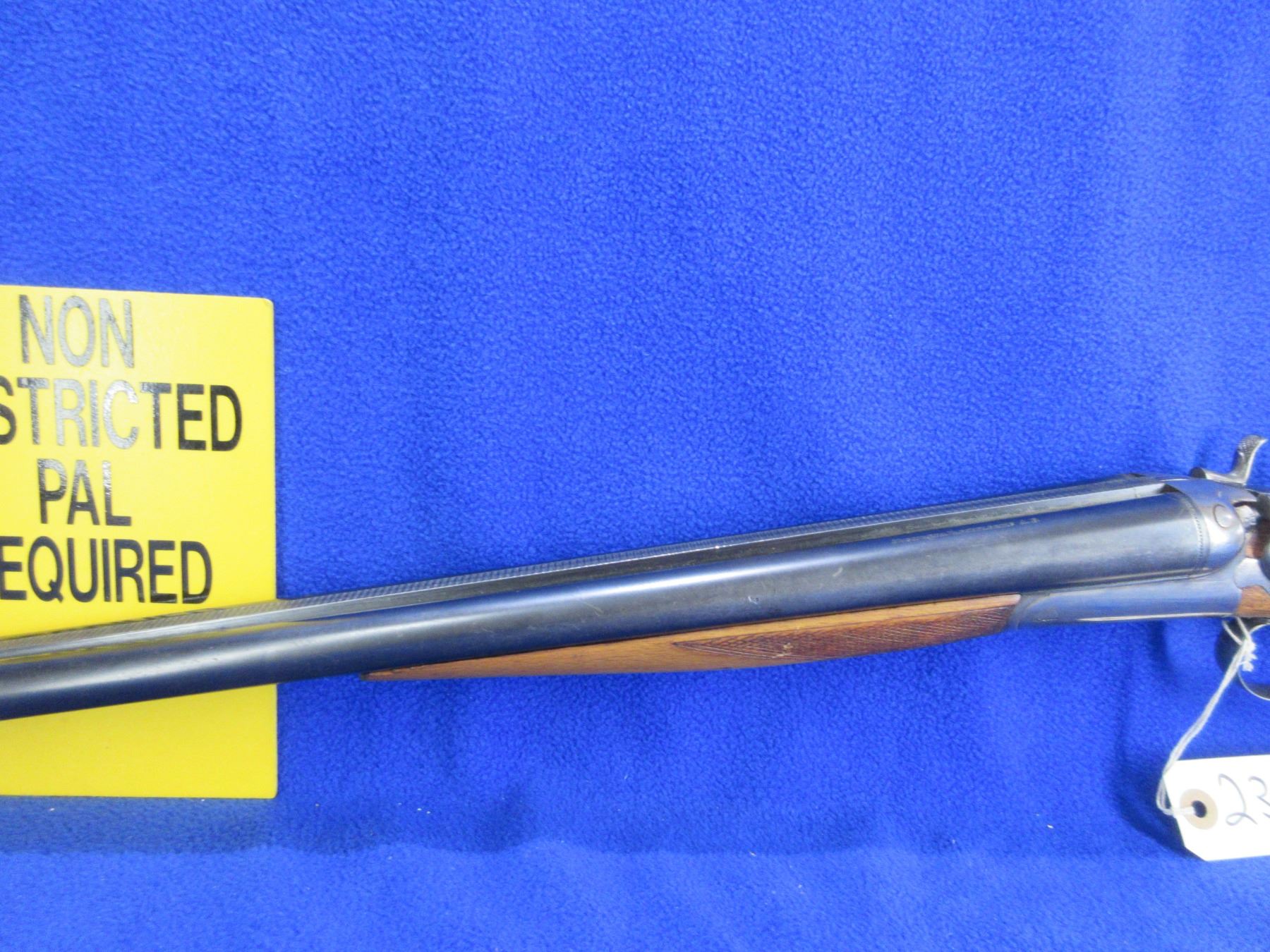 Non-Restricted - Husqvarna Vappenfabric in 12 Ga. 2 3/4" - This is a tip up SXS hammer shotgun, action is tight and appears to be in good working order. Barrels are 27 1/2"", bores are fair to good, bluing is fair to good, has bead front sight, stock is good with usage marks, length of pull is 14 1/2", forearm has a small crack at the front right side, metal butt plate good, comes with rear swivel, front swivel missing. Ser # 194037B