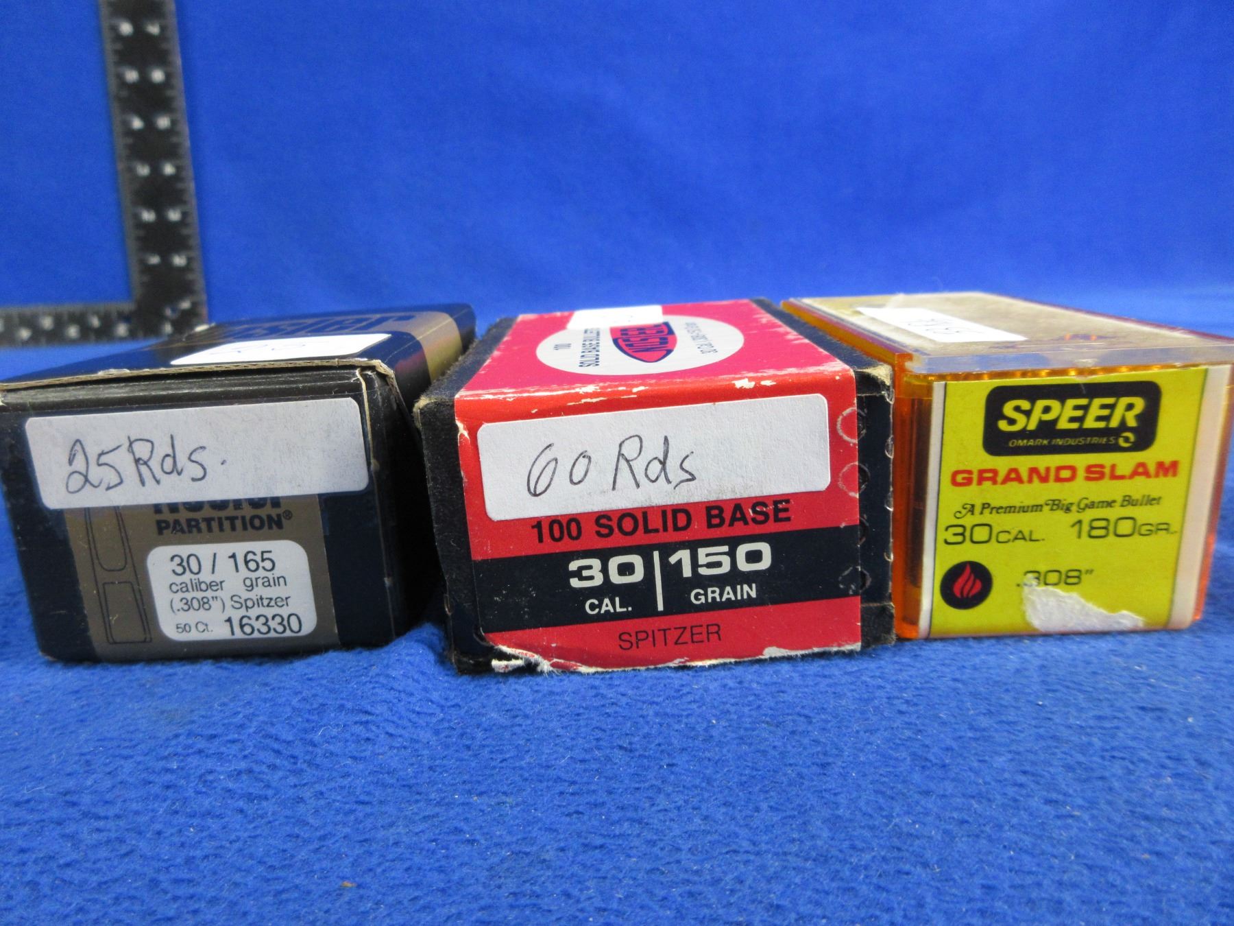 30 Cal. .308" Nosler and Speer Bullets - Box of 60 (Nosler 150gr Spitzer SB), Box of 25 (Nosler 165gr Spitzer), Box of 33 (Speer 180gr Grand Slam)
