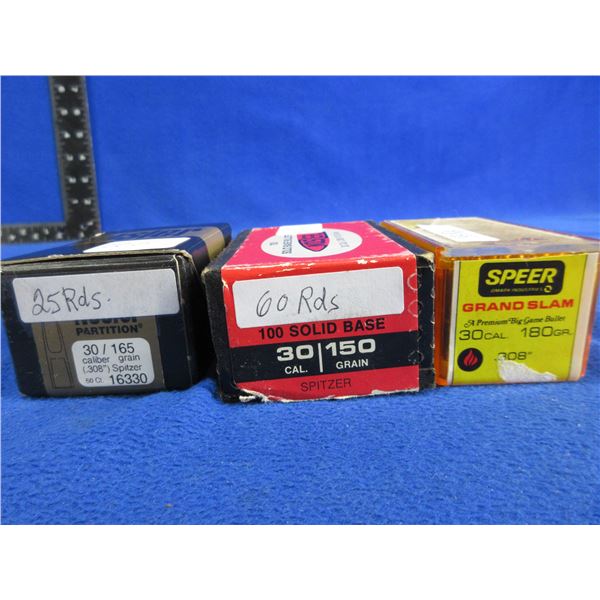 30 Cal. .308" Nosler and Speer Bullets - Box of 60 (Nosler 150gr Spitzer SB), Box of 25 (Nosler 165gr Spitzer), Box of 33 (Speer 180gr Grand Slam)