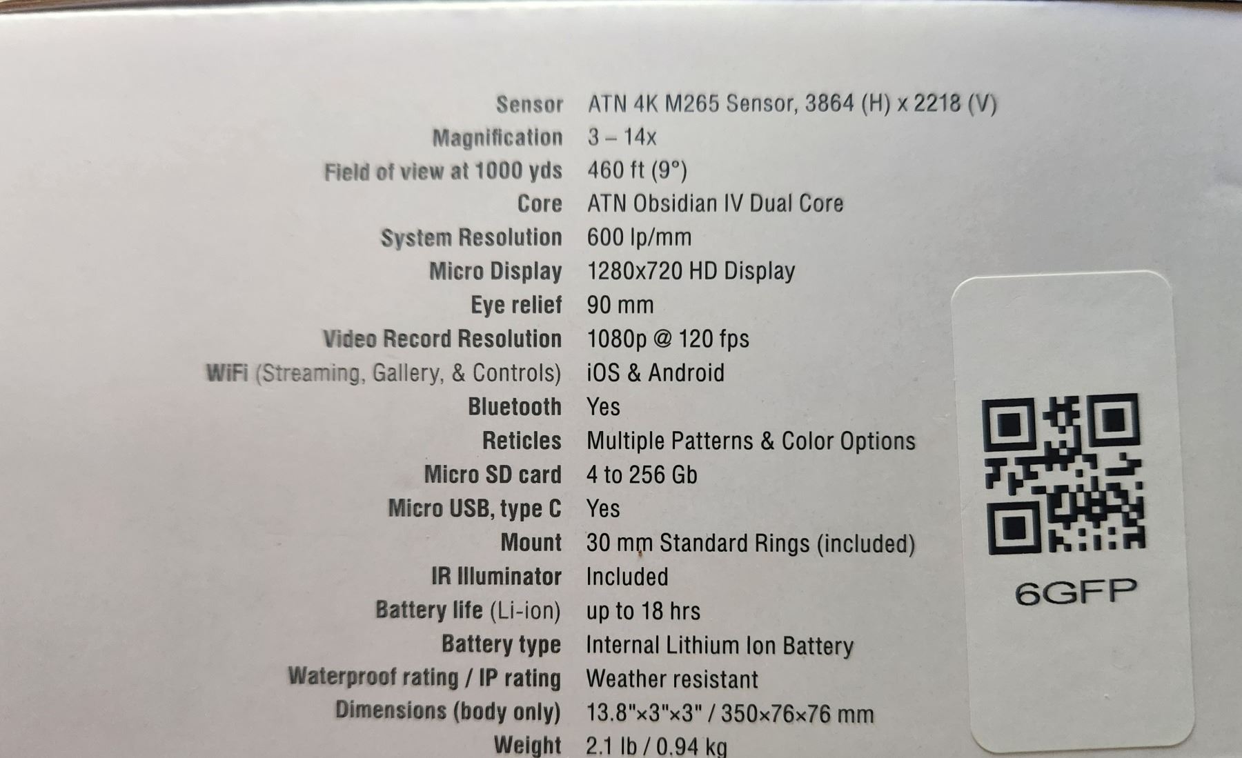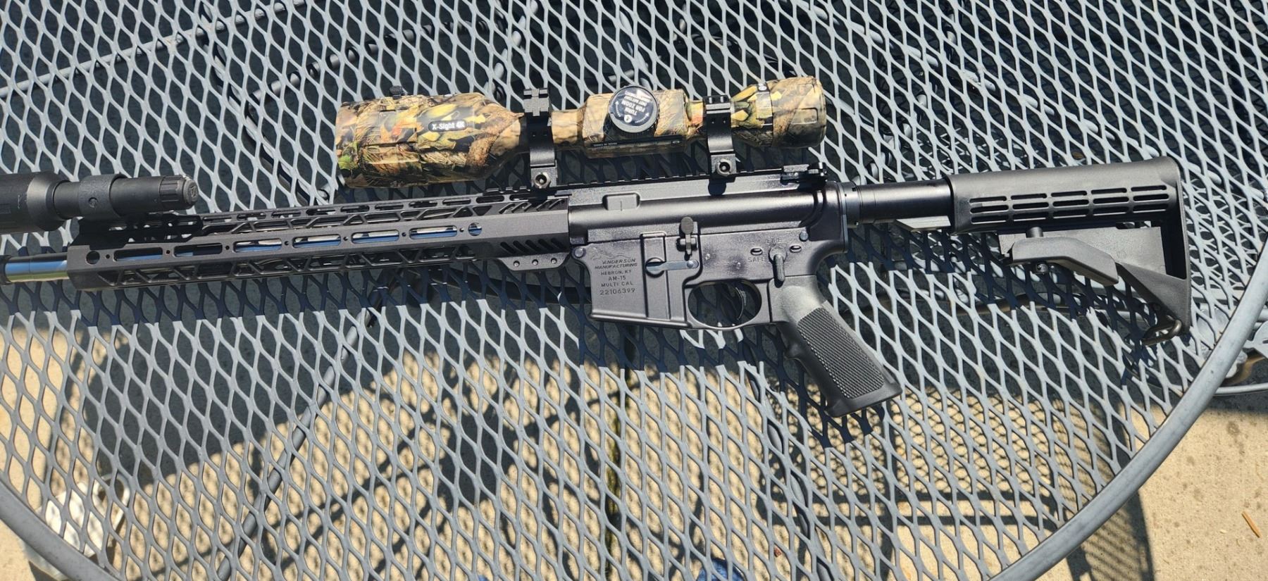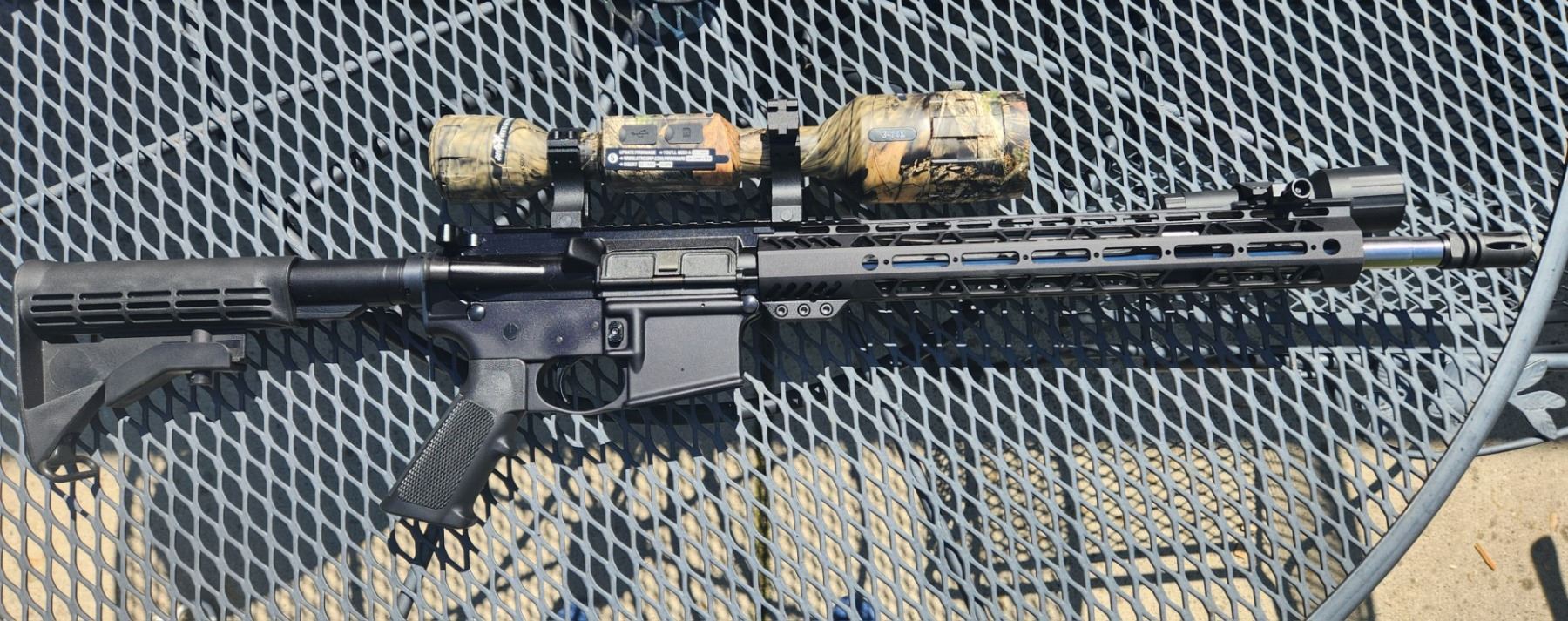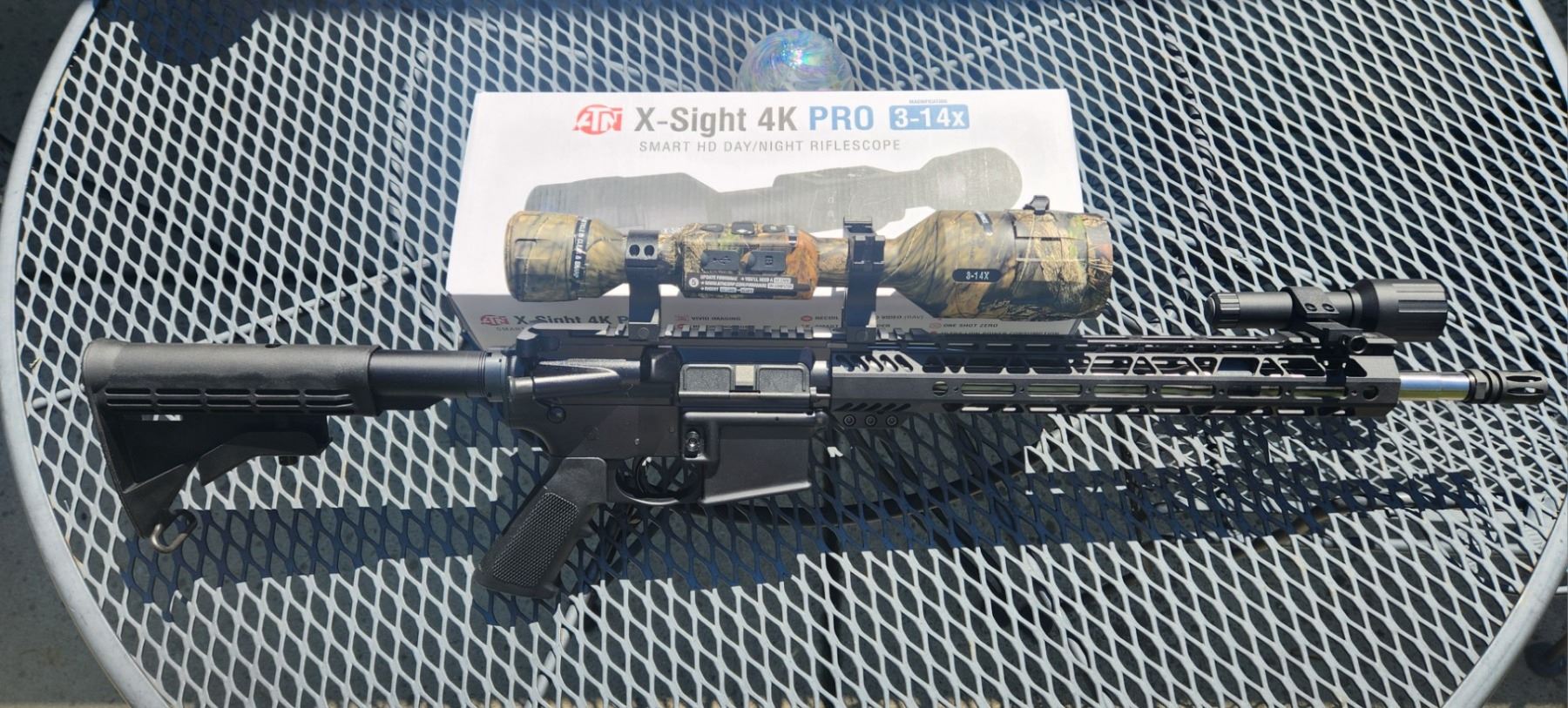 M4 style AR, 5.56 with 1/7 twist, stainless steel barrel, light weight M-lok with an ATN X-Sight 4K PRO 3-14X Smart HD Day/Night Scope. The scope has Recoil Activated Video recording, Smart Range Finder, up to 18-hour battery life, 1080 screen, Ballistic Calculator, store multiple profiles so it is easy to switch between rifles. And you may attend free, in person, online classes for learning how best to use the scope.