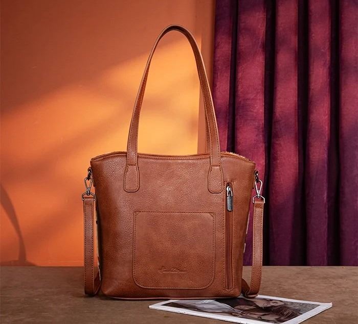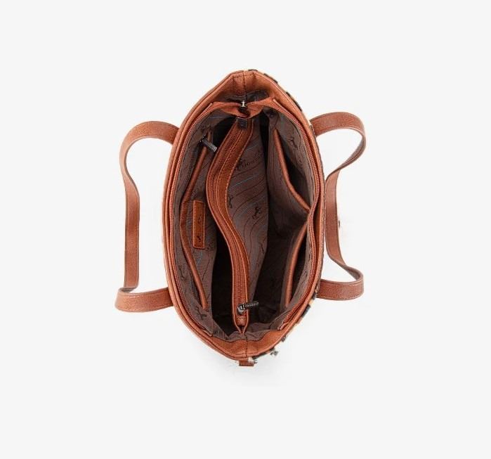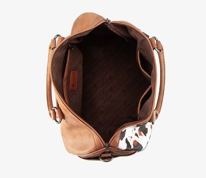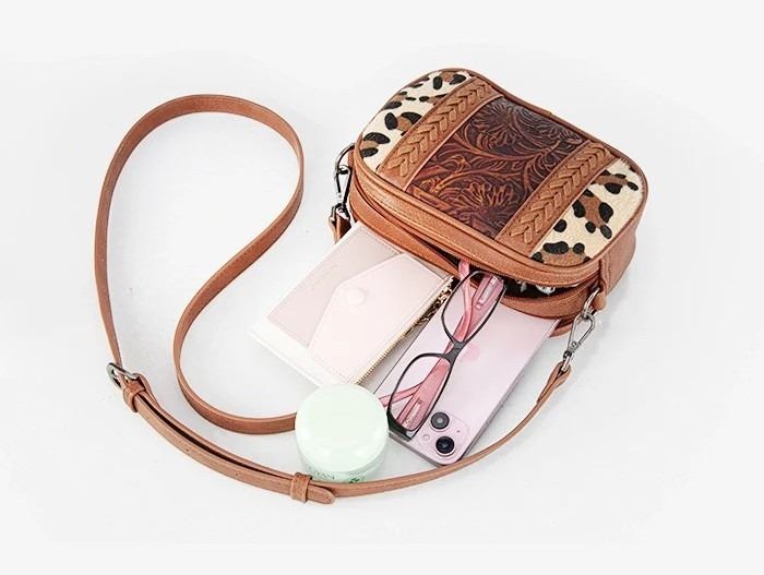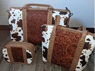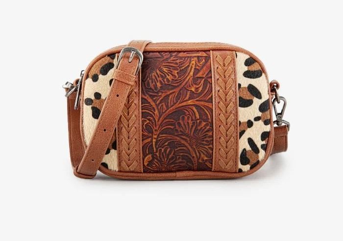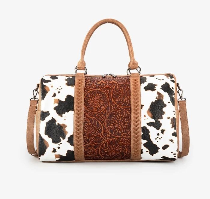Montana West Floral Tooled Cow Print Duffle Bag, Floral Tooled Concealed Carry Shoulder Bag, and Tooled Whipstitch Crossbody Bag. Duffle: Made of vegan leather, Floral tooled with hand coloring on the front, Whipstitch detail, Cow Print pattern, Interior padded compartment and zipper pocket, Top double leather handle(Drop: 7"), A trolley sleeve and a zippered pocket on the weekender bag's back, Detachable and adjustable shoulder strap included (Drop: 23"-28"), 18.5"(L) x 10"(W) x 15"(H). Concealed Carry Shoulder Bag: Vegan Leather Material: Crafted from premium vegan leather for a cruelty-free, eco-conscious design. Artisanal Floral Craftsmanship: Features hand-tooled floral patterns with meticulous hand coloring and whipstitch detailing on the front. Edgy Accents: Accented with antique silver studs for a bold, vintage-inspired aesthetic. Dual-Sided Leopard Print: Vibrant leopard-print fluff and printed designs adorn both sides of the tote crossbody bag. Secure Closure & Organization: Top zipper closure ensures safety, while interior zip pockets and compartments keep essentials neatly stored. Concealed Carry Feature: Includes a discreet open pocket and zippered pocket on the back for secure, hidden gun storage. Versatile Carrying Options: Equipped with a 10" top handle and adjustable, detachable shoulder strap (26"-29" drop) for hands-free convenience. Compact & Spacious Design: Measures 13"L x 4.5"W x 11.5"H with a large interior capacity, balancing portability and ample storage. Tooled Whipstitch Crossbody Bag: Made of vegan leather, Floral tooled on the front, Whipstitch detail, Top dual zipper closure, Interior zip pocket and card slots, A zipper pocket on the back, Adjustable and detachable shoulder strap (Drop: 23"-27"), 8"(L) x 3"(W) x 6.5"(H), Interior Capacity: Small.