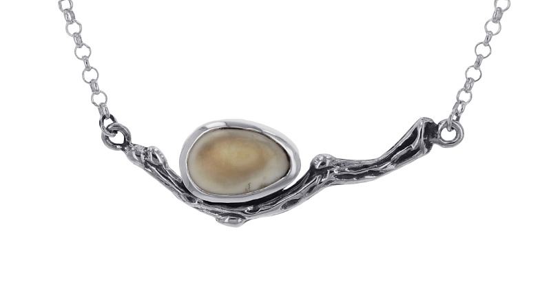 A twist on our twig style necklaces, this piece features a bezel set elk ivory set in sterling silver. Necklace measures 1.5" in width.