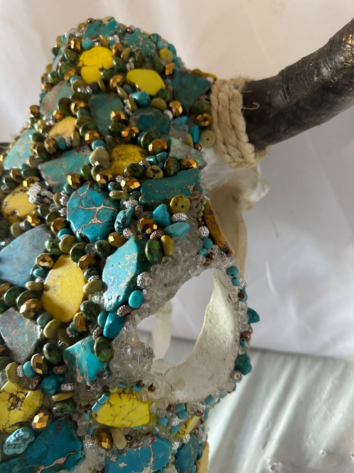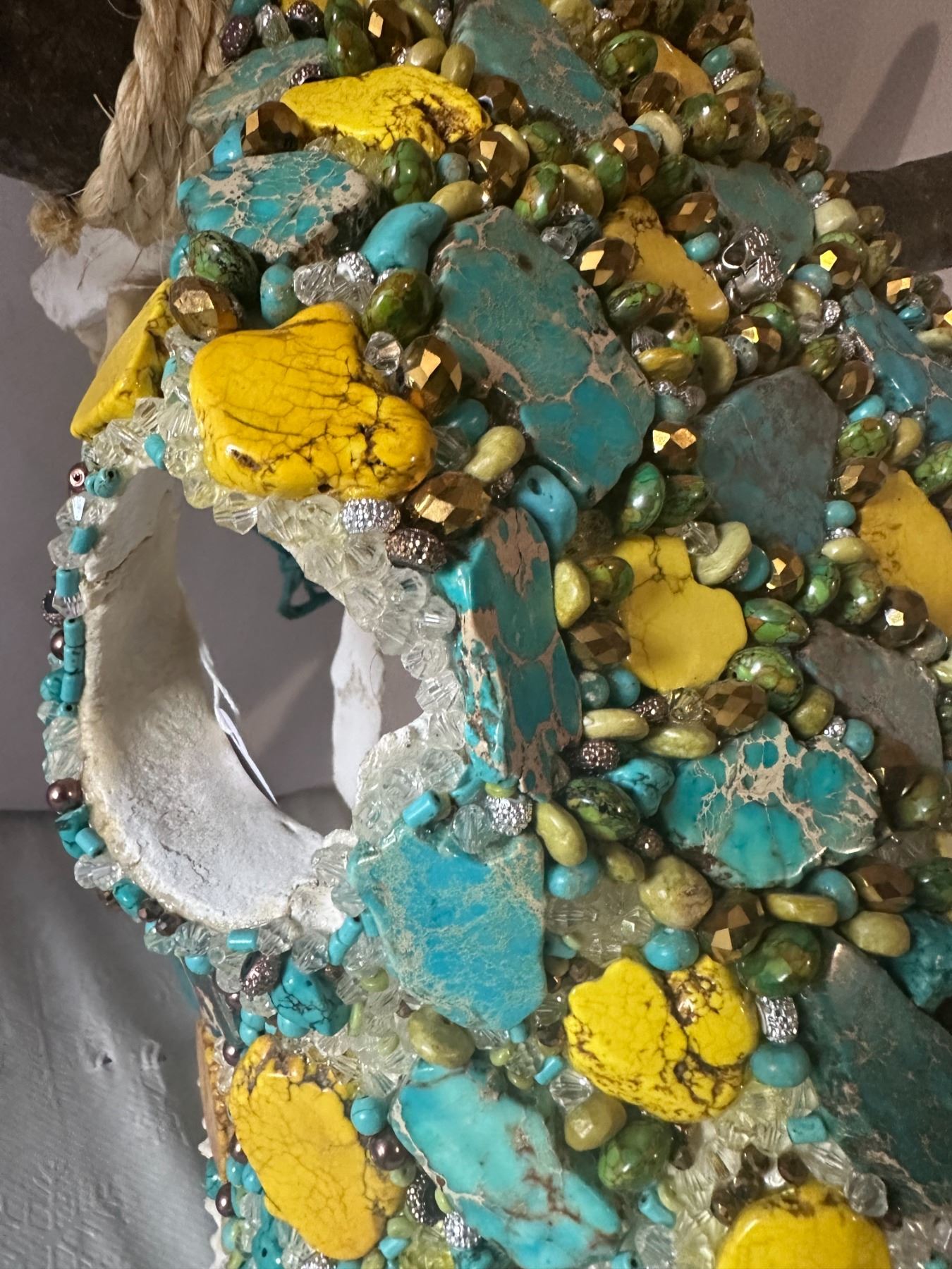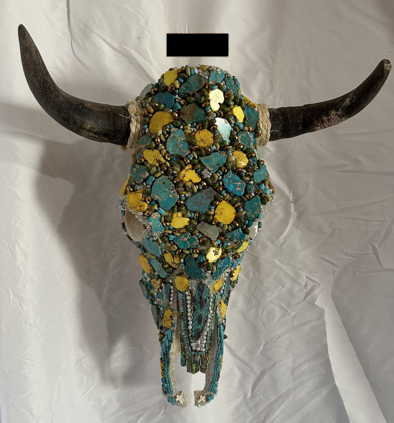 Unique and stunning, this beautifully adorned Steer skull, has been hand crafted and adorned with dozens of Genuine Turquoise cut Stones and Dyed yellow Howlite stones and accented with various smaller turquoise stones, various bead, rhinestones, crystal beads and other accents.