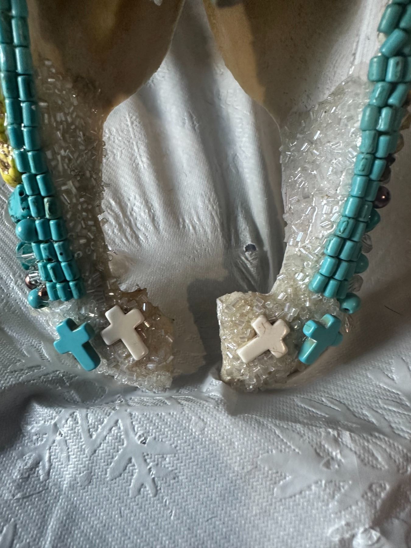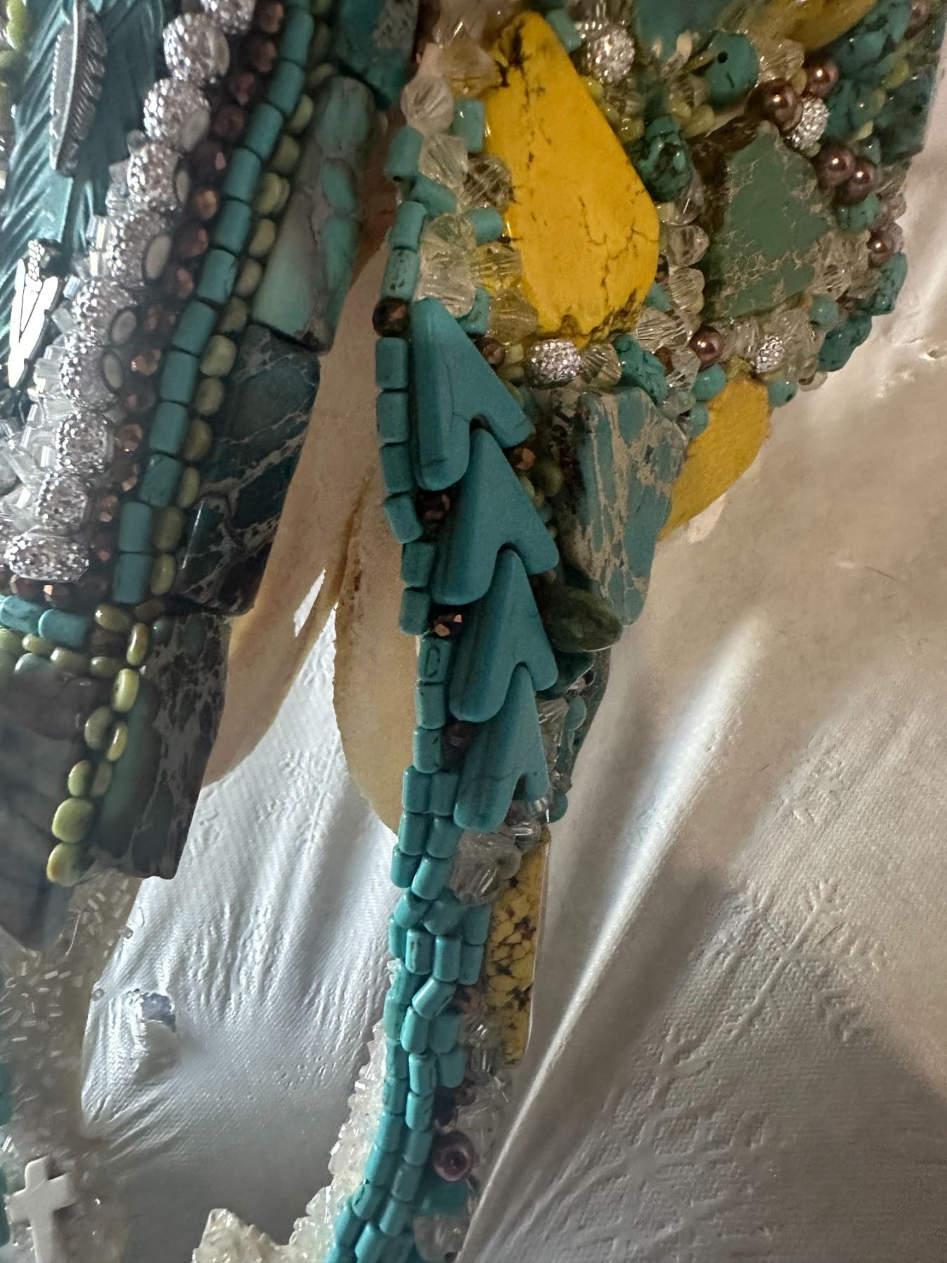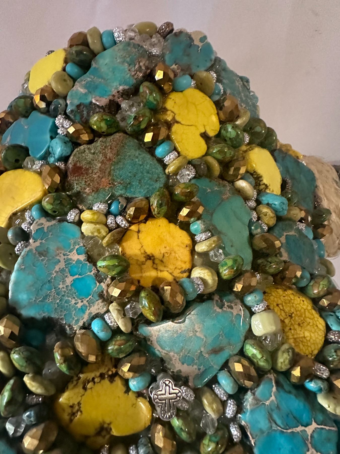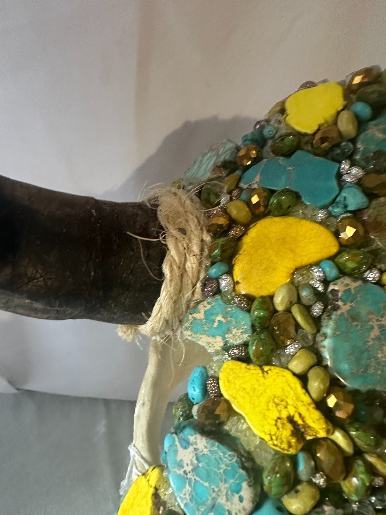 Unique and stunning, this beautifully adorned Steer skull, has been hand crafted and adorned with dozens of Genuine Turquoise cut Stones and Dyed yellow Howlite stones and accented with various smaller turquoise stones, various bead, rhinestones, crystal beads and other accents.
