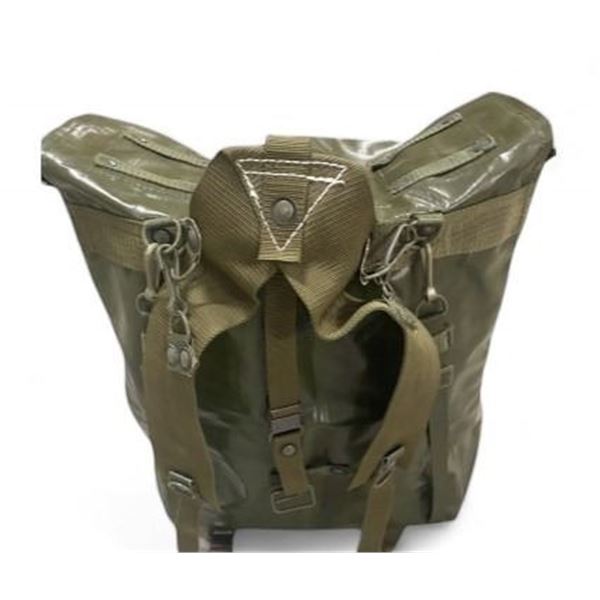Great water resistant bag from the Czech Army. This is a good general purpose bag that will keep out the rain. A large main compartment and 2 smaller ones will fit all of your gear. Two narrow shoulder straps are attached to the pack with spring hook attachments and comes with wider shoulder strap harness. These may have some marks or fading from storage but are in very good condition. Keep your kit dry and slap it in one of these.