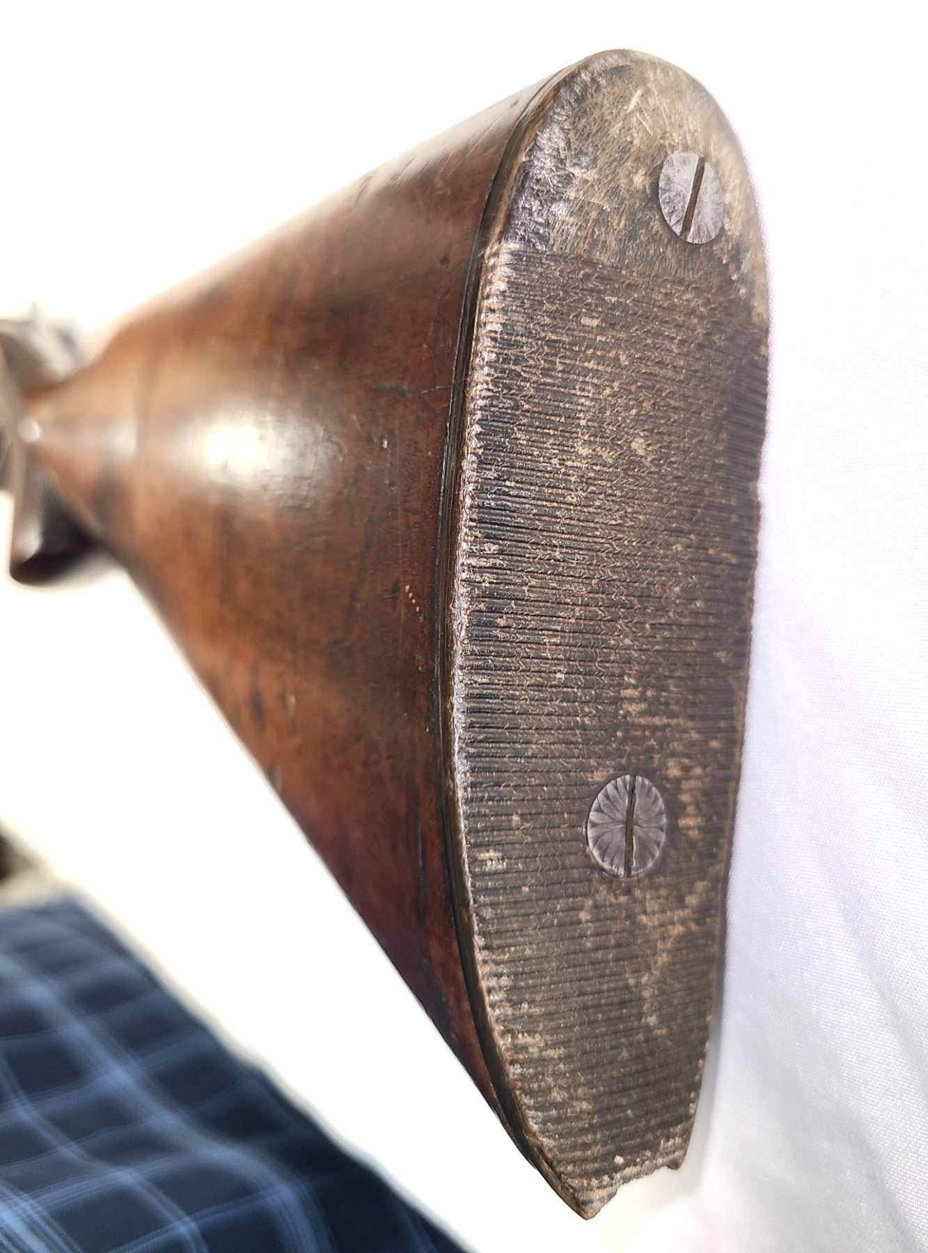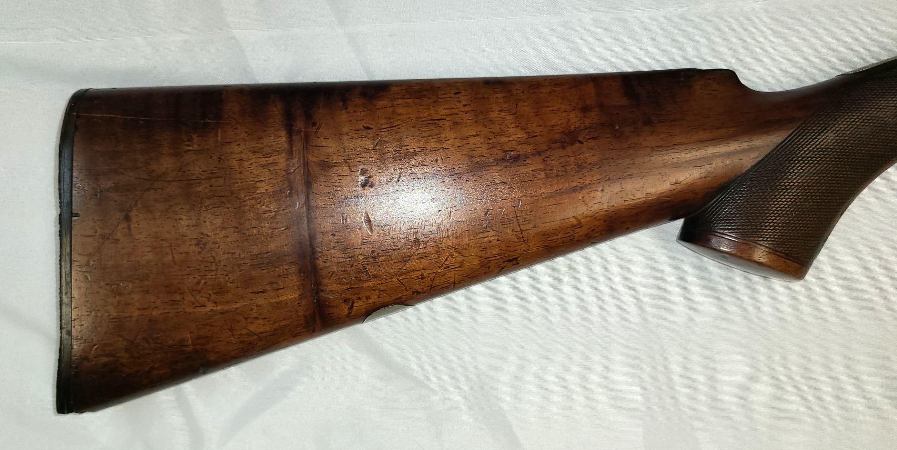 Real nice patterned wood stock with some dents and a small chip out of heel and