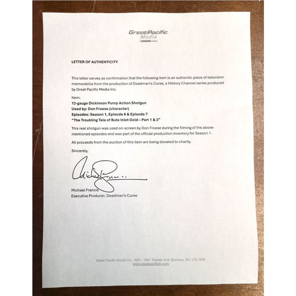 Dickinson Pump 12 ga Shotgun From TV Show Deadmans Curse COA