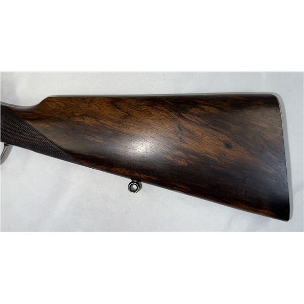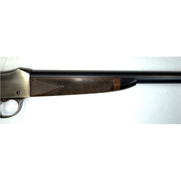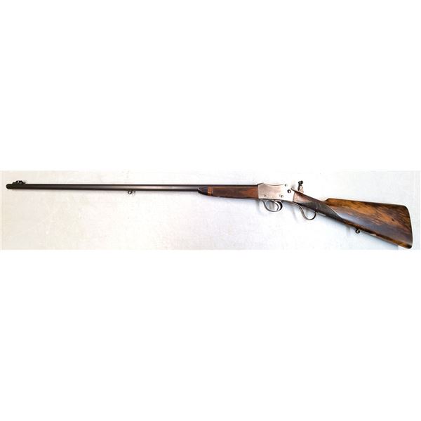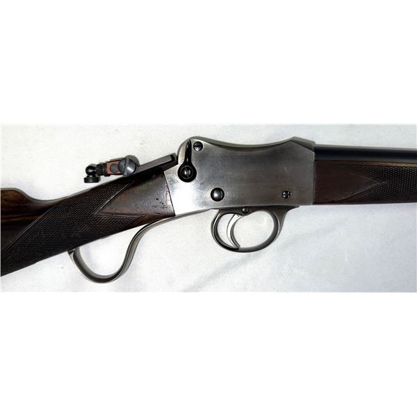 Its a 35 Cal (35-30) single shot 276 inch barrel set into fancy grain Wood.